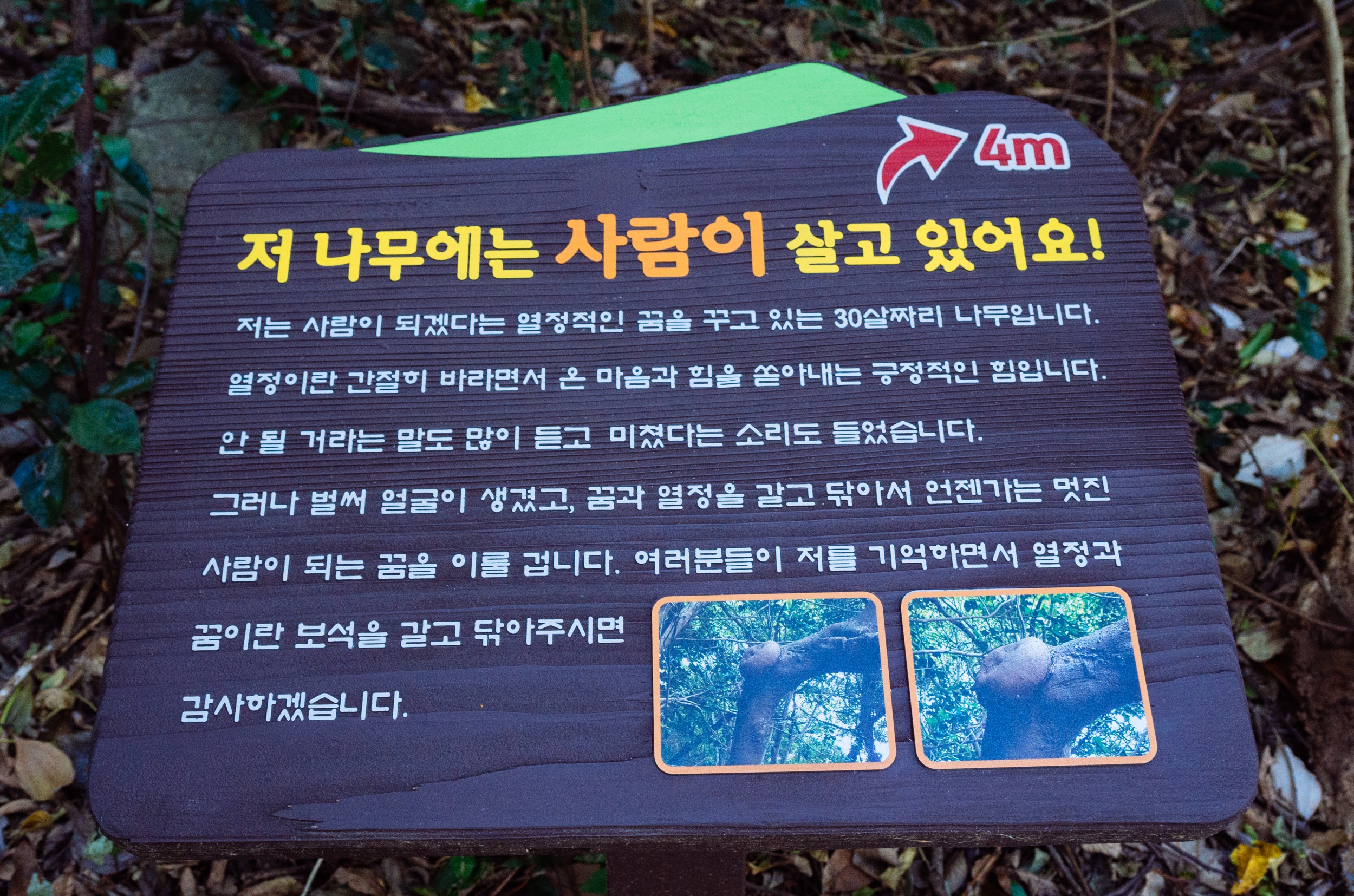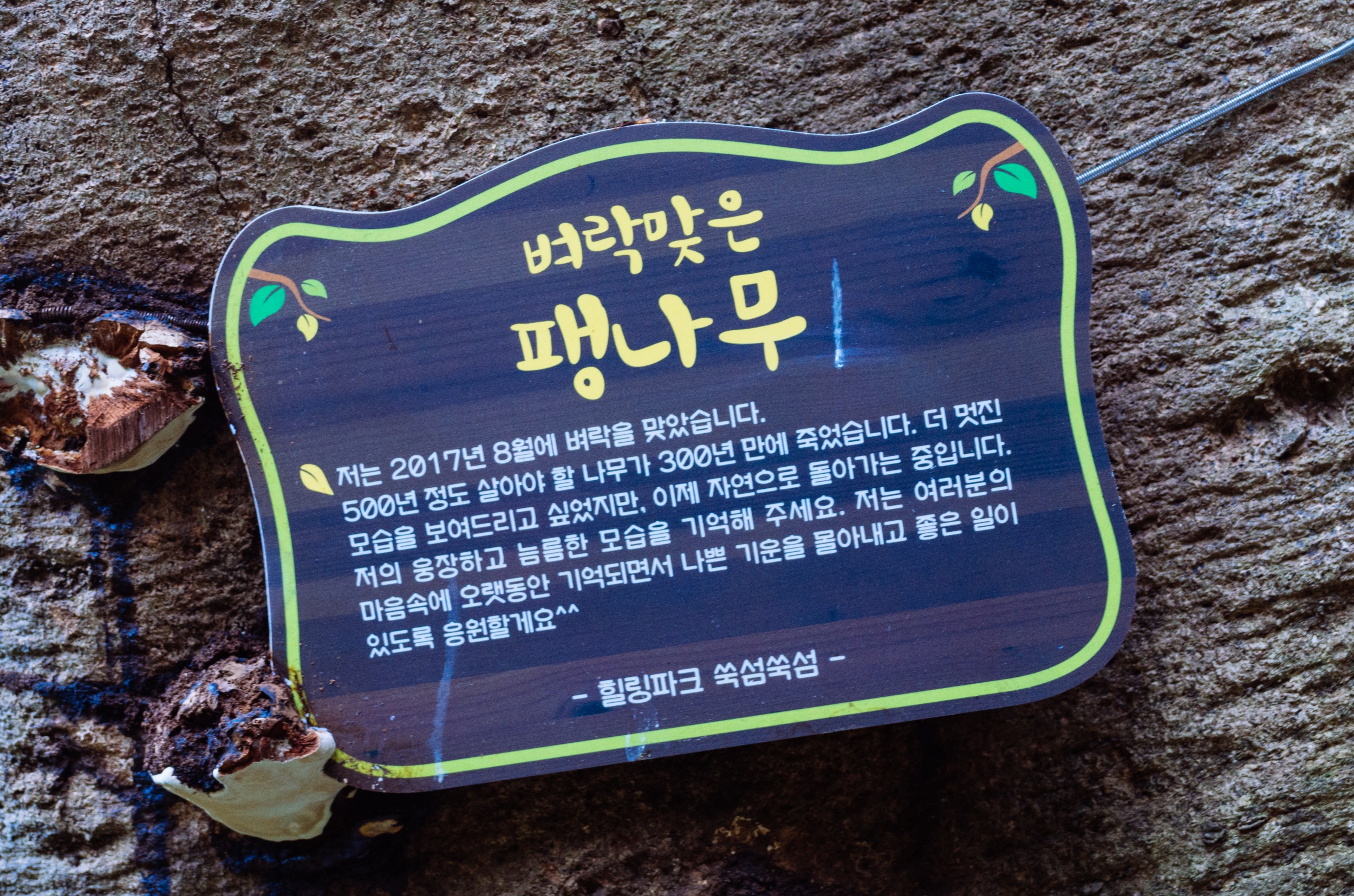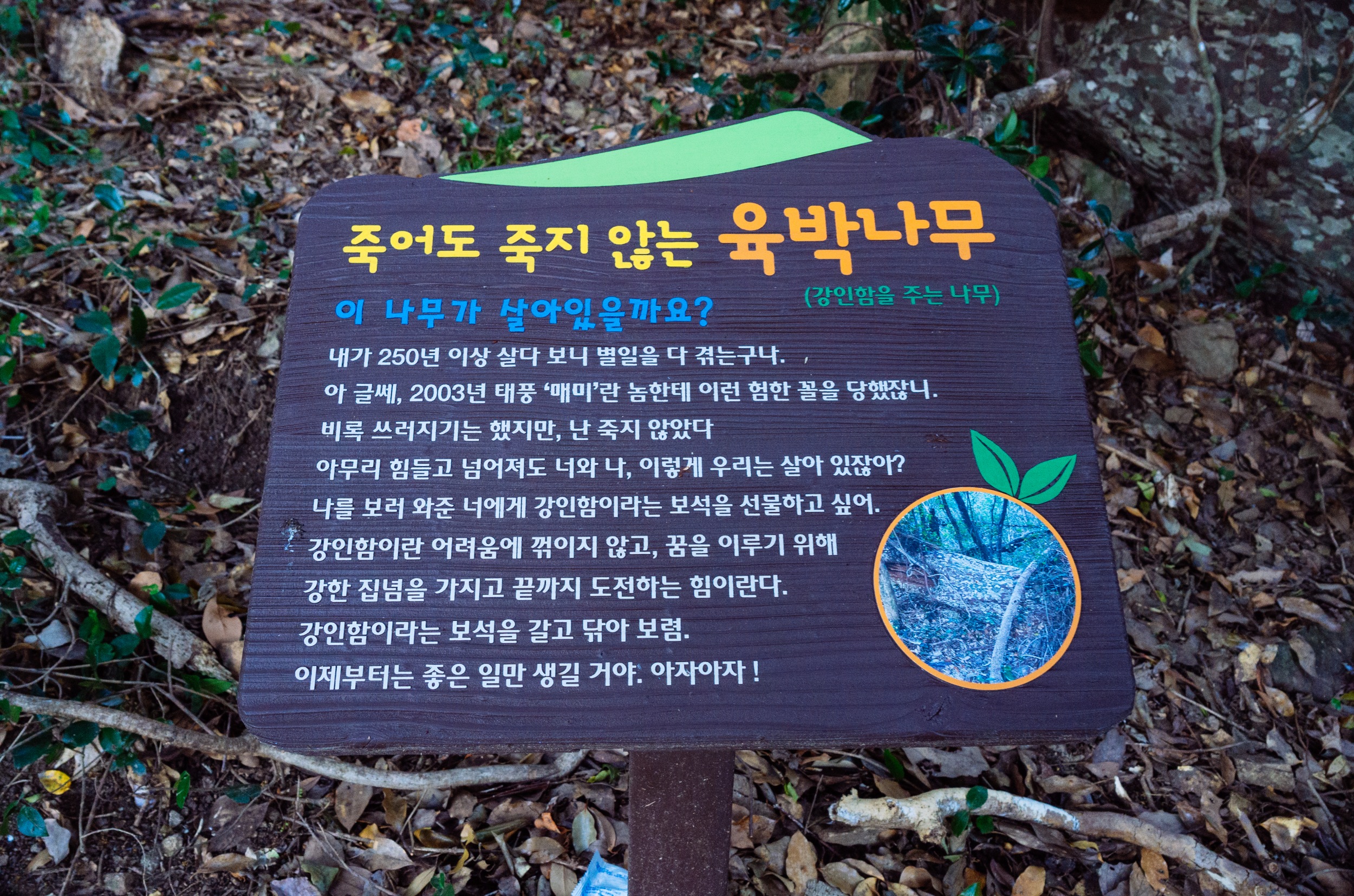 육박나무는 2003년 태풍 매미의 영향으로 쓰러져 있지만 죽지 않고 강한 집념으로 계속 생명을 이어가고 있습니다.