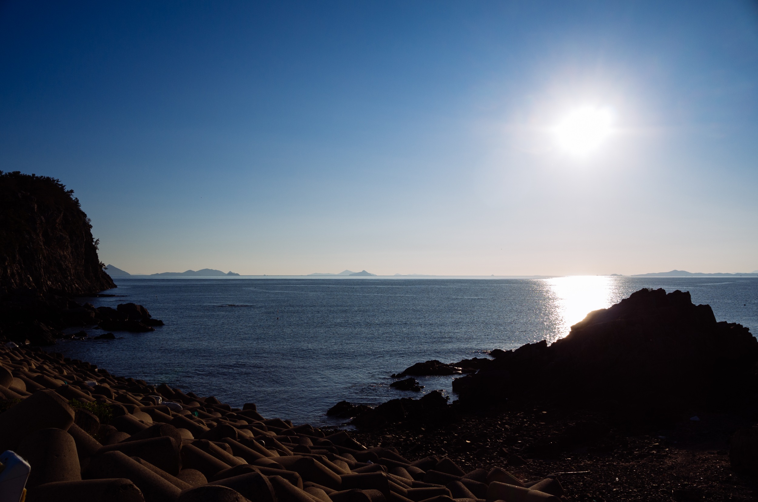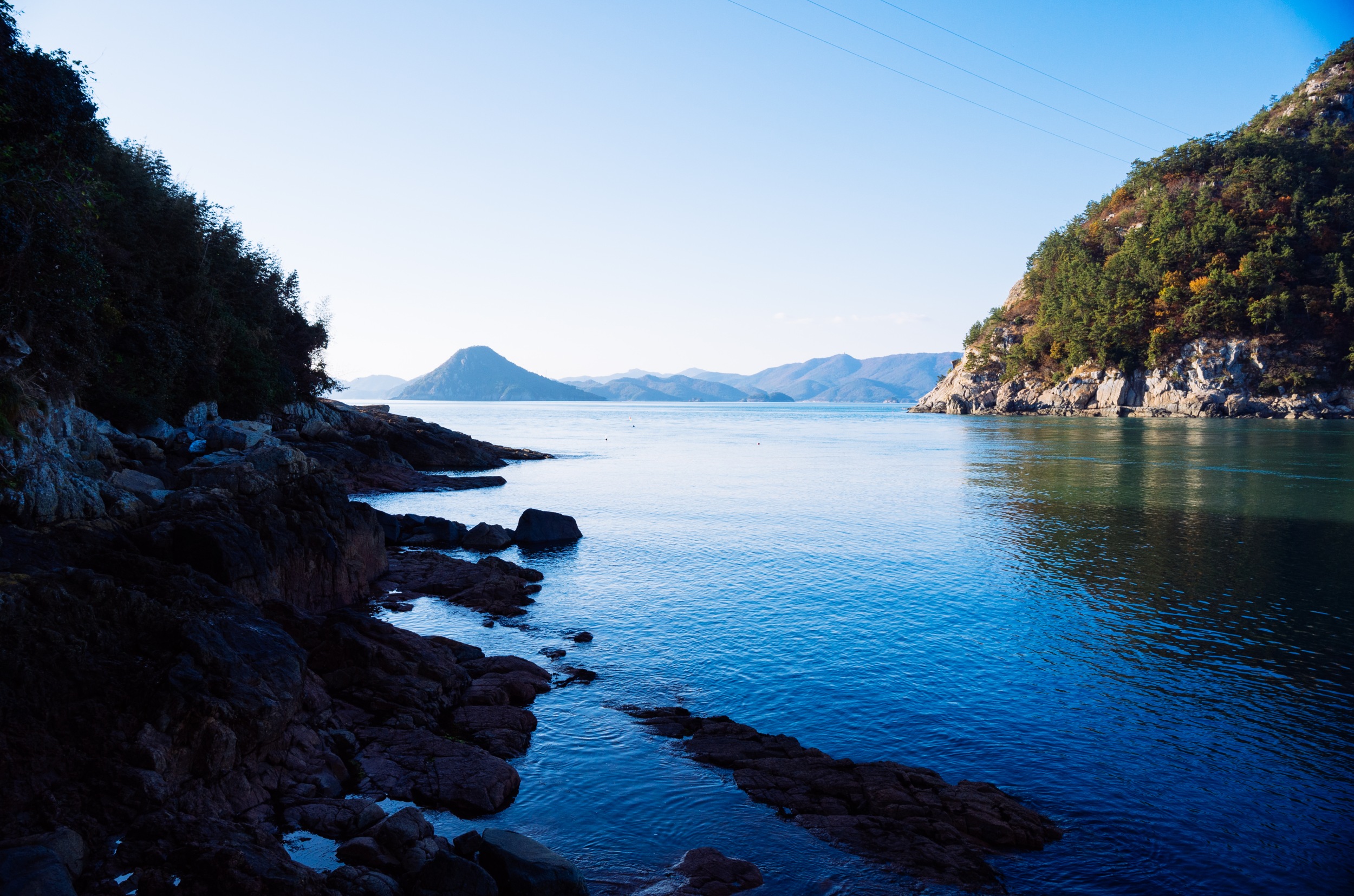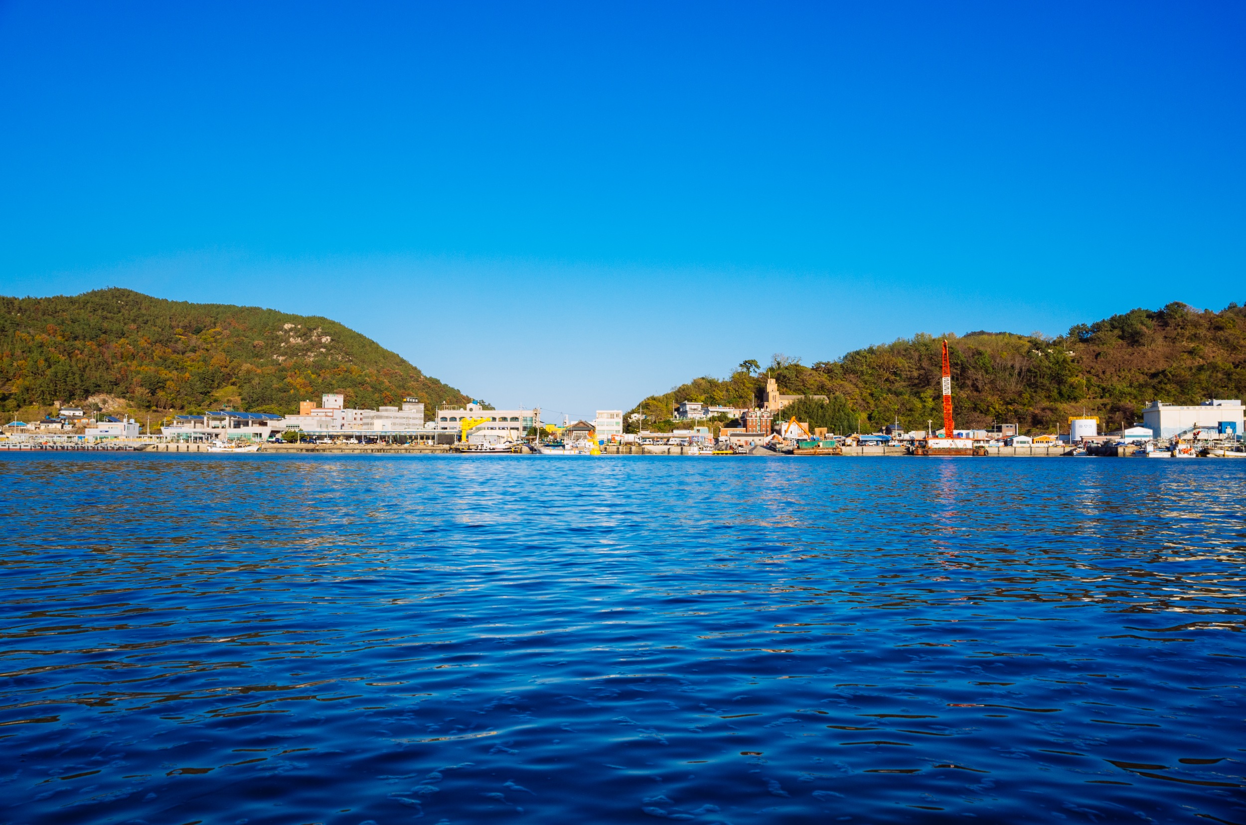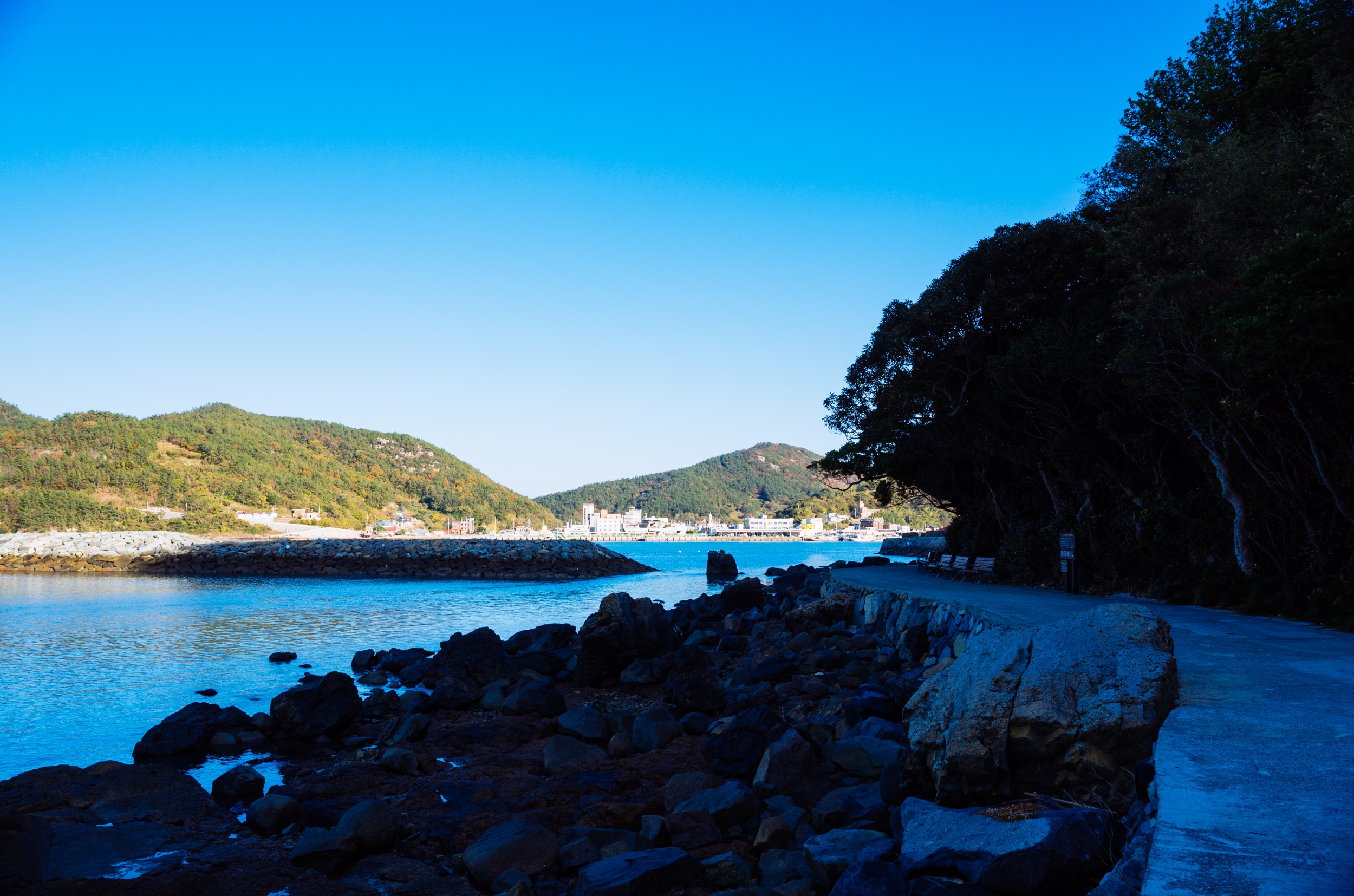 쑥섬에서 바라 본 나로도 항. 왼쪽은 내나로도 오른쪽은 외나로도