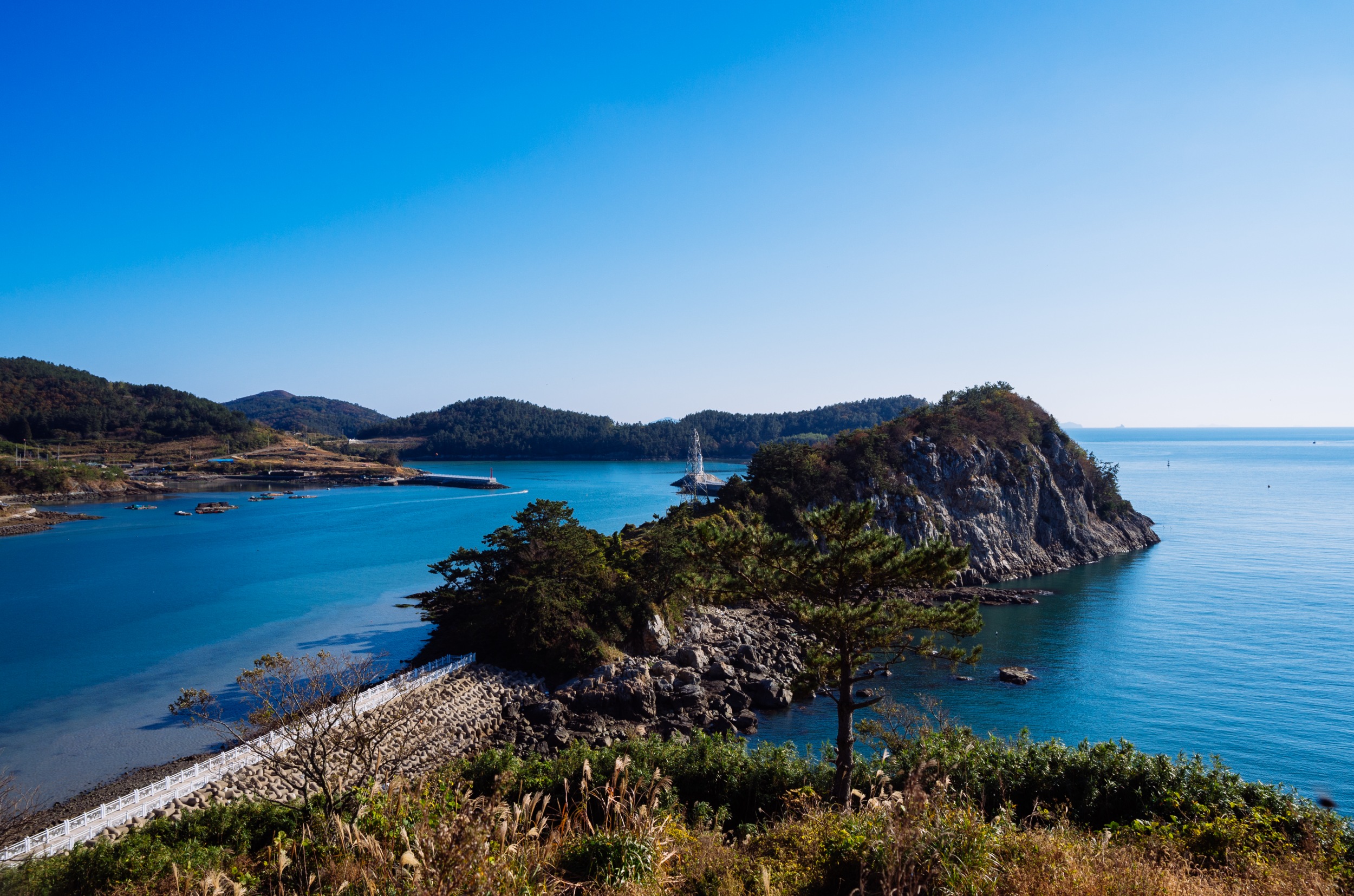 오른쪽에 보이는 외딴섬이 수락도, 그 옆으로는 사양도입니다. 사양도는 사양교가 있어 차로 이동 가능합니다.