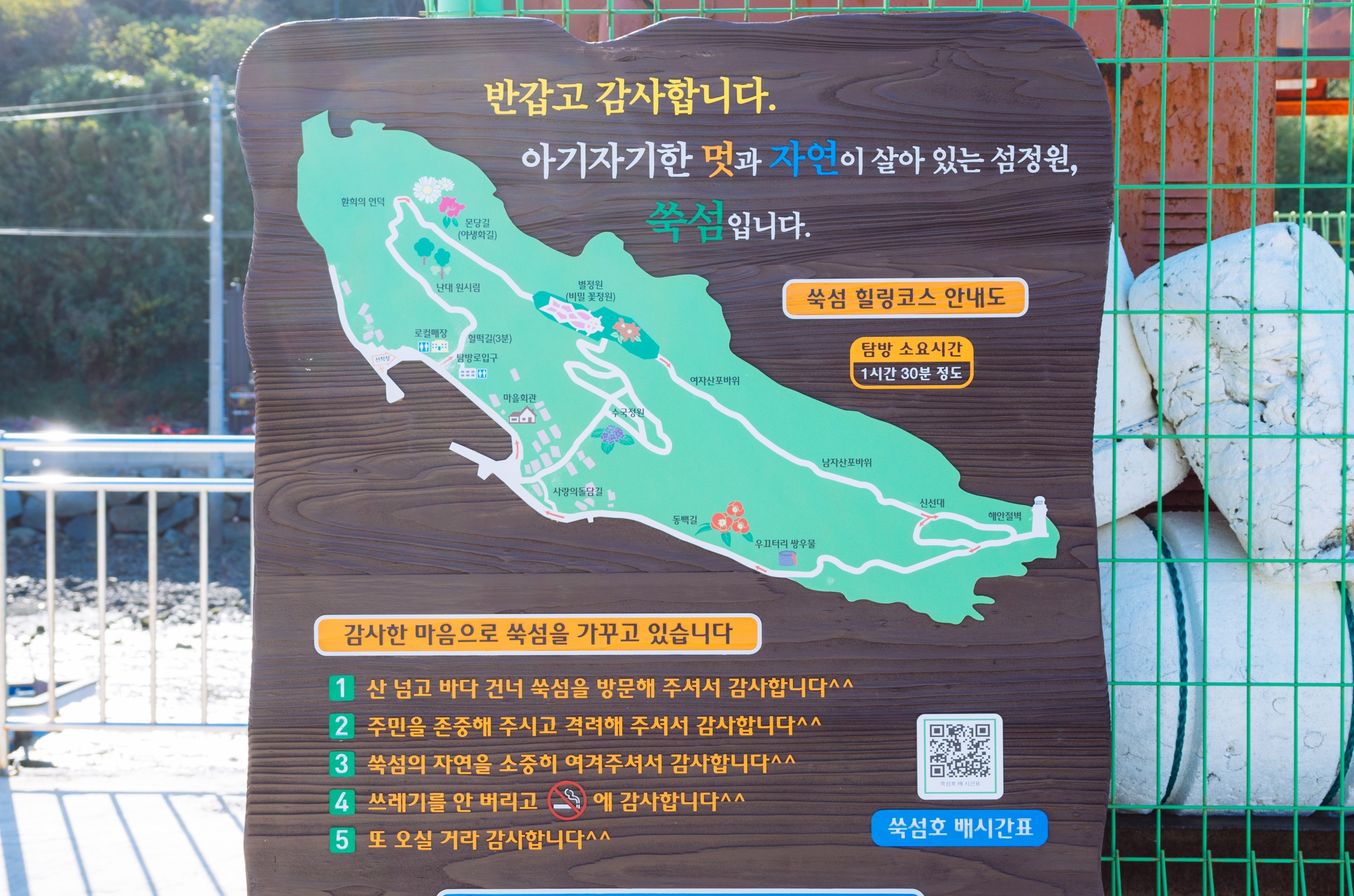 쑥섬에 도착하면 쑥섬 힐링코스 안내도가 보이고 쑥섬을 사랑하는 마을 사람들의 바람이 적혀 있습니다.