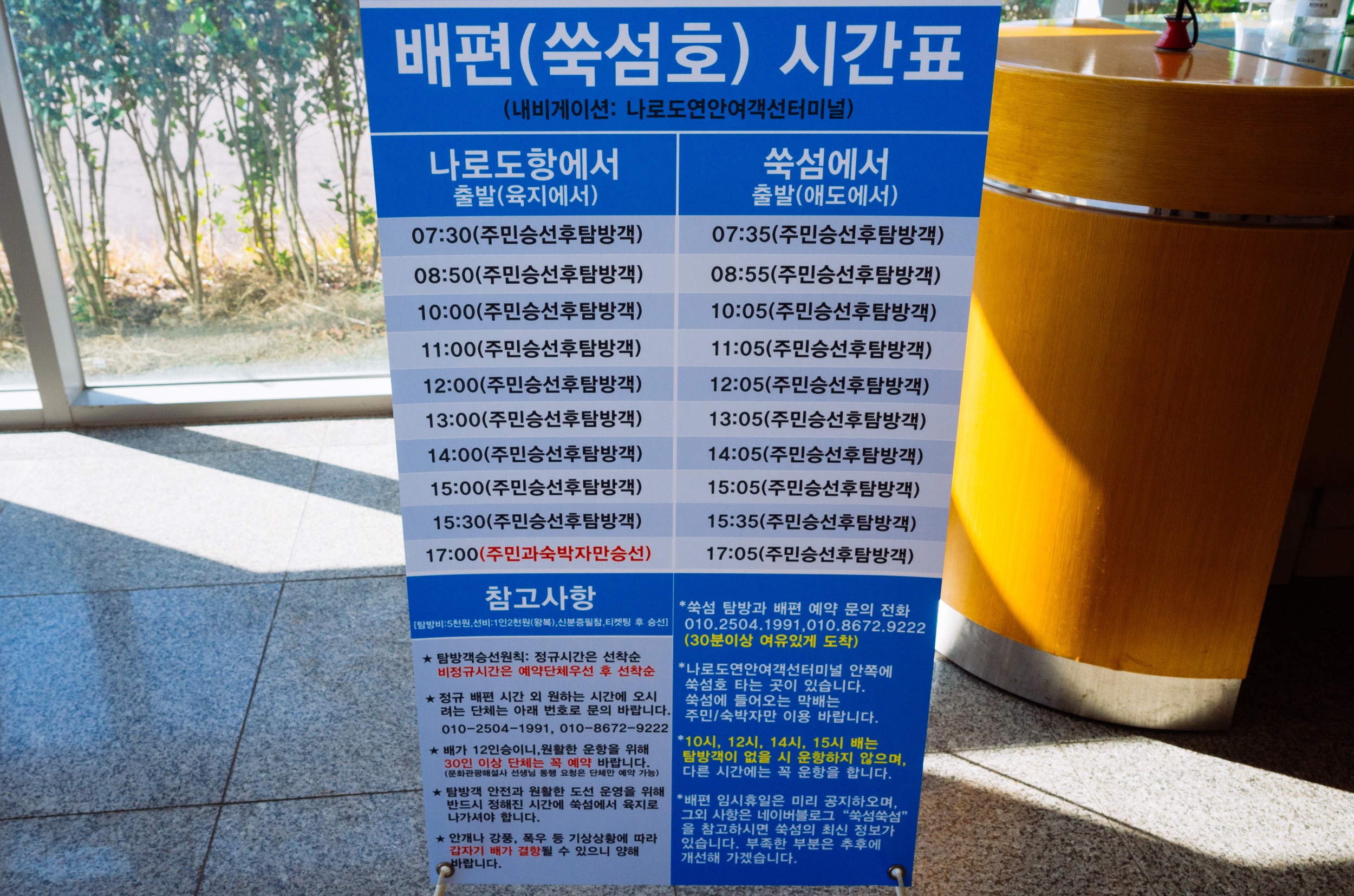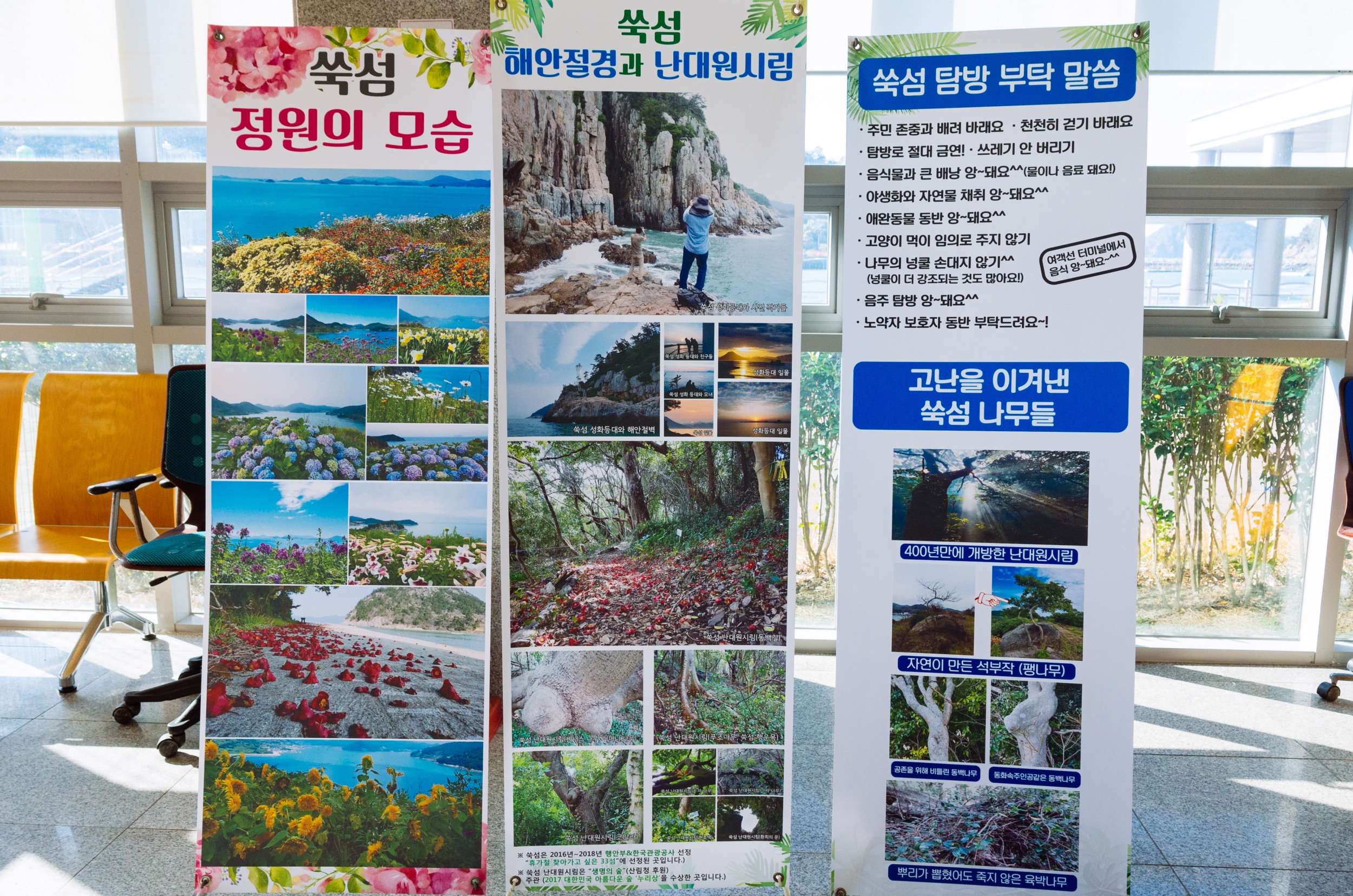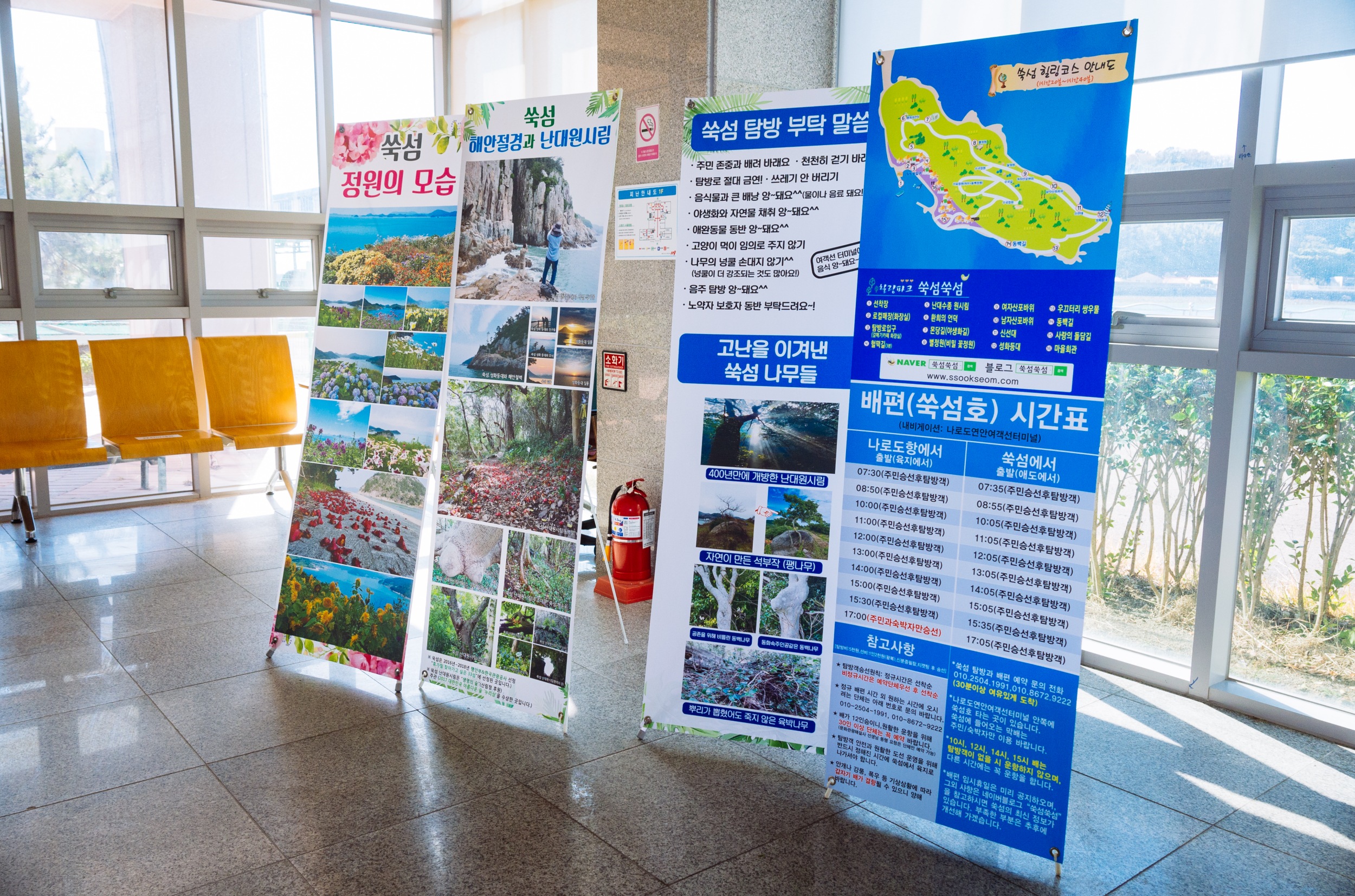 고흥 나로도항에 도착한 시간이 13시 10분 정도 되어서 배 편 타기 전 인적 사항 먼저 작성하고 13시 40분에 대합실에서 모여 쑥섬에 대한 안내를 20분 정도 사전에 듣고 14시 배에 승선했습니다. 14시 배에 승선하고 17시 05분에 하선 배 타니 사진 촬영하기에는 넉넉했습니다,