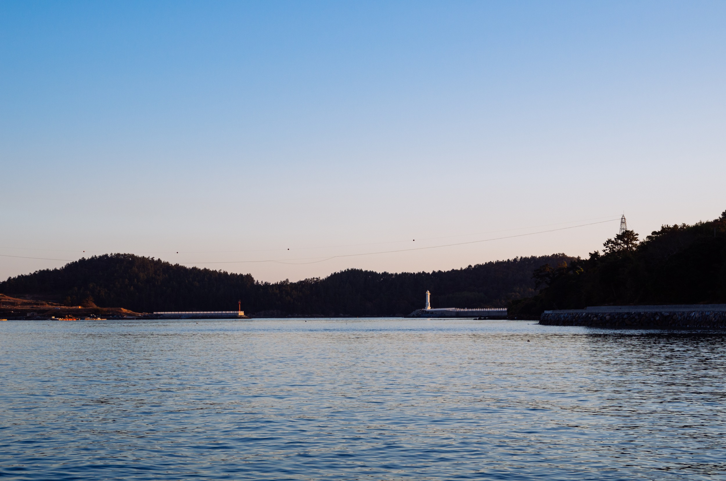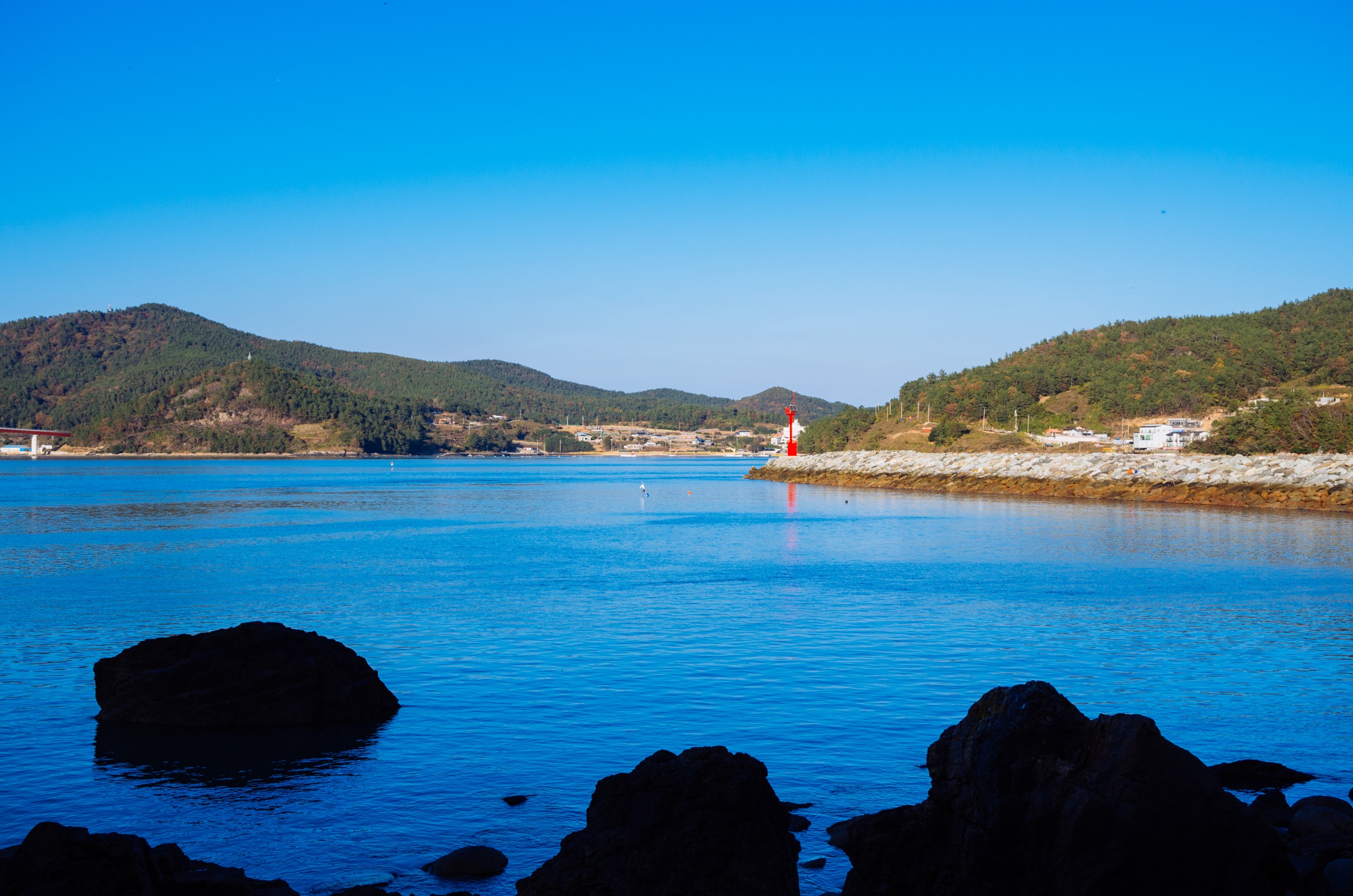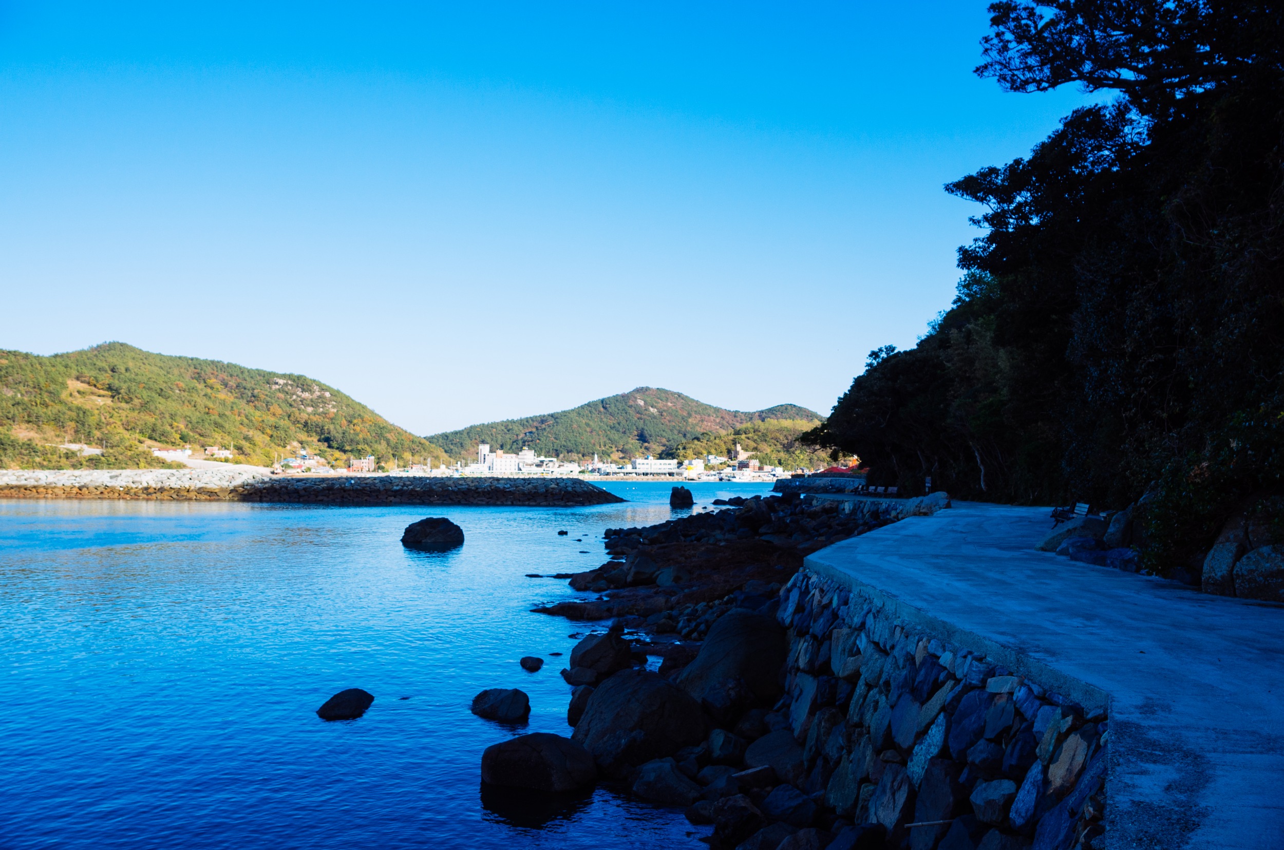 쑥섬에서 바라 본 나로도 항. 왼쪽은 내나로도 오른쪽은 외나로도