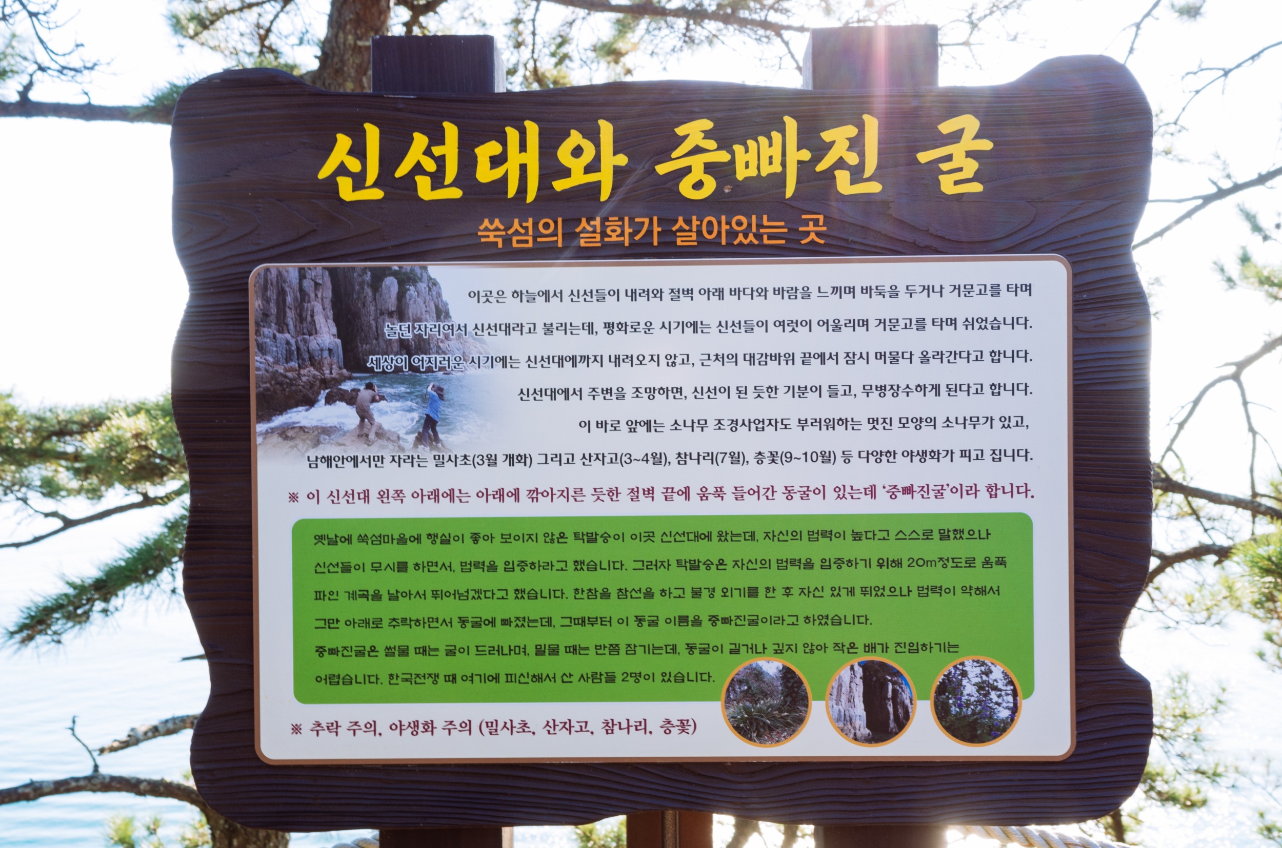 쑥섬의 신선들이 놀고 자리를 신선대라고 하는데요. 주변 경치와 야생화가 멋져서 신선대에서 주변을 조망하면 신선이 된 듯한 기분이 들고, 무병장수하게 된다고 합니다.