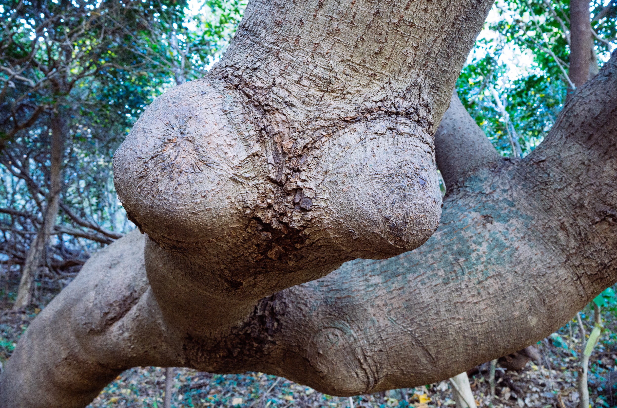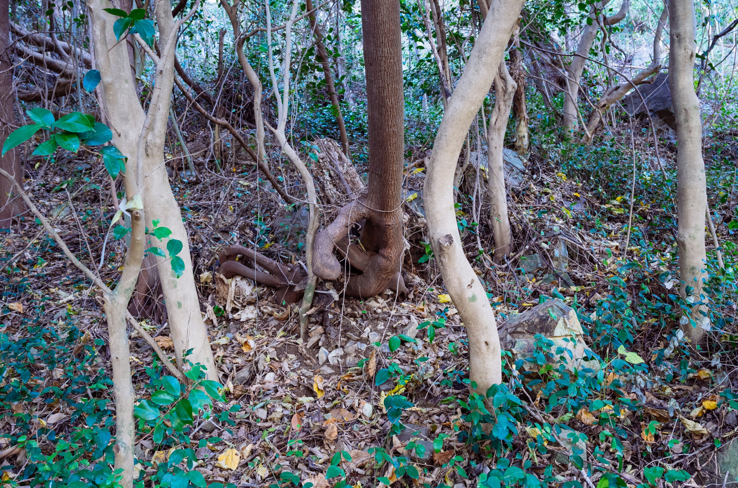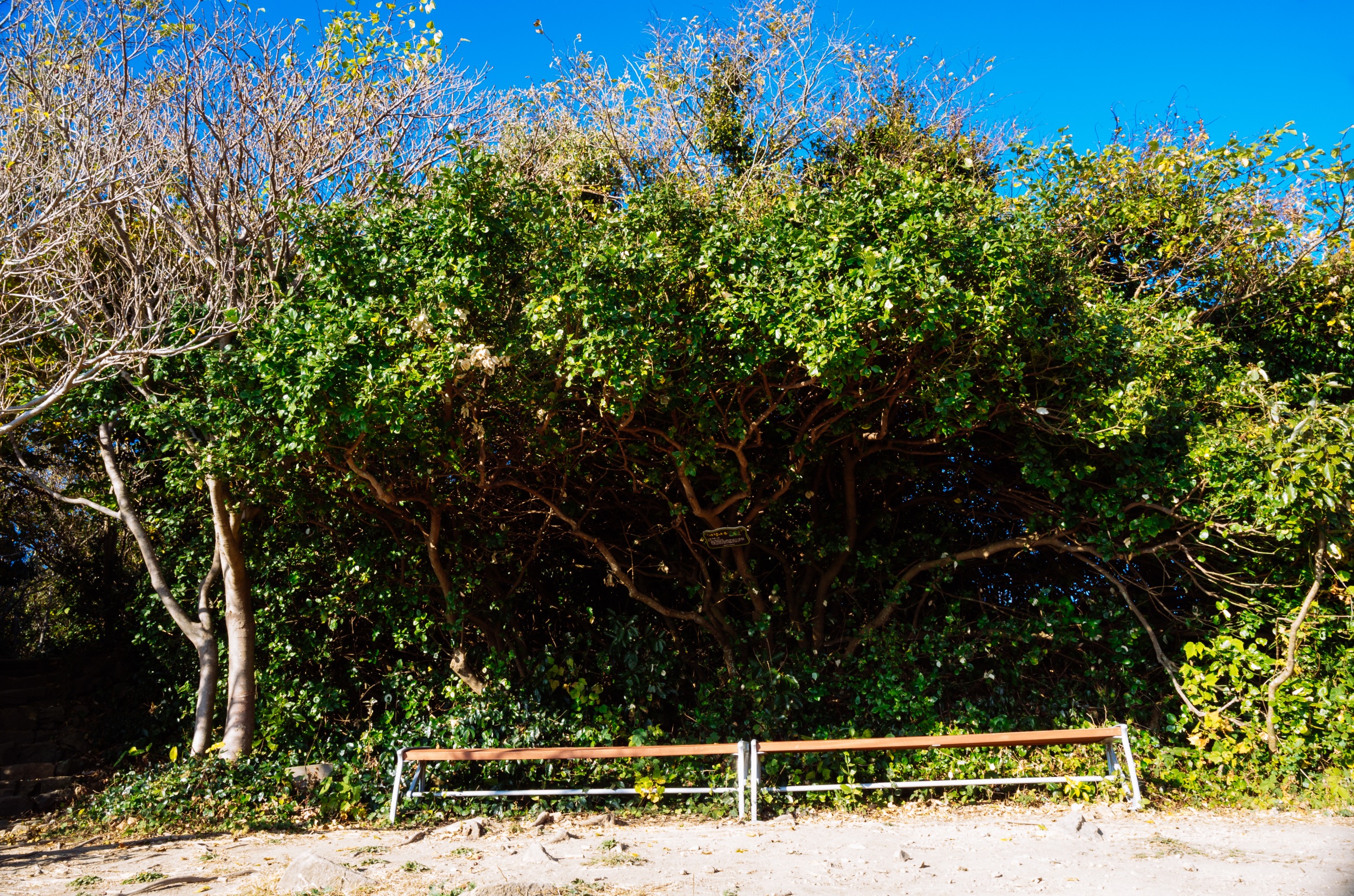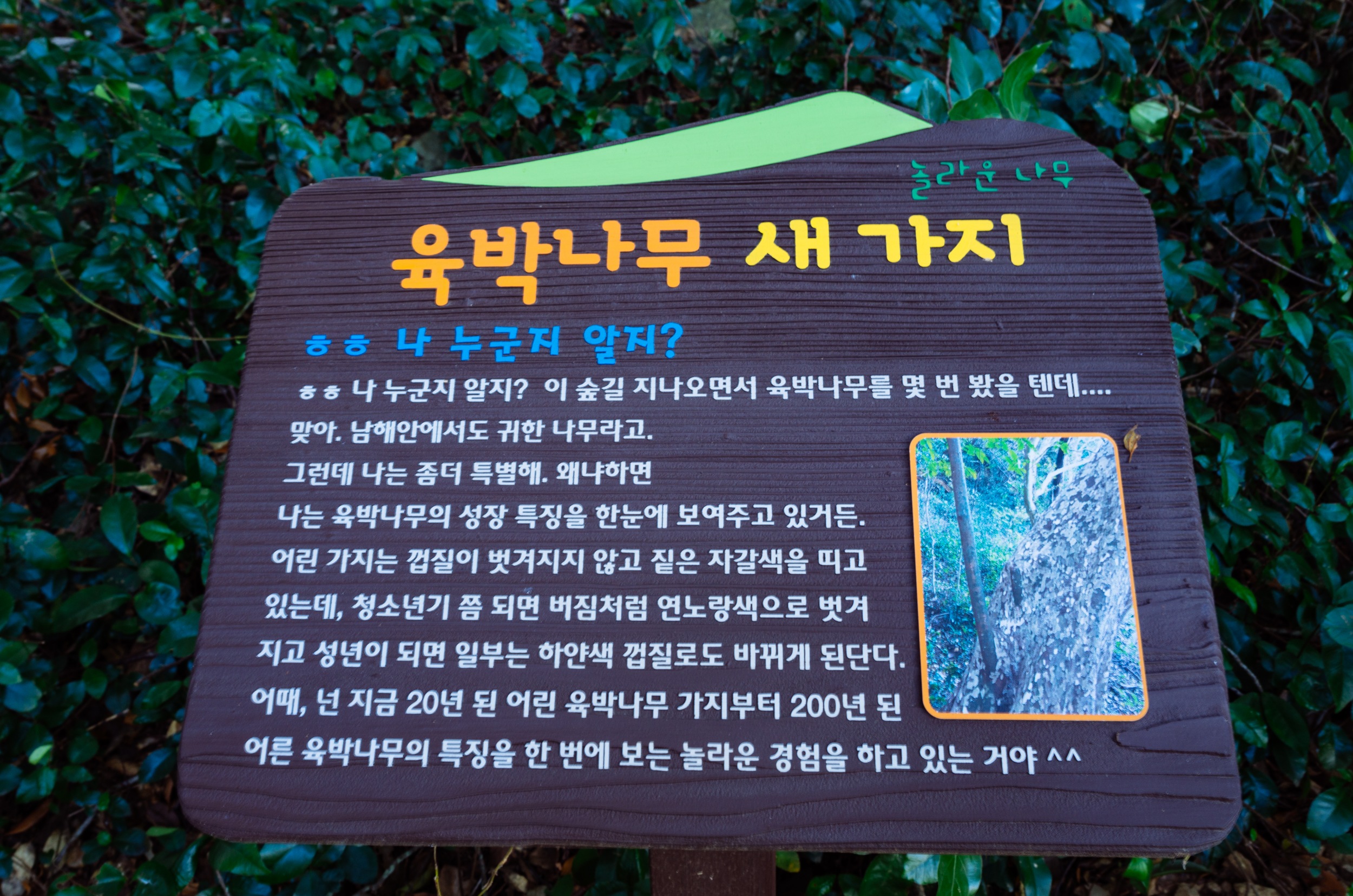육박나무는 2003년 태풍 매미의 영향으로 쓰러져 있지만 죽지 않고 강한 집념으로 계속 생명을 이어가고 있습니다.