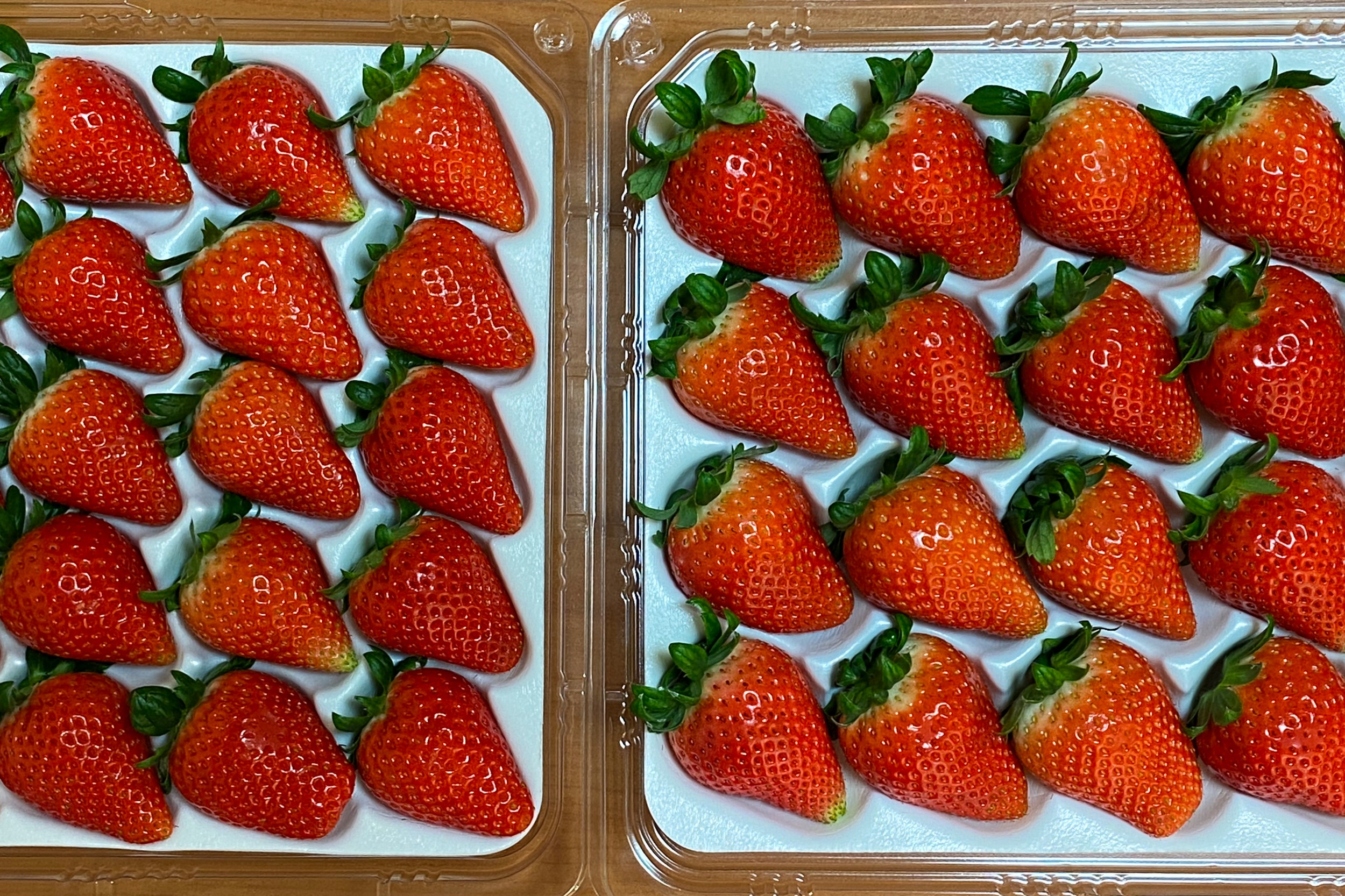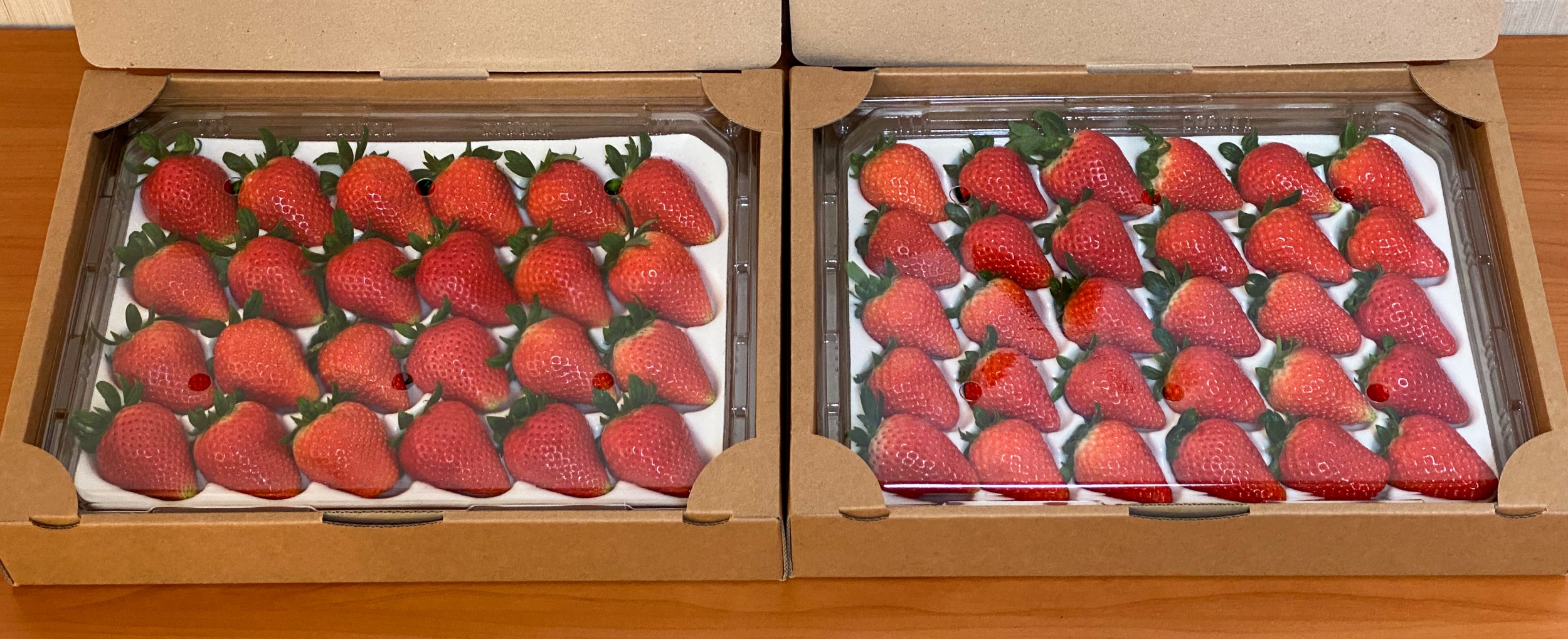 비타베리 딸기 30구(좌)와 24구(우)를 가까이서 촬영했는데 크기 차이가 별로 나지 않습니다.