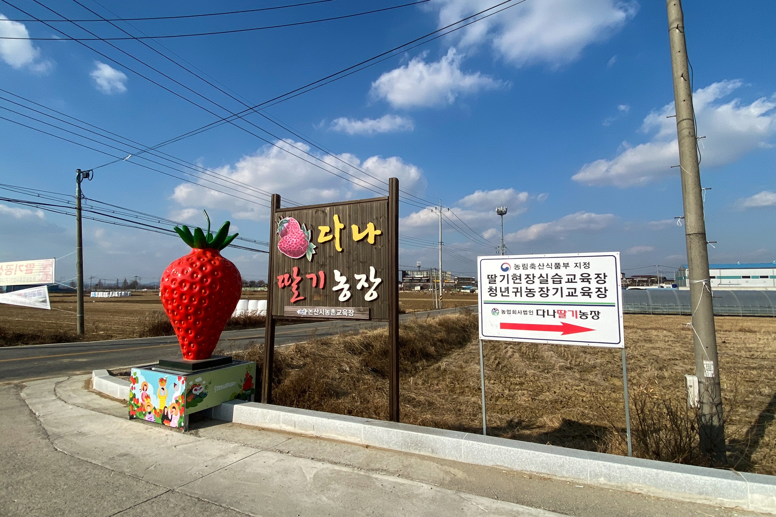 드디어 도착한 다나딸기농장 입구에는 귀여운 딸기 조형물이 설치되어 있어서 찾기는 쉬웠습니다. 농림축산식품부 지정 딸기 교육장 지정이라 상품에 대한 믿음이 갑니다.