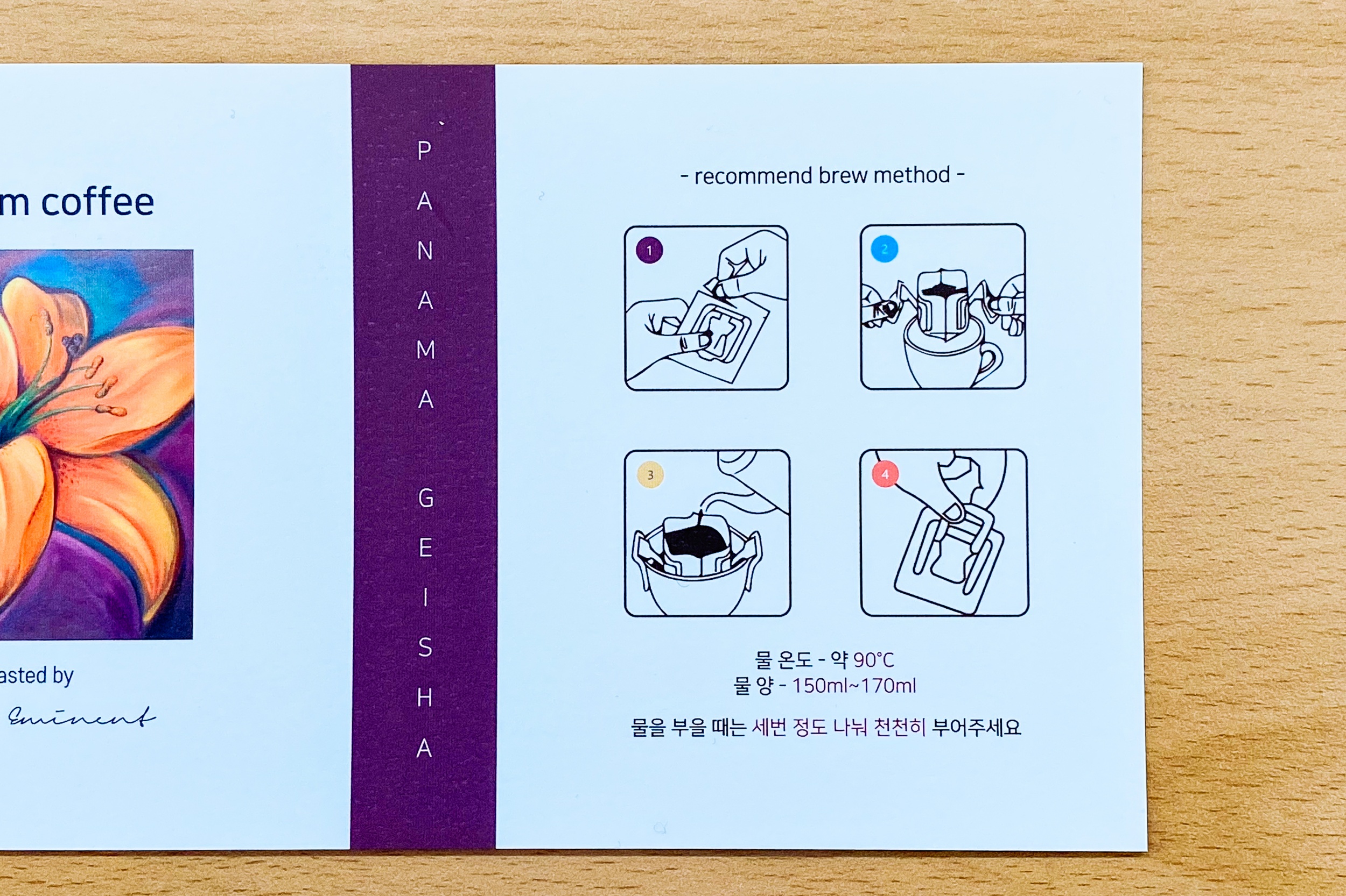 파나마 게이샤 커피에 대한 설명서가 동봉되어 있습니다.
