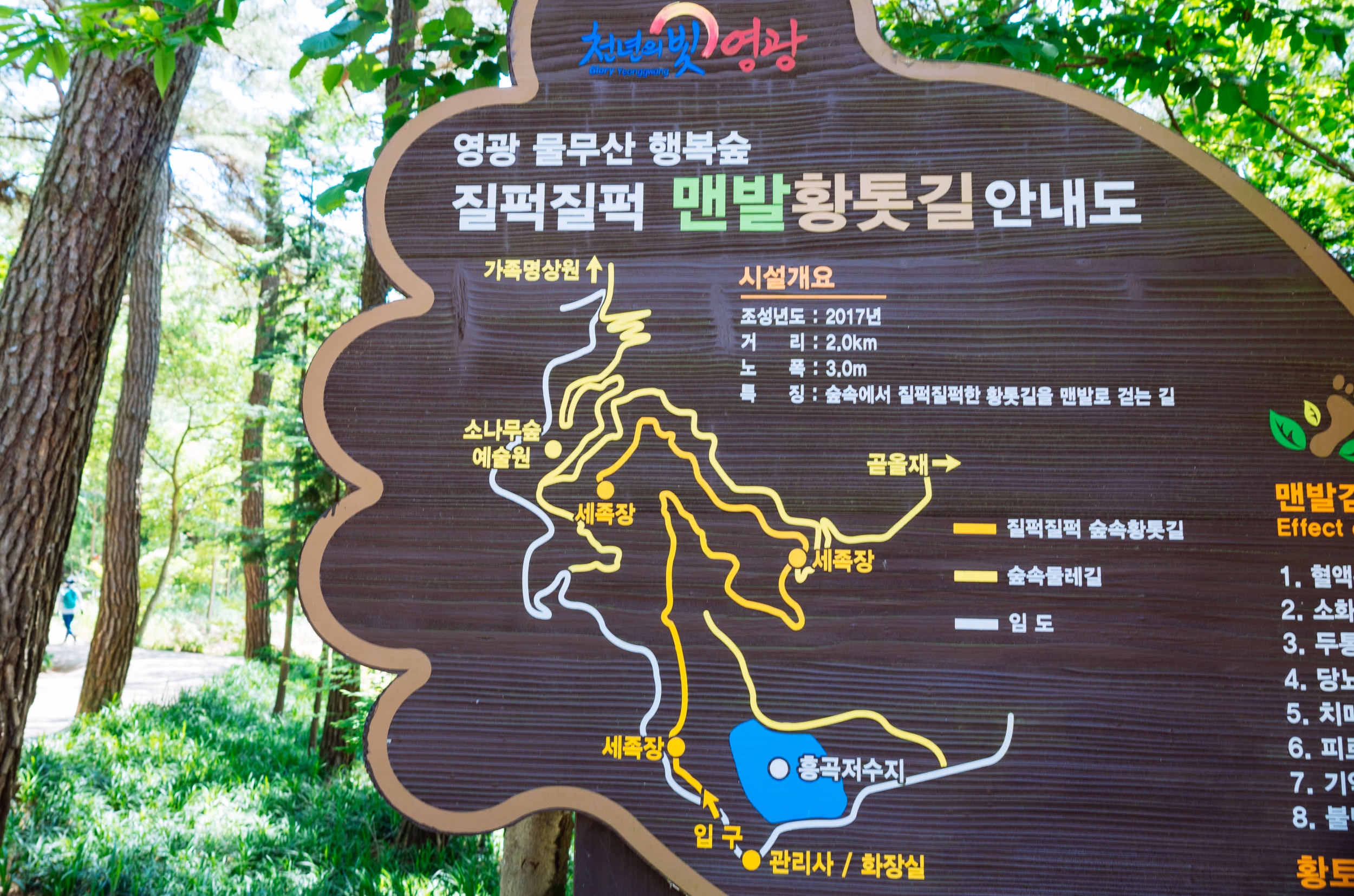 영광 물무산 행복숲 질퍽질퍽 맨발 황톳길 안내도를 보면 황톳길은 총 2km며 질퍽질퍽한황톳길이 0.6km, 마른황톳길이1.4km 입니다. 황톳실 중간중간에 세족장이 있어 편리하게 산책할 수 있습니다.