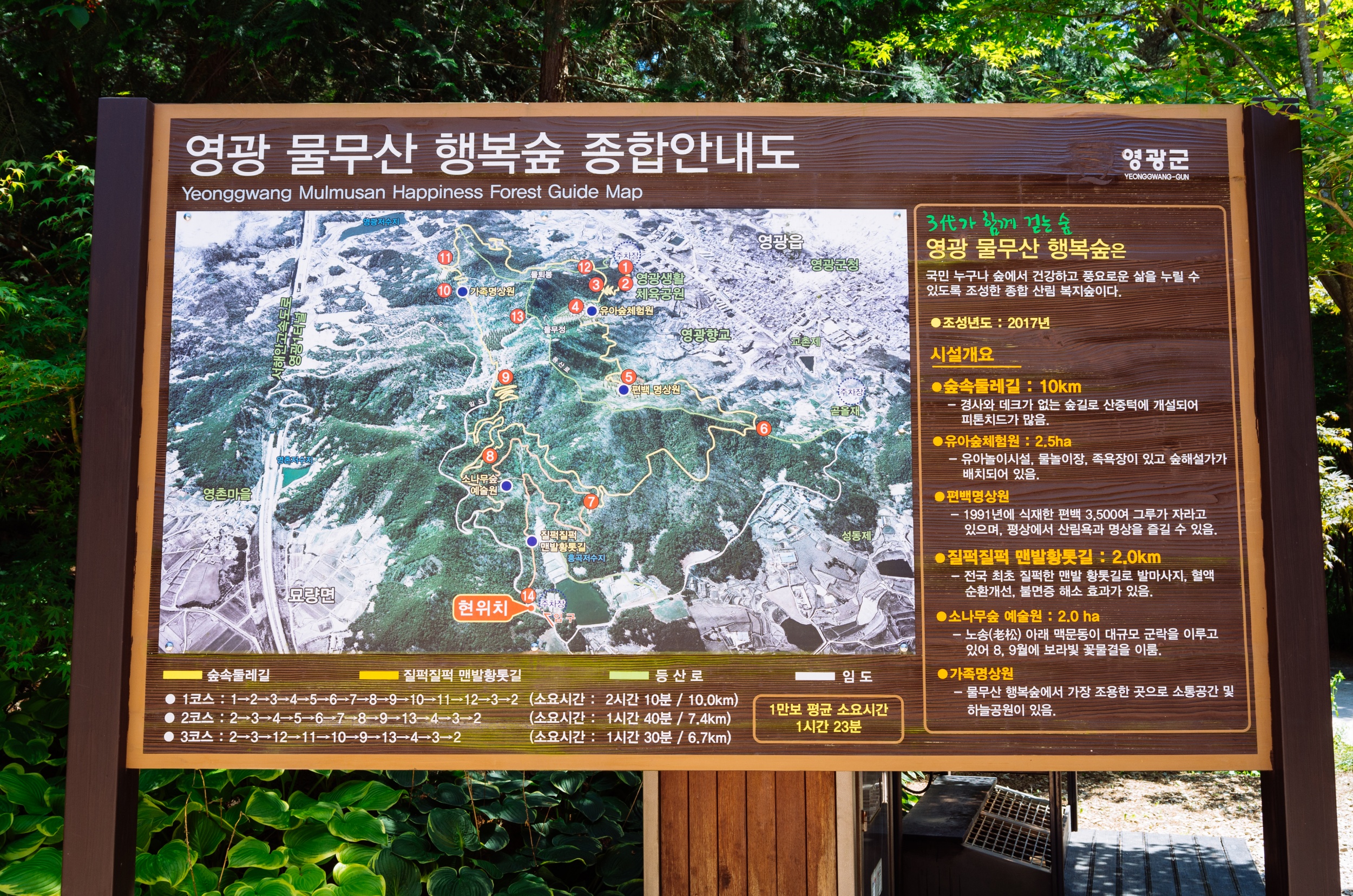 14번(흥곡저수지 입구) - 질퍽질퍽 맨발 황톳길 - 7번 - 8번(소나무숲 예술원) - 9번 - 10번(가족명상원) - 11번 - 12번 - 3번 - 물뫼봉 - 물무정 - 4번(유아숲 체험원) - 5번(편백 명상원) - 6번 - 7번 - 질퍽질퍽 맨발 황톳길 - 14번(흥곡저수지 입구) 순입니다.