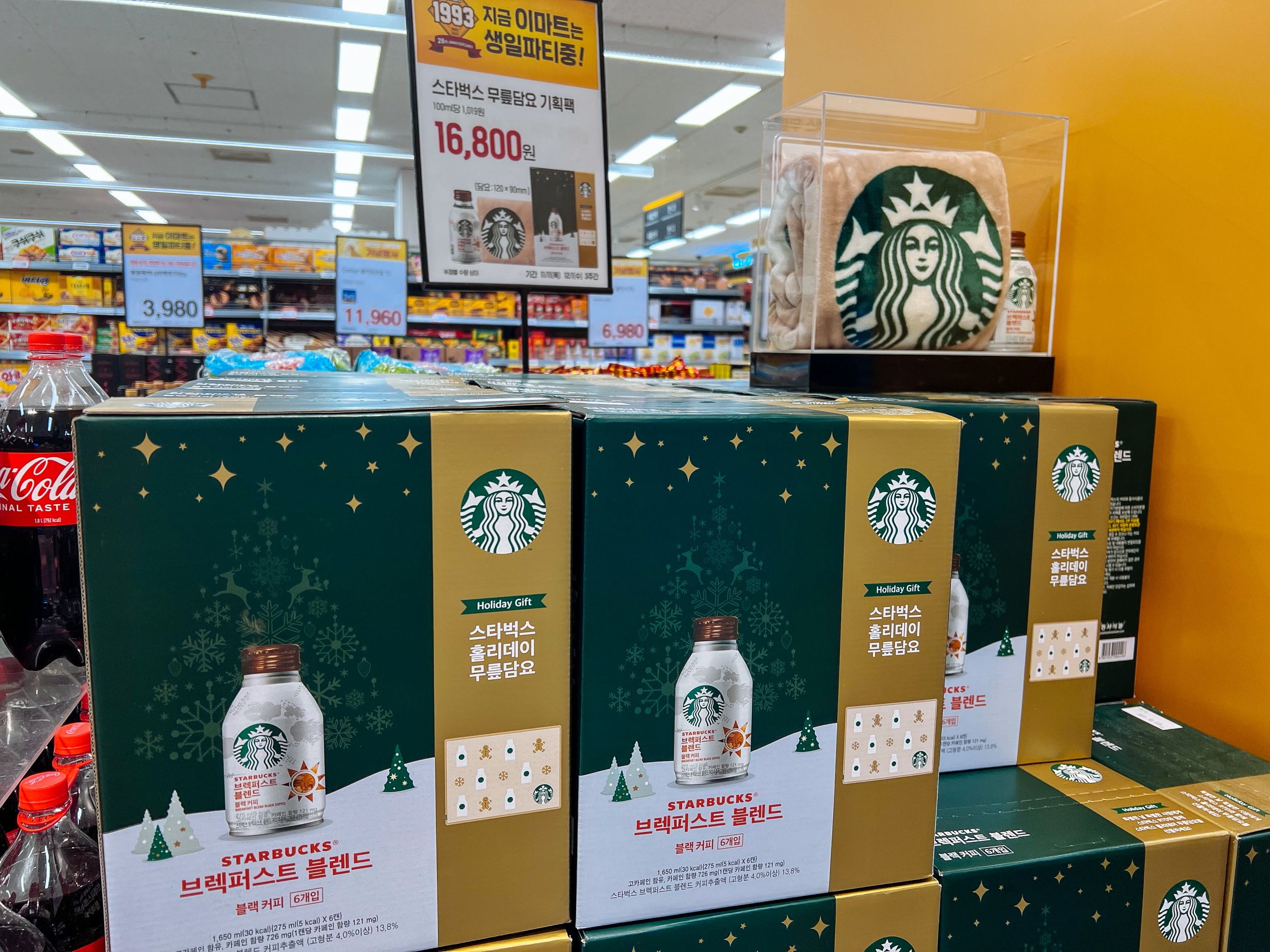 이마트 봉선점 리뉴얼했다고 해서 구경하는데 스타벅스 브렉퍼스트 블렌드 6개 상품 구매 시 스타벅스 홀리데이 무릎담요 증정이라는 꿀템을 놓칠 수가 없었습니다. 이마트에서 동서식품 3만 원 이상 구매 시 신세계 상품권 3천 원 증정 행사 중입니다.