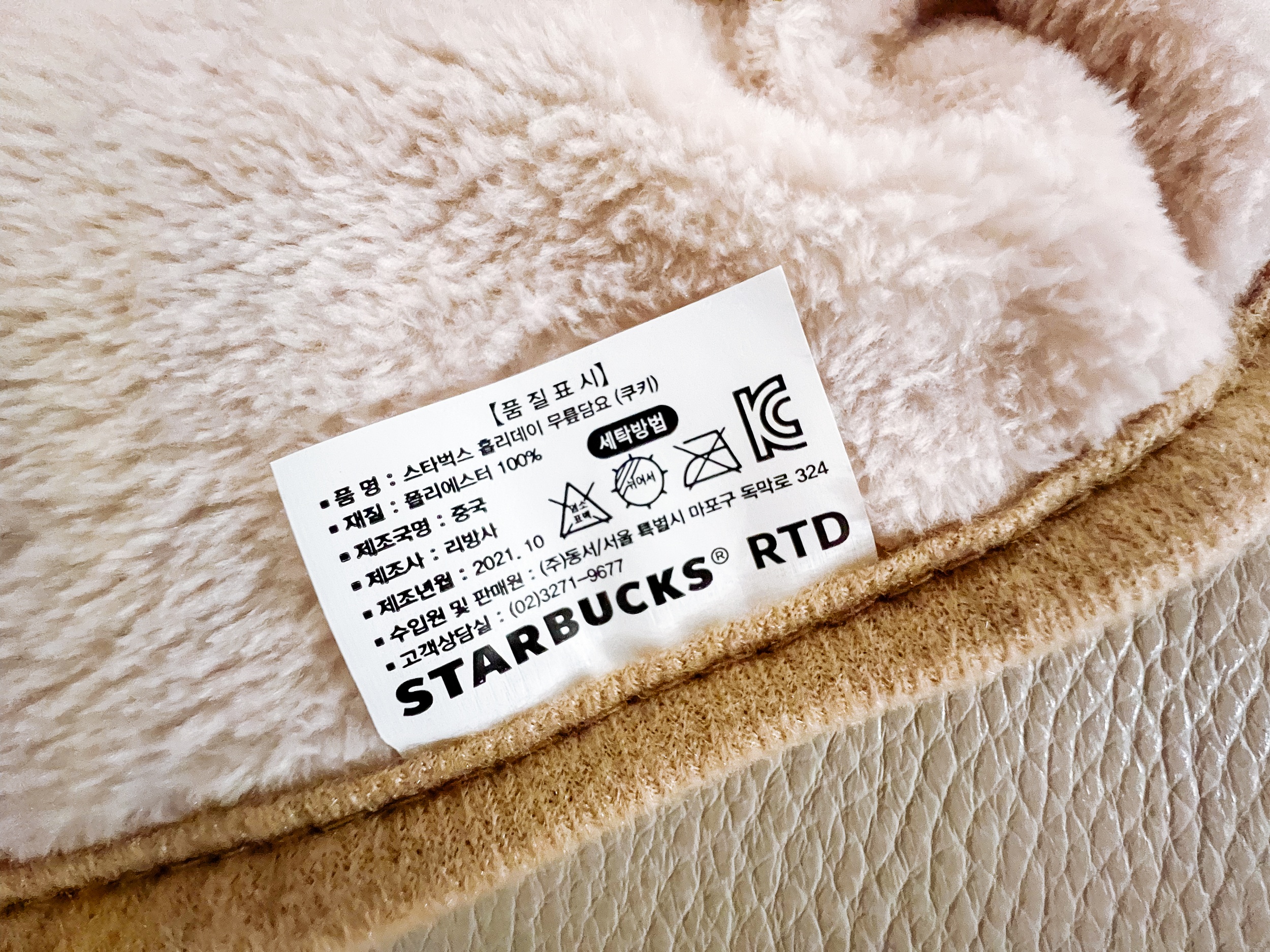 스타벅스 홀리데이 무릎 담요는 21년 10월 제조로 폴리에스터 100%, 다림질 금지, 단독세탁, 30도 이상의 세탁 금지입니다.