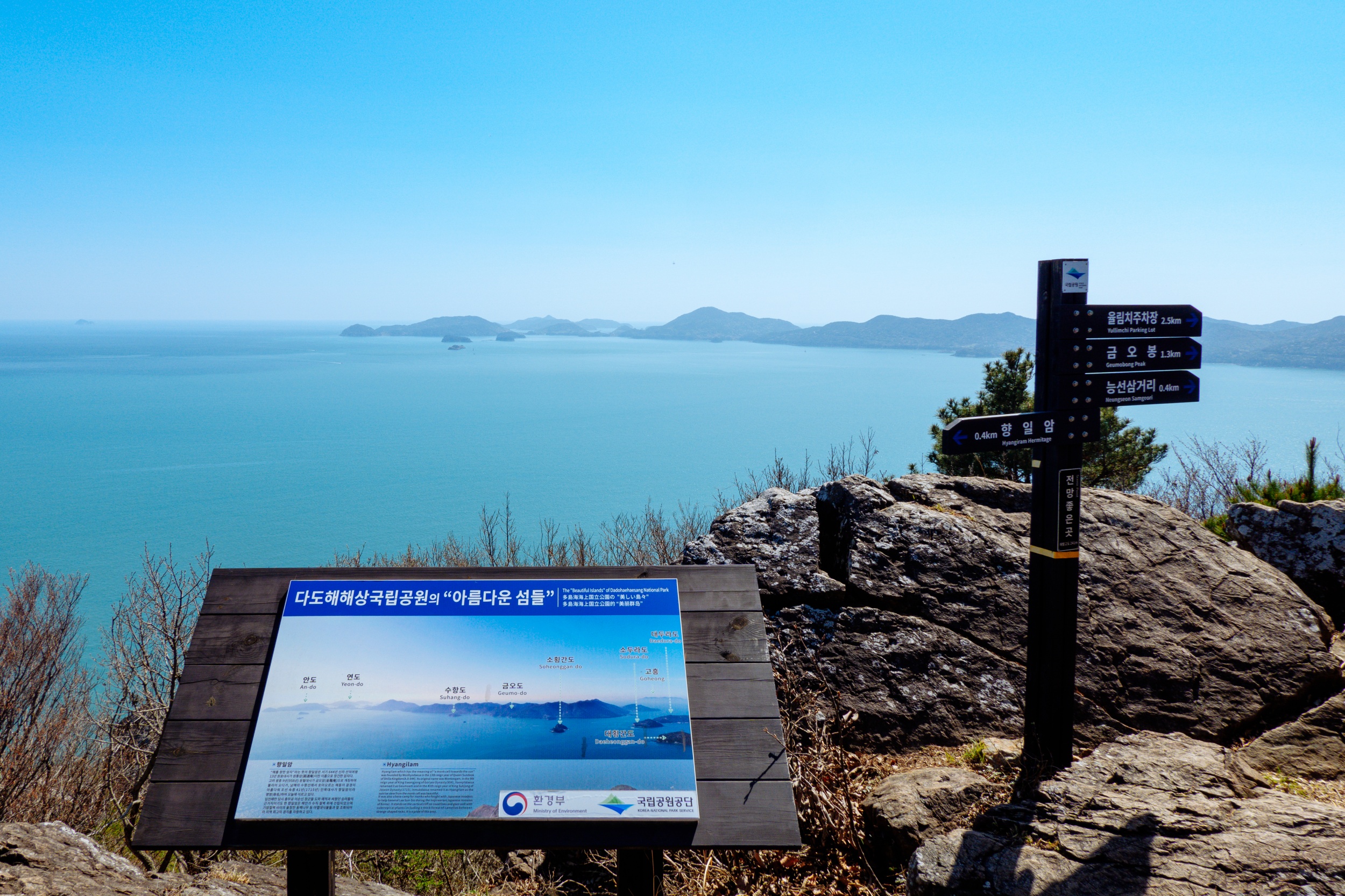 아름다운 돌담길과 오솔길을 지나면 금오봉 정상석이 보이고 능선 삼거리 방향으로 조금만 발걸음을 옮기면 그 앞으로는 다도해 조망이 펼쳐집니다.