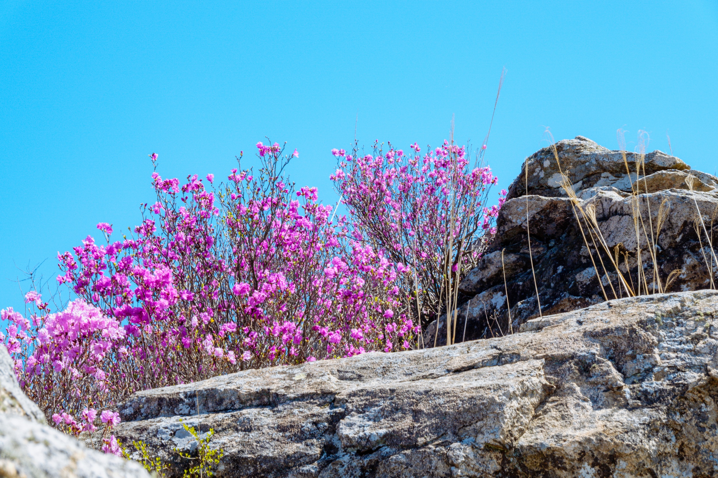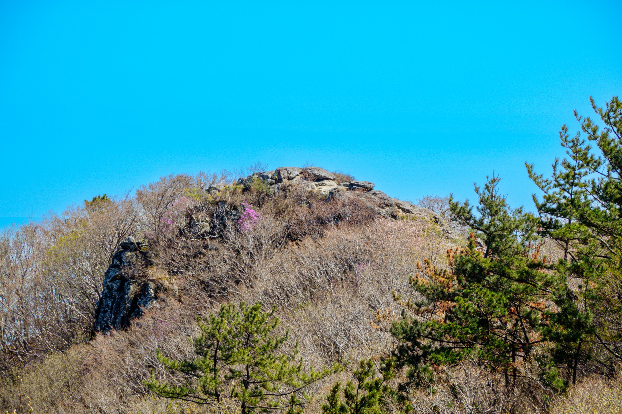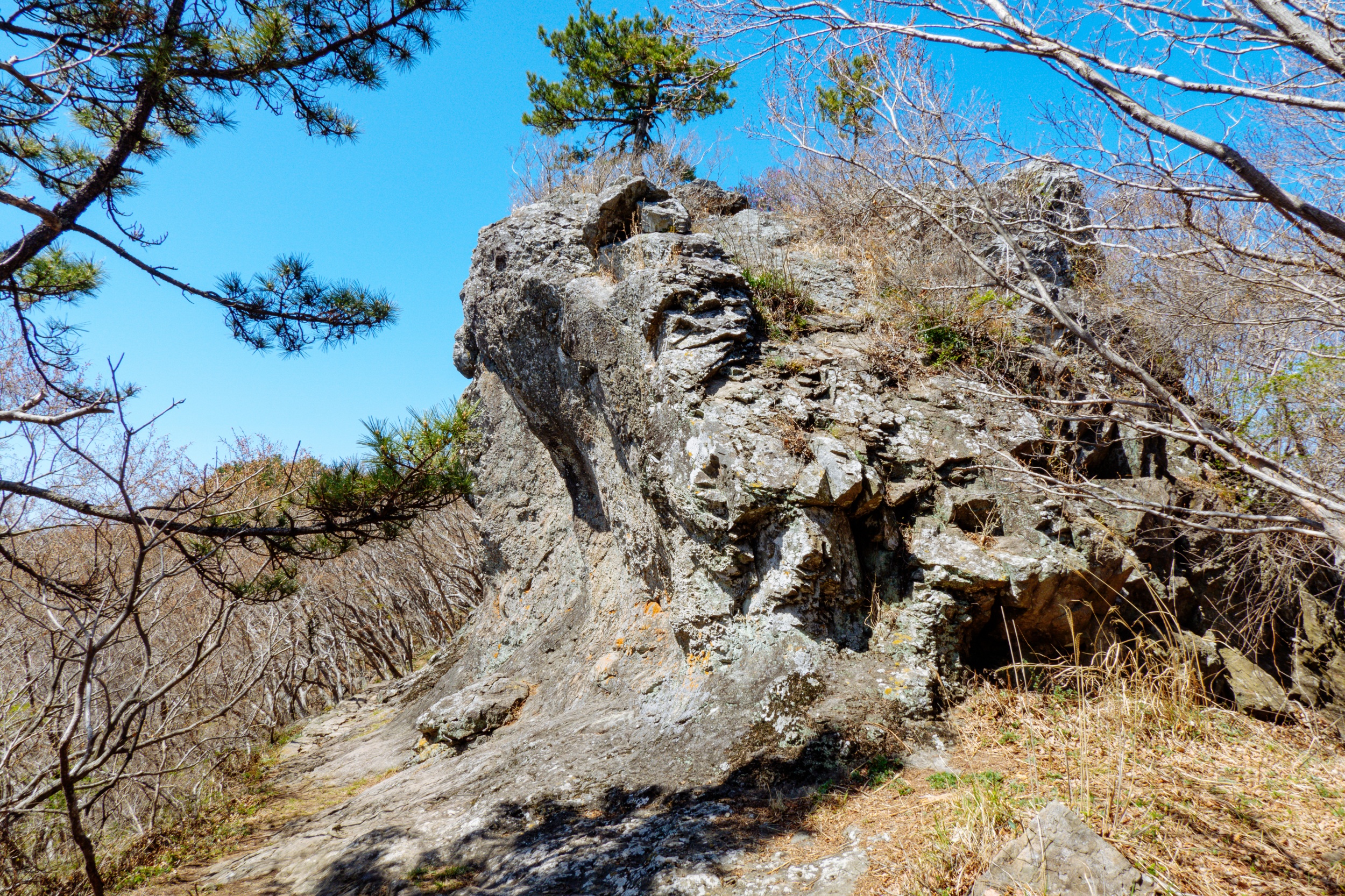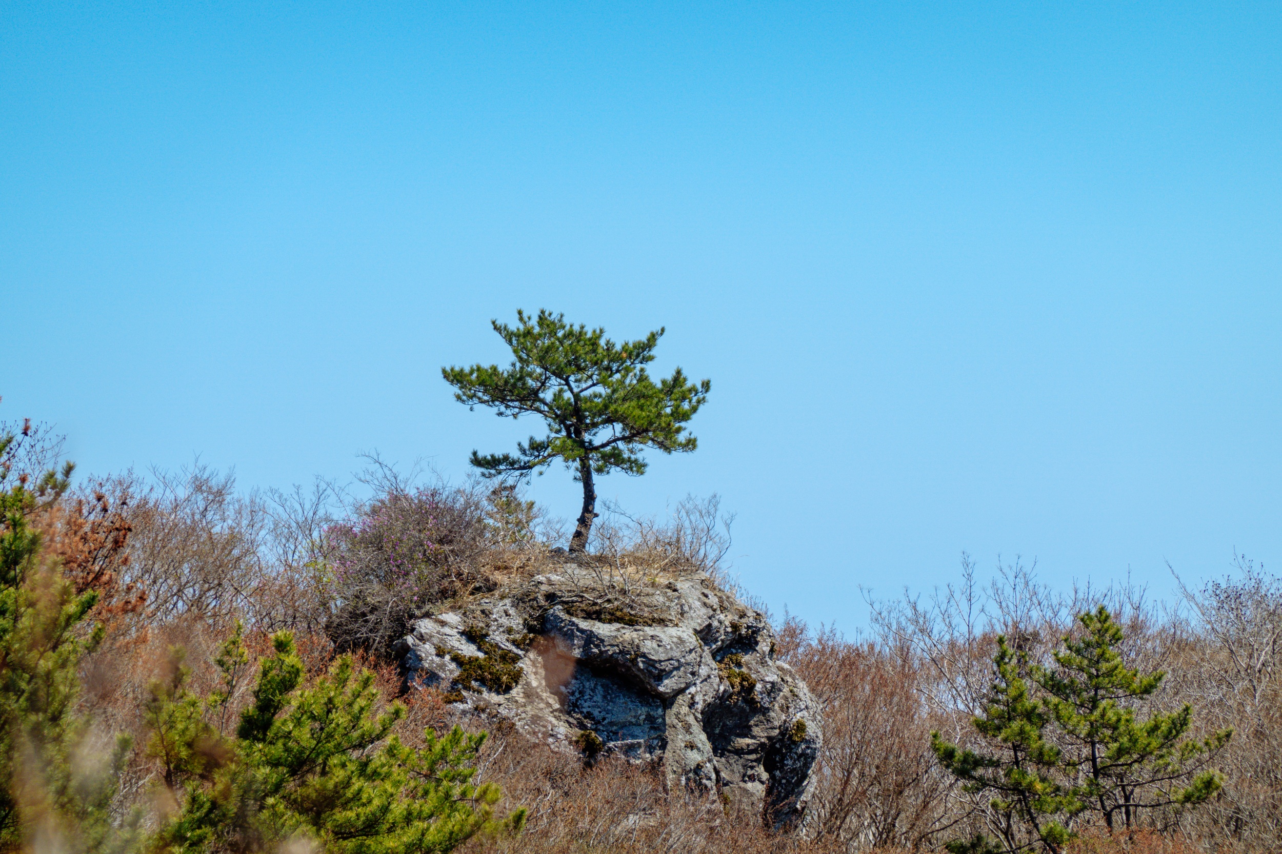 바위 위로 우뚝 솟은 소나무가 매우 빼어난 자태를 자랑합니다.