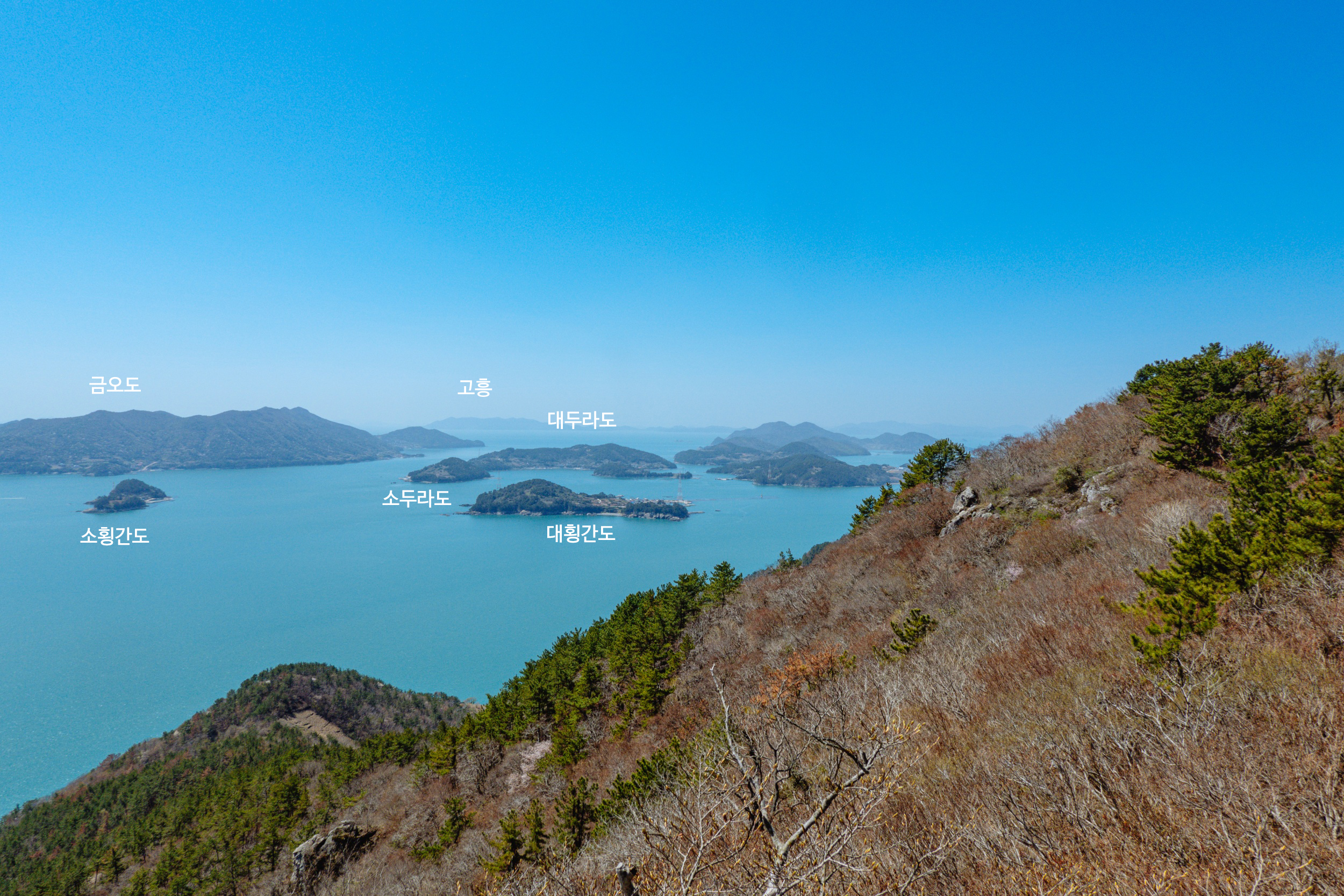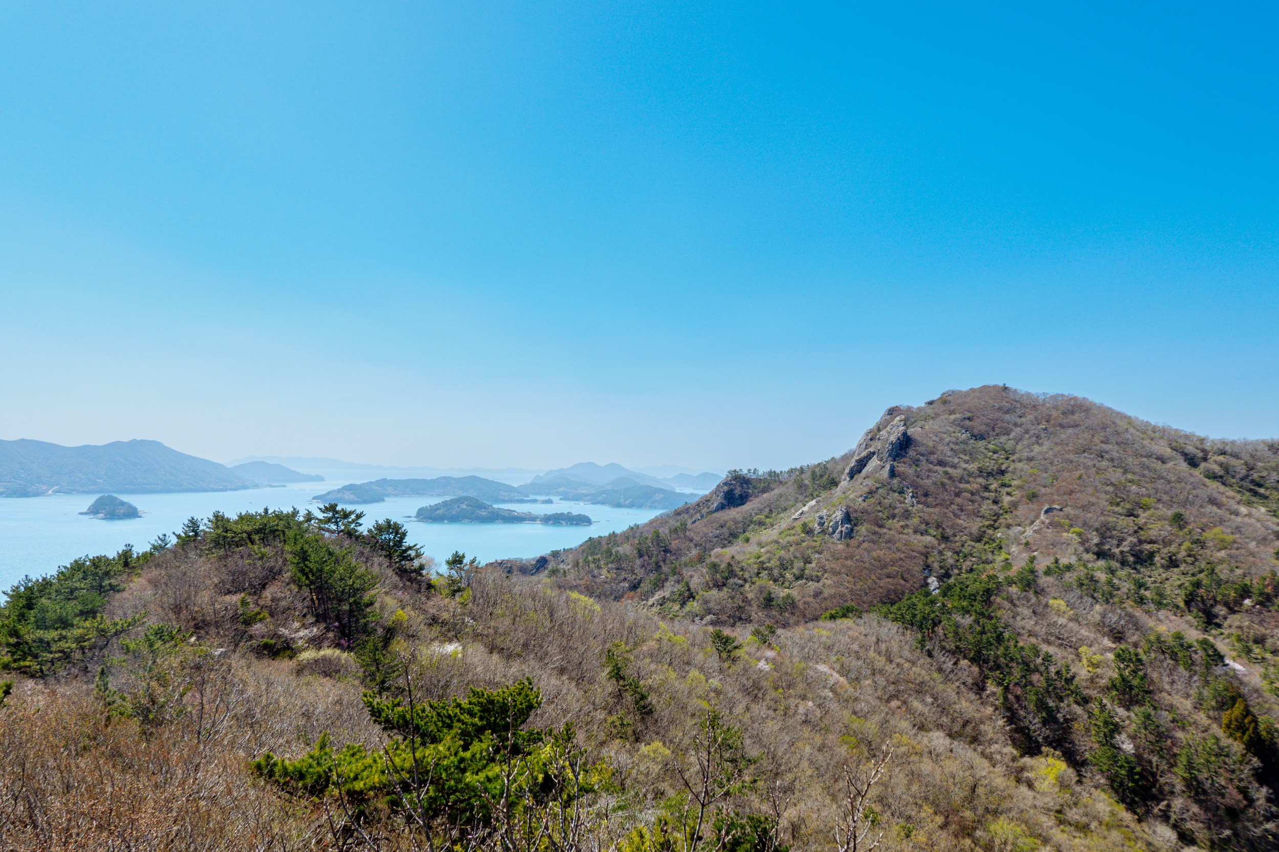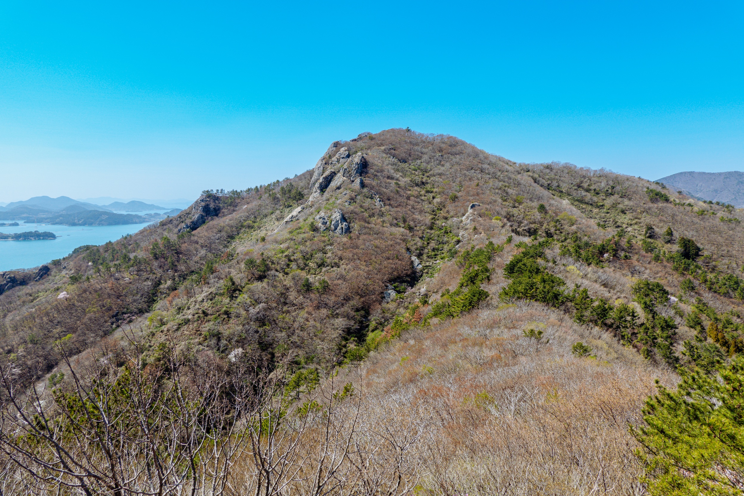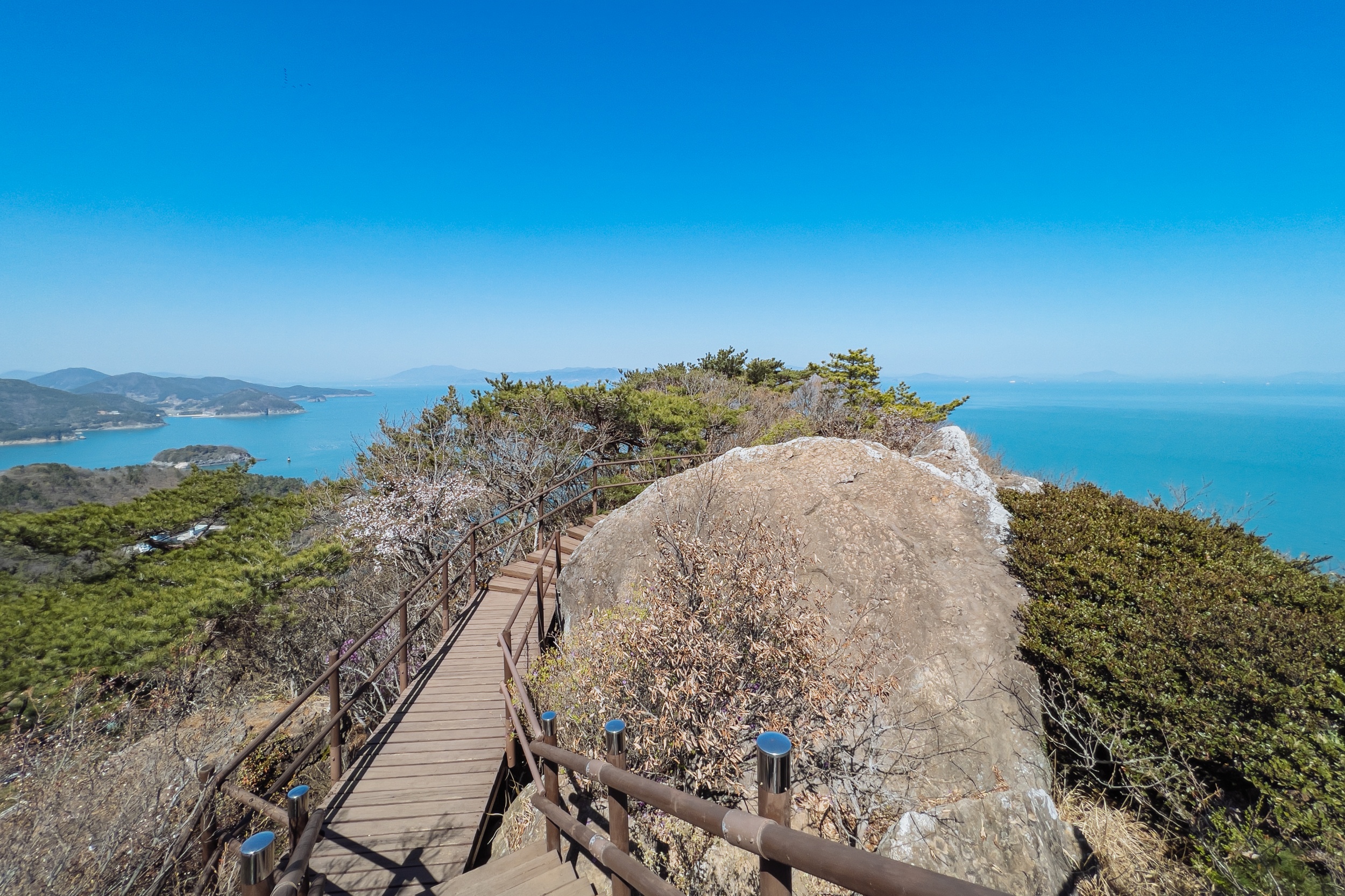 금오봉 정상에서 얼마 지나지 않아 다도해 짙푸른 바다 조망이 펼쳐집니다.