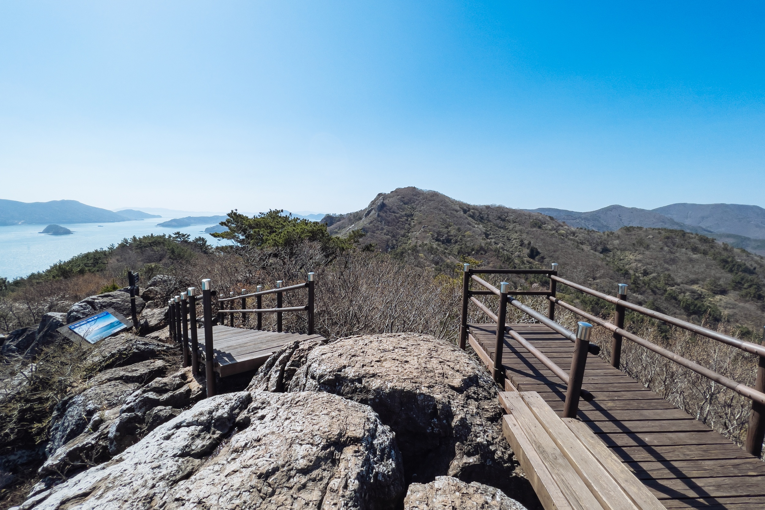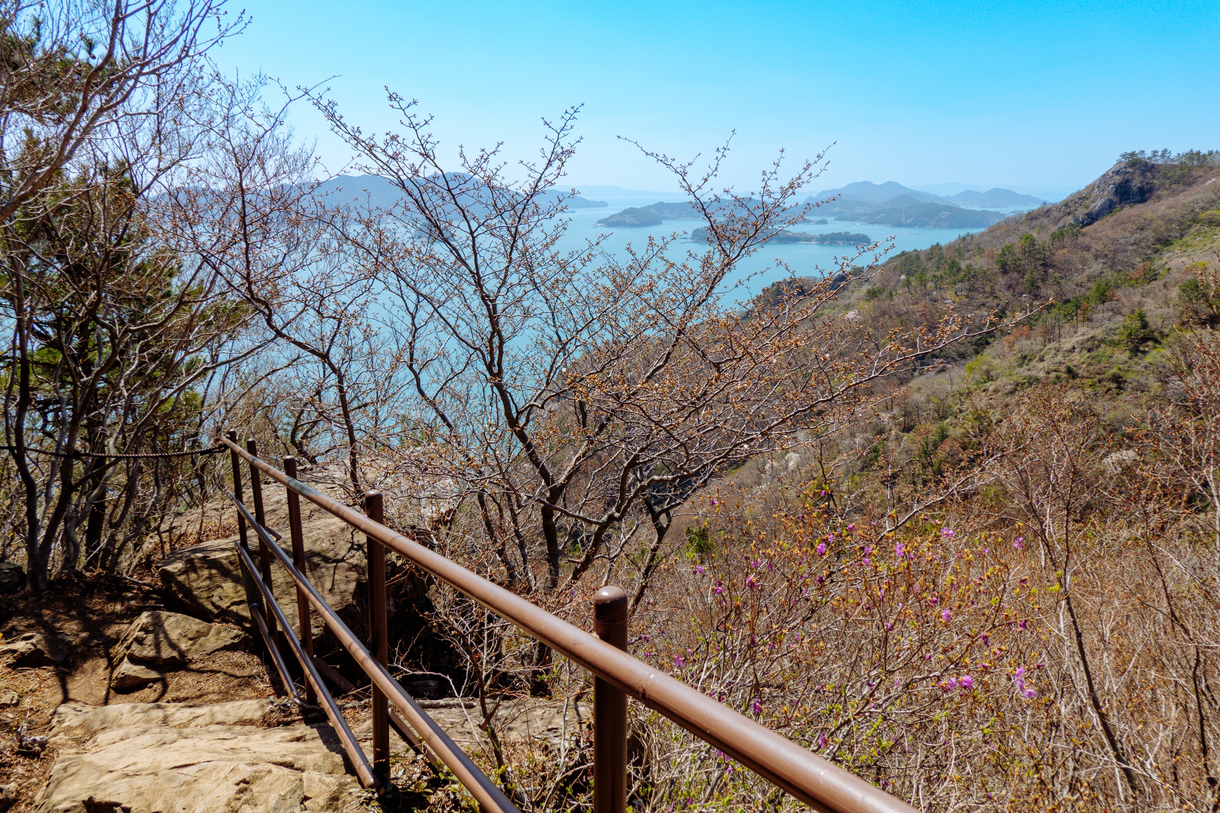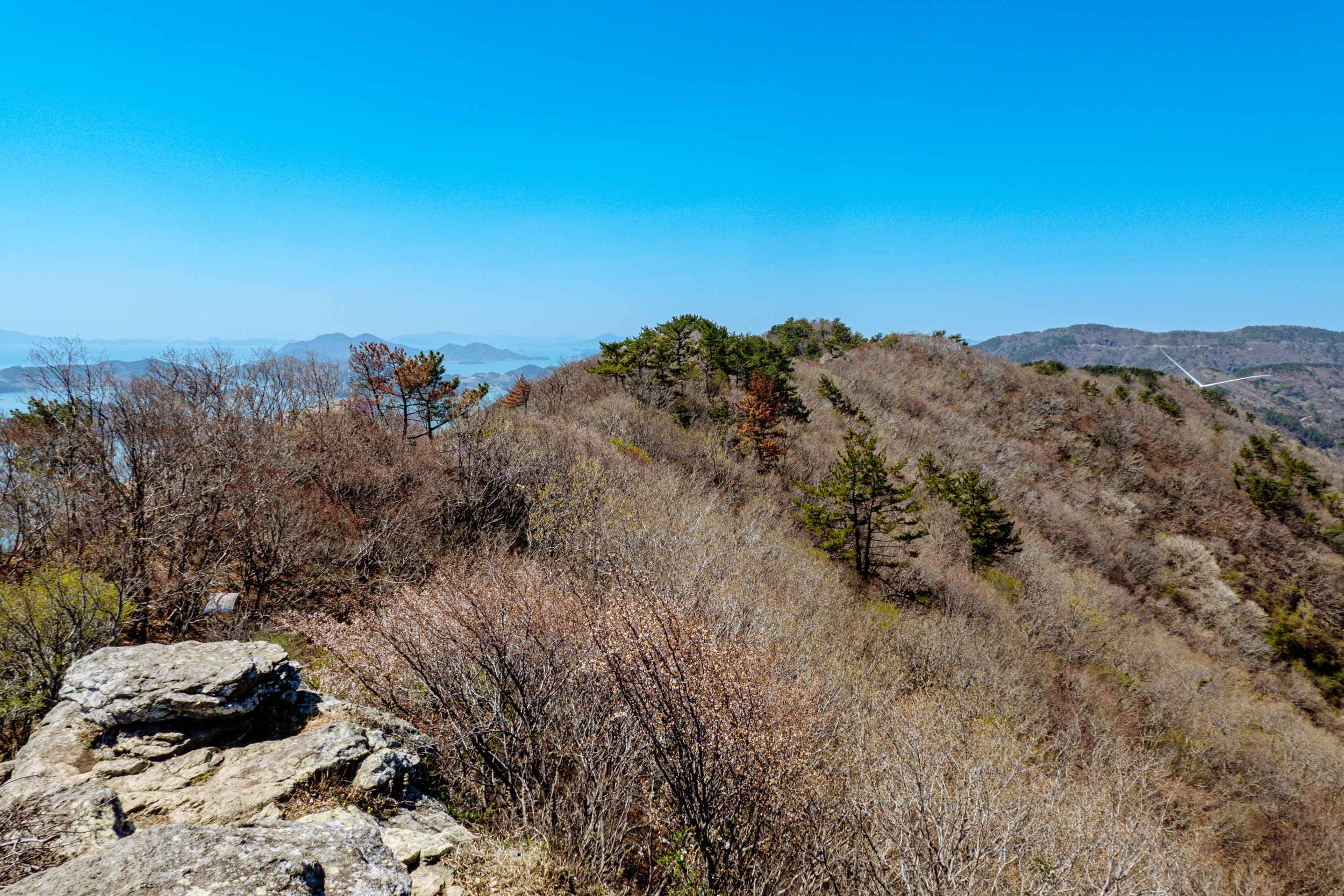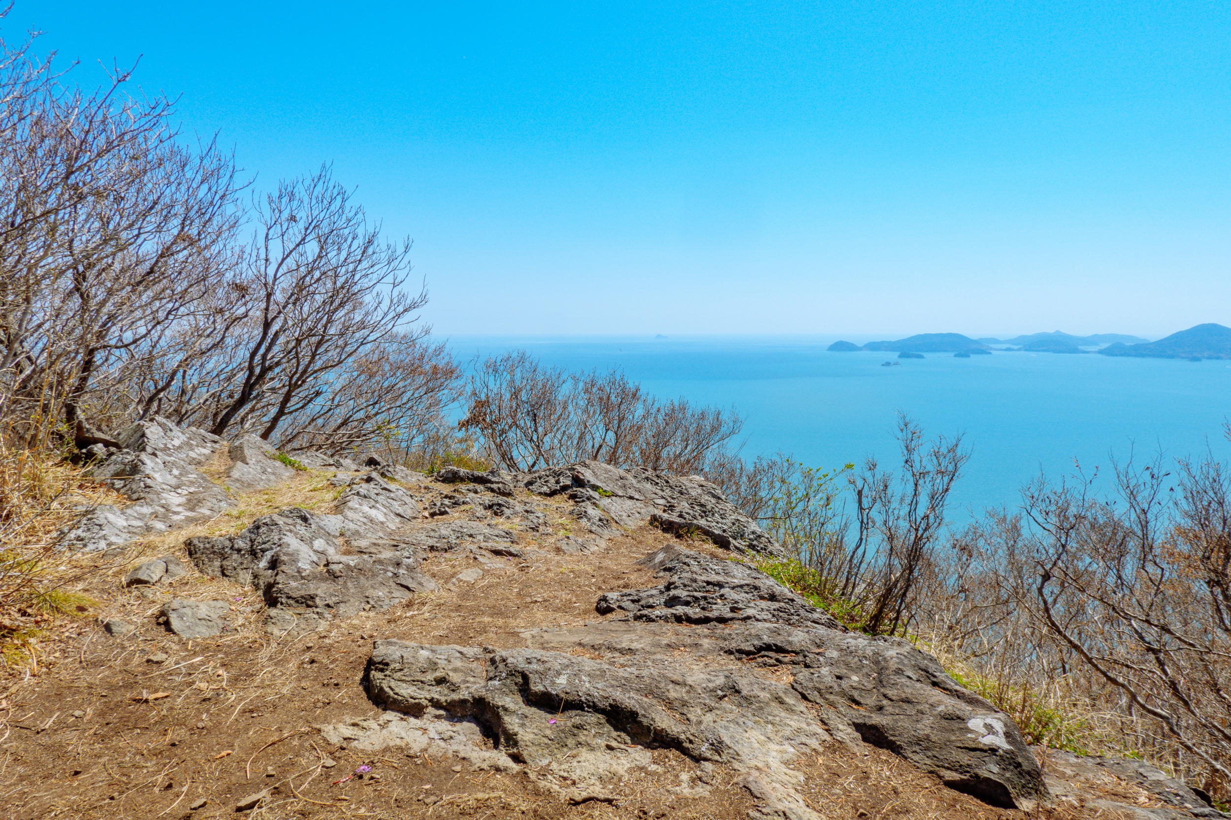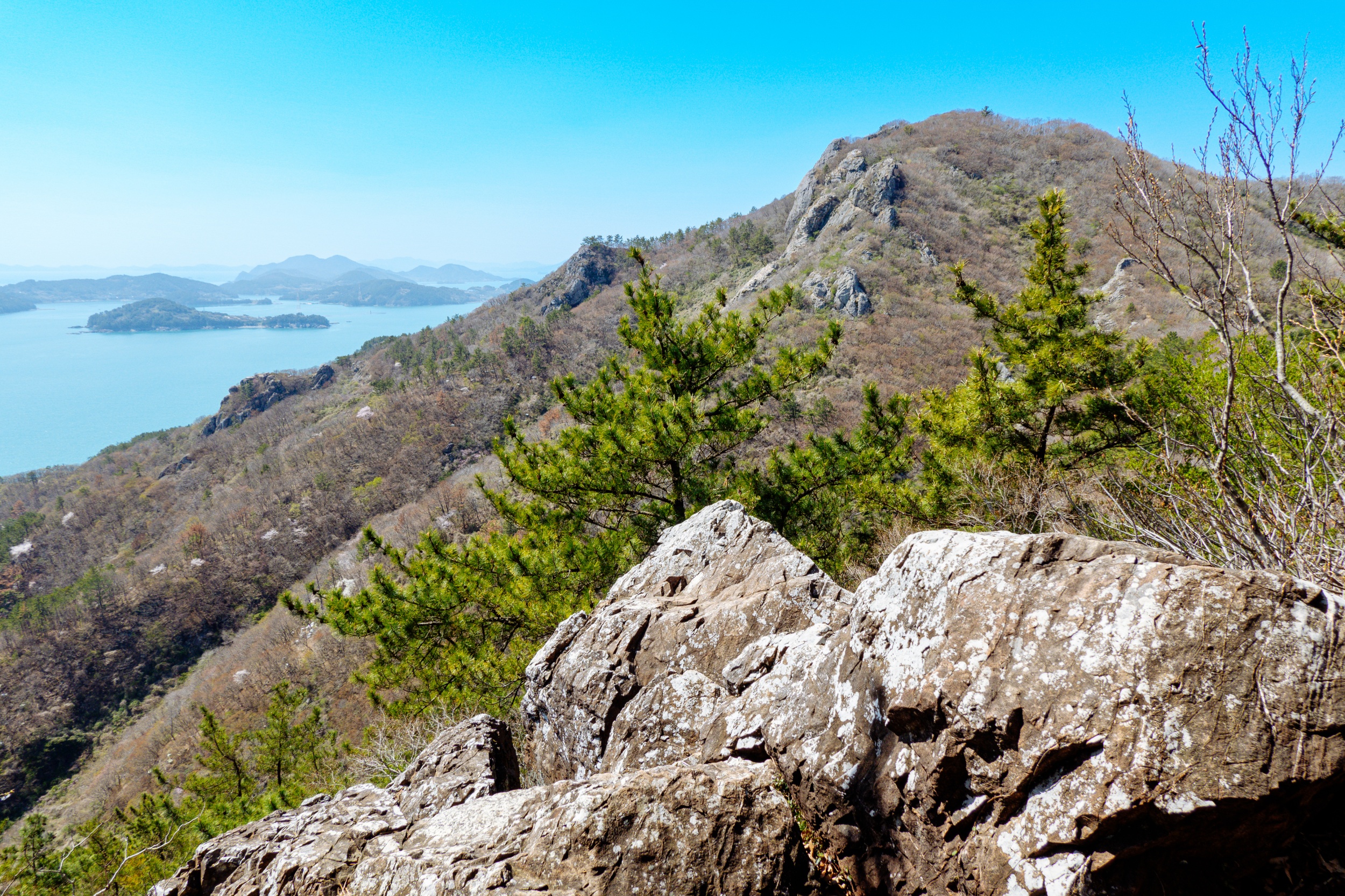 금오봉 정상에서 얼마 지나지 않아 다도해 짙푸른 바다 조망이 펼쳐집니다.