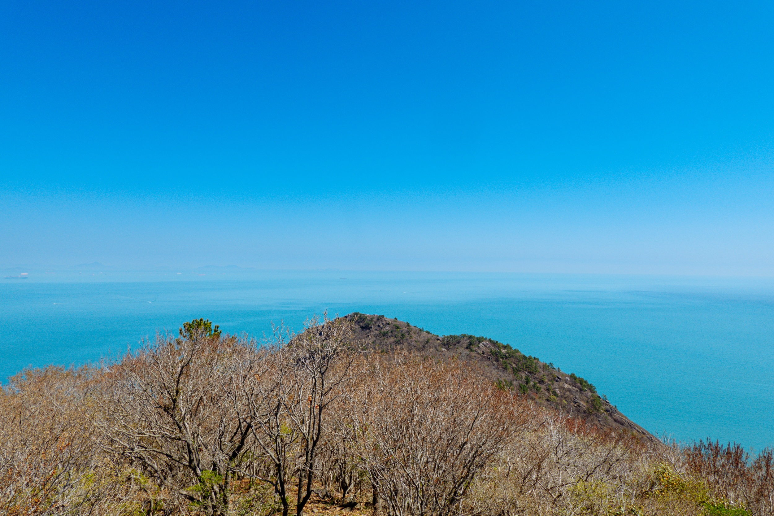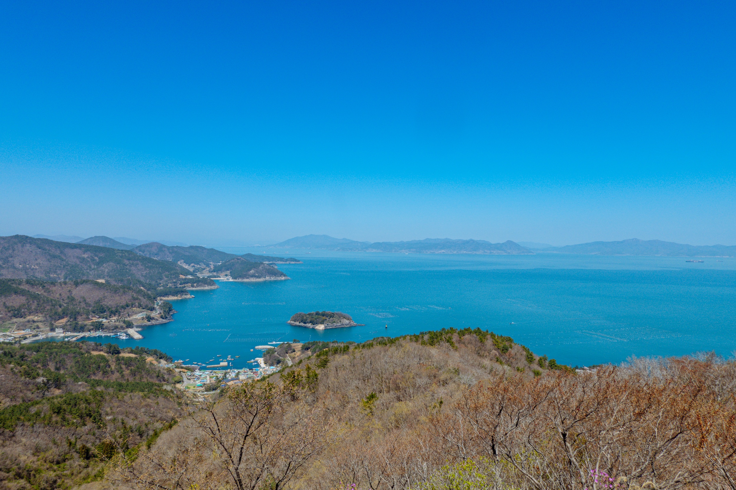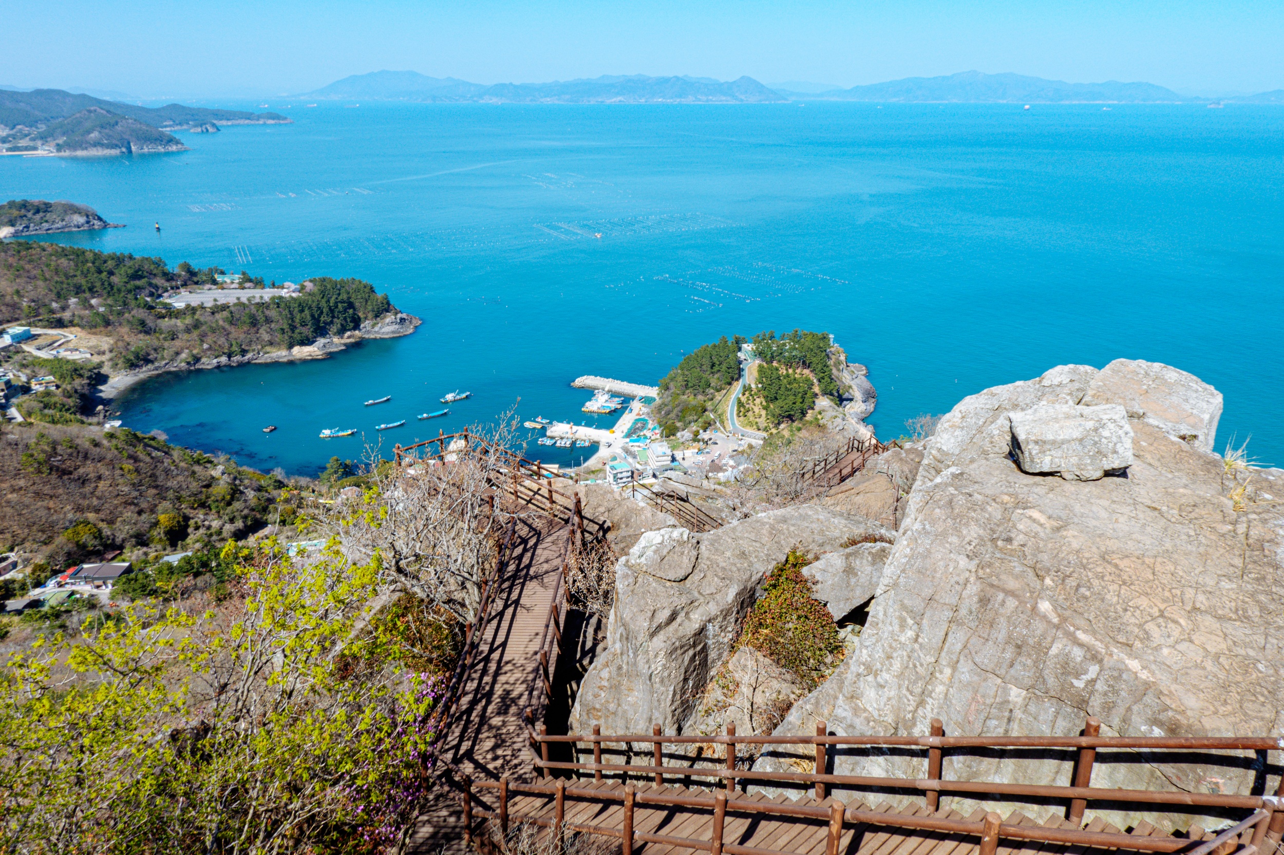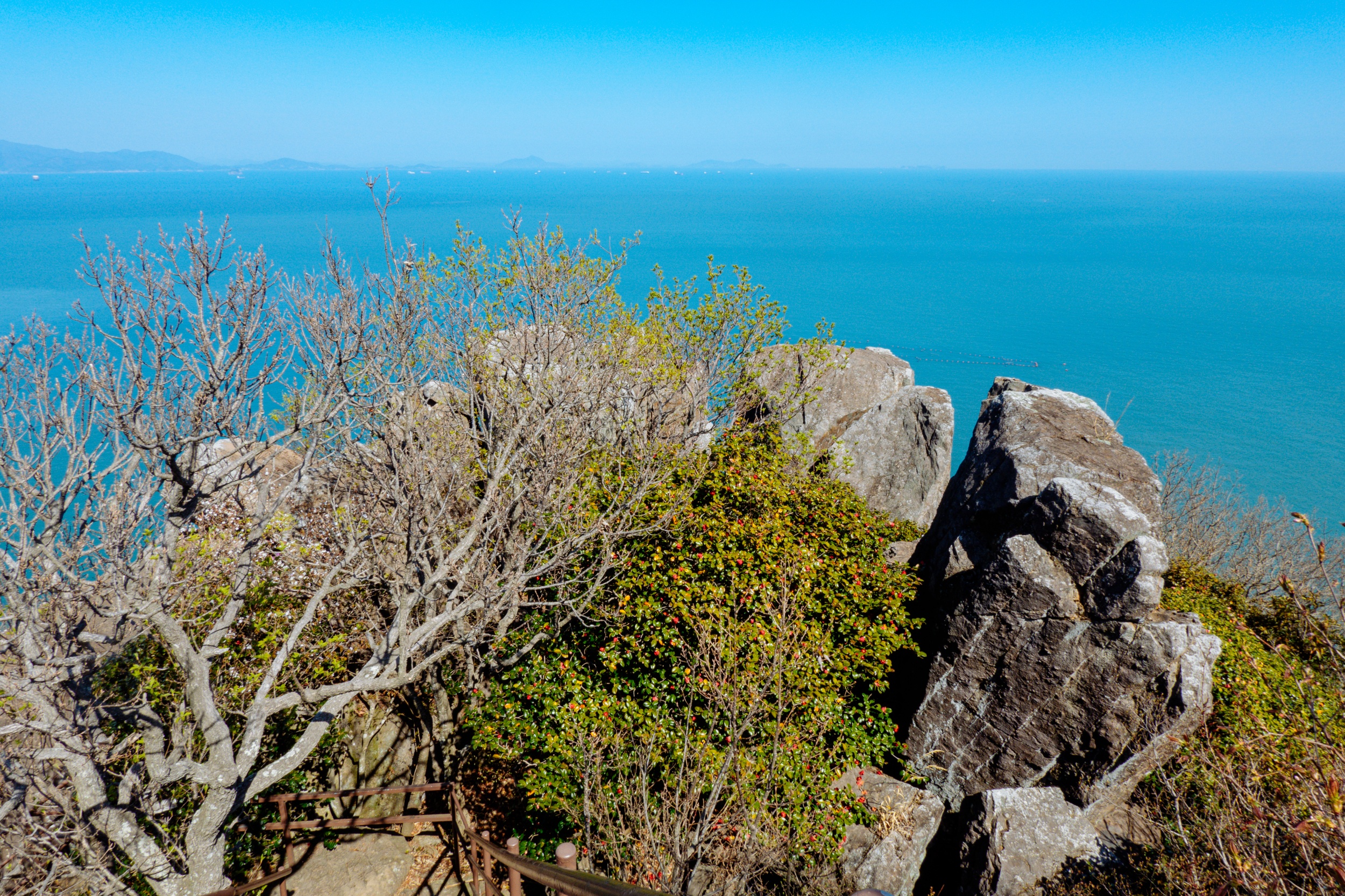 금오봉 정상에서 얼마 지나지 않아 다도해 짙푸른 바다 조망이 펼쳐집니다.
