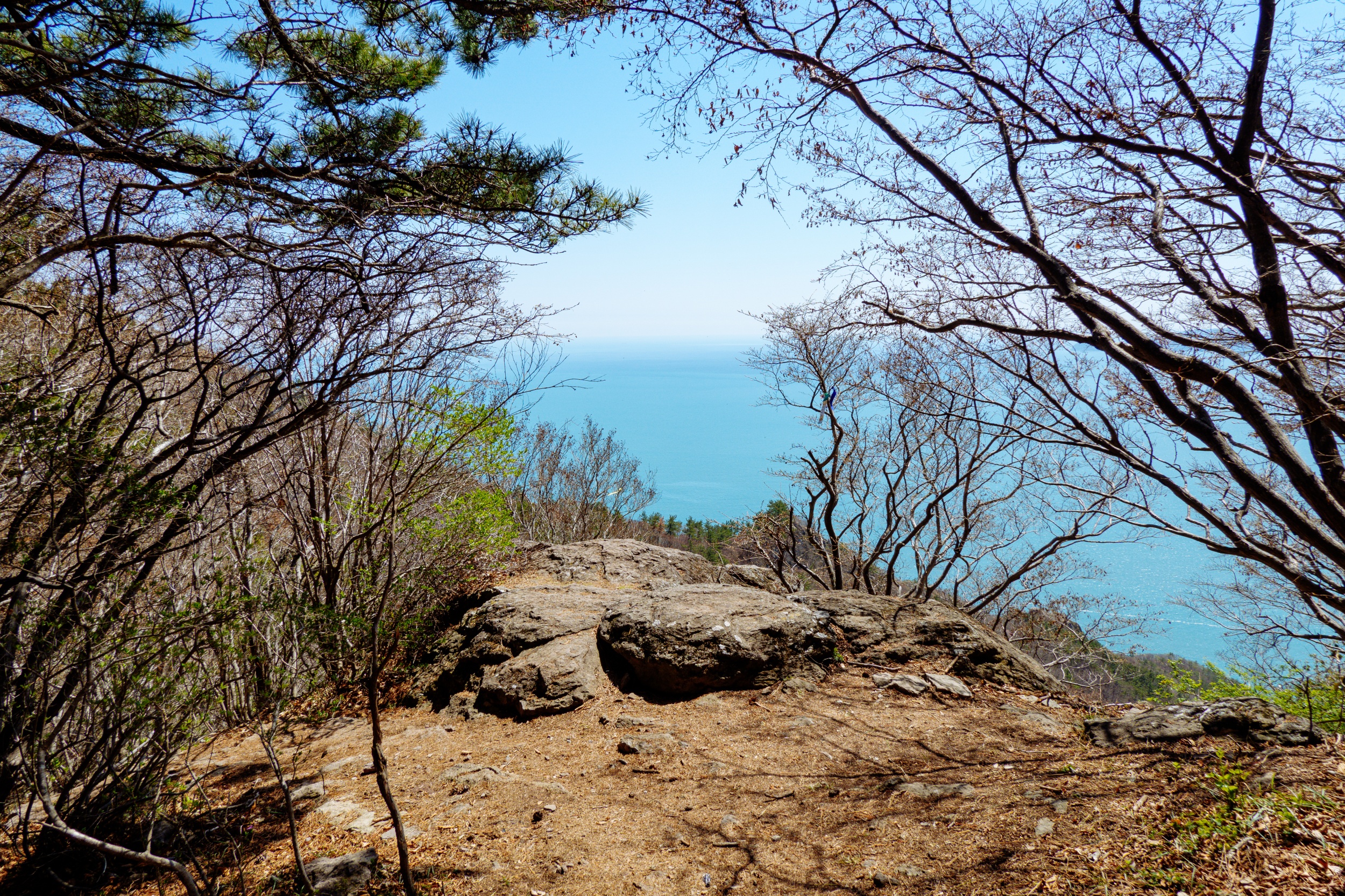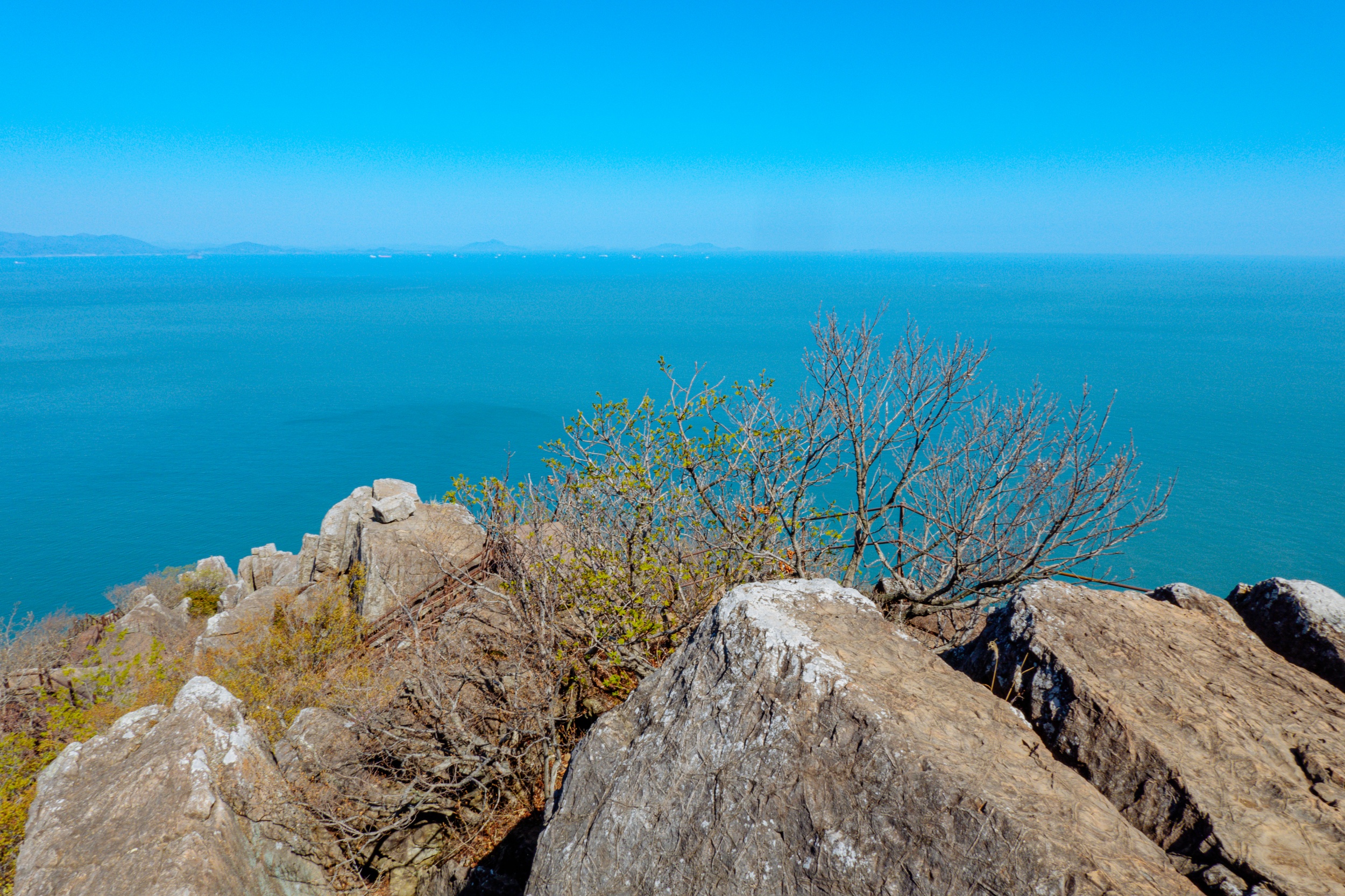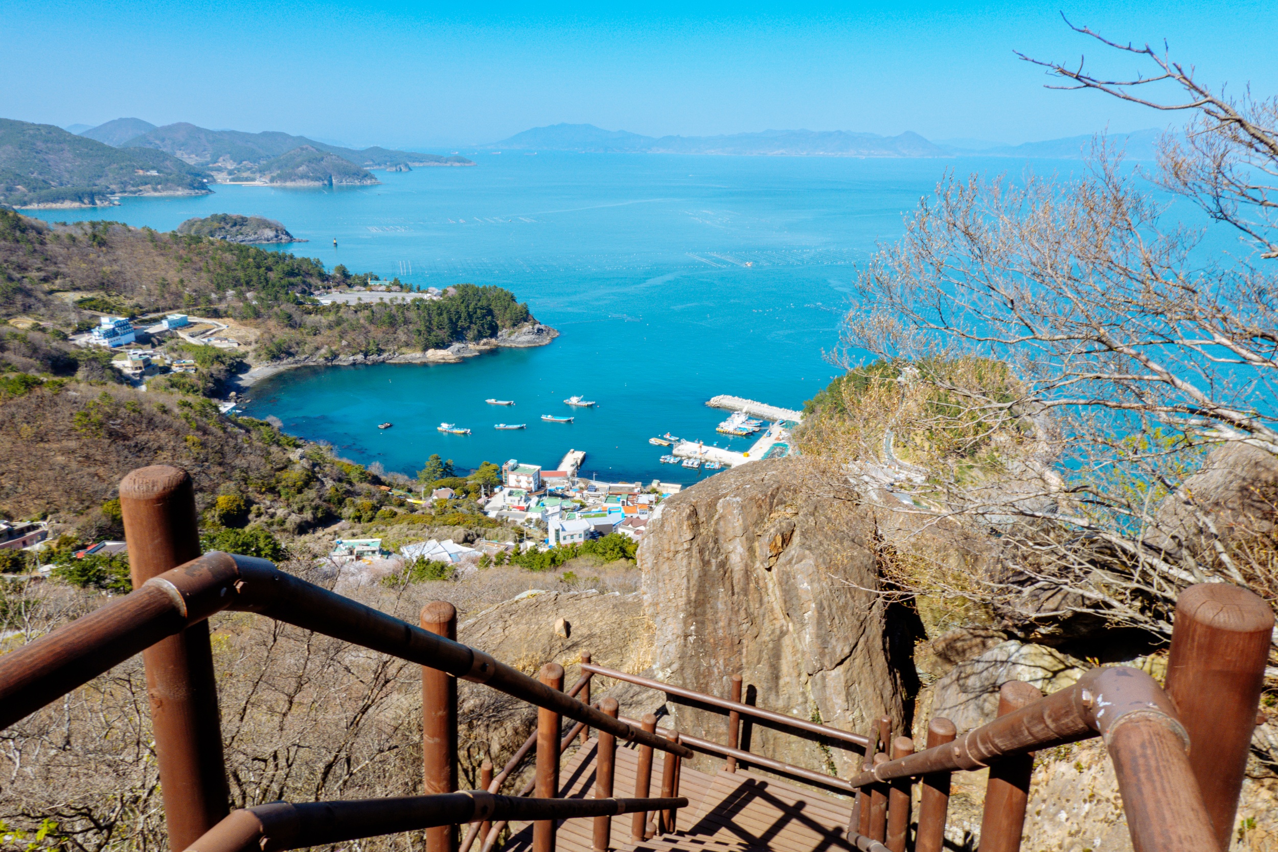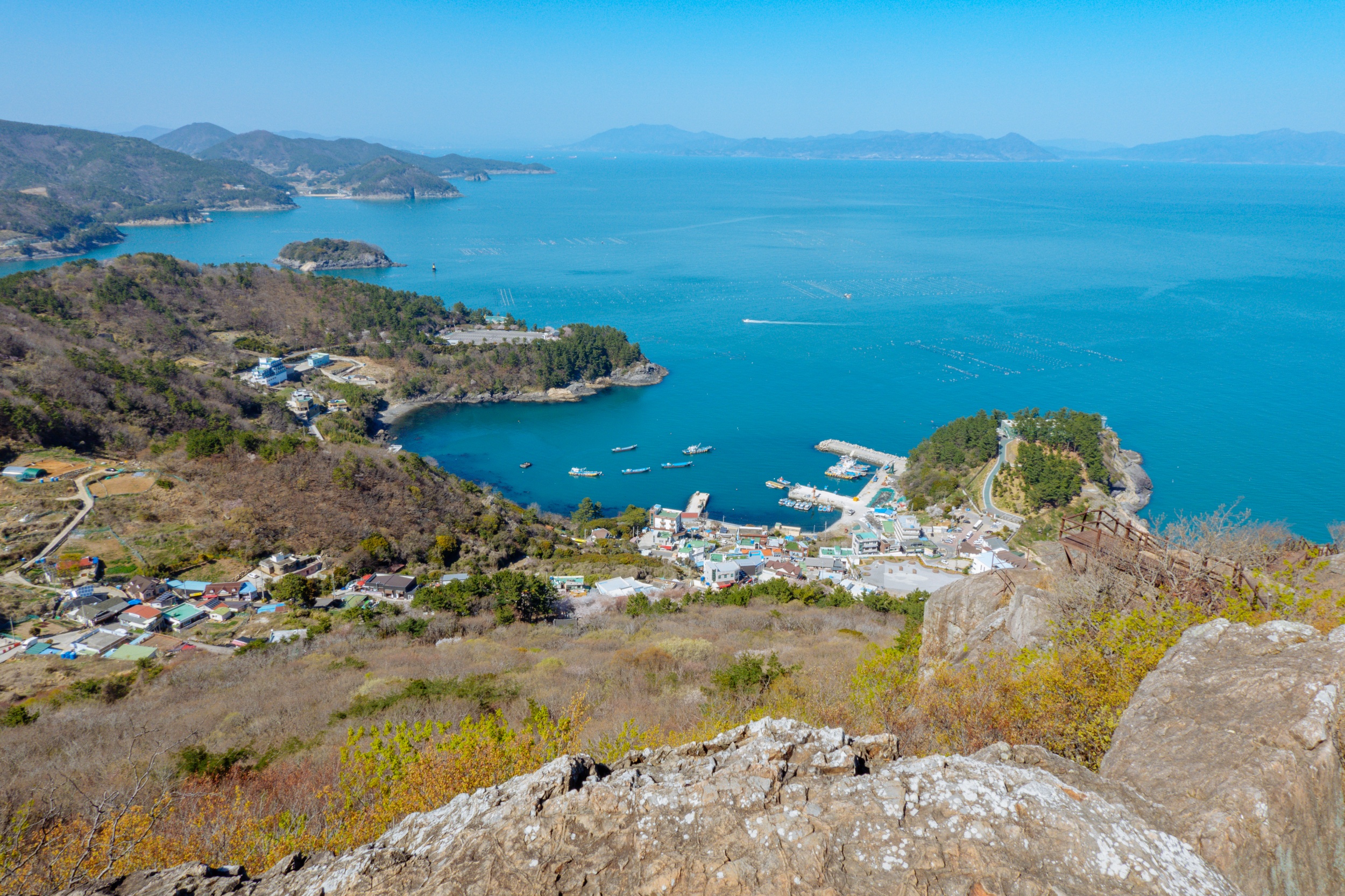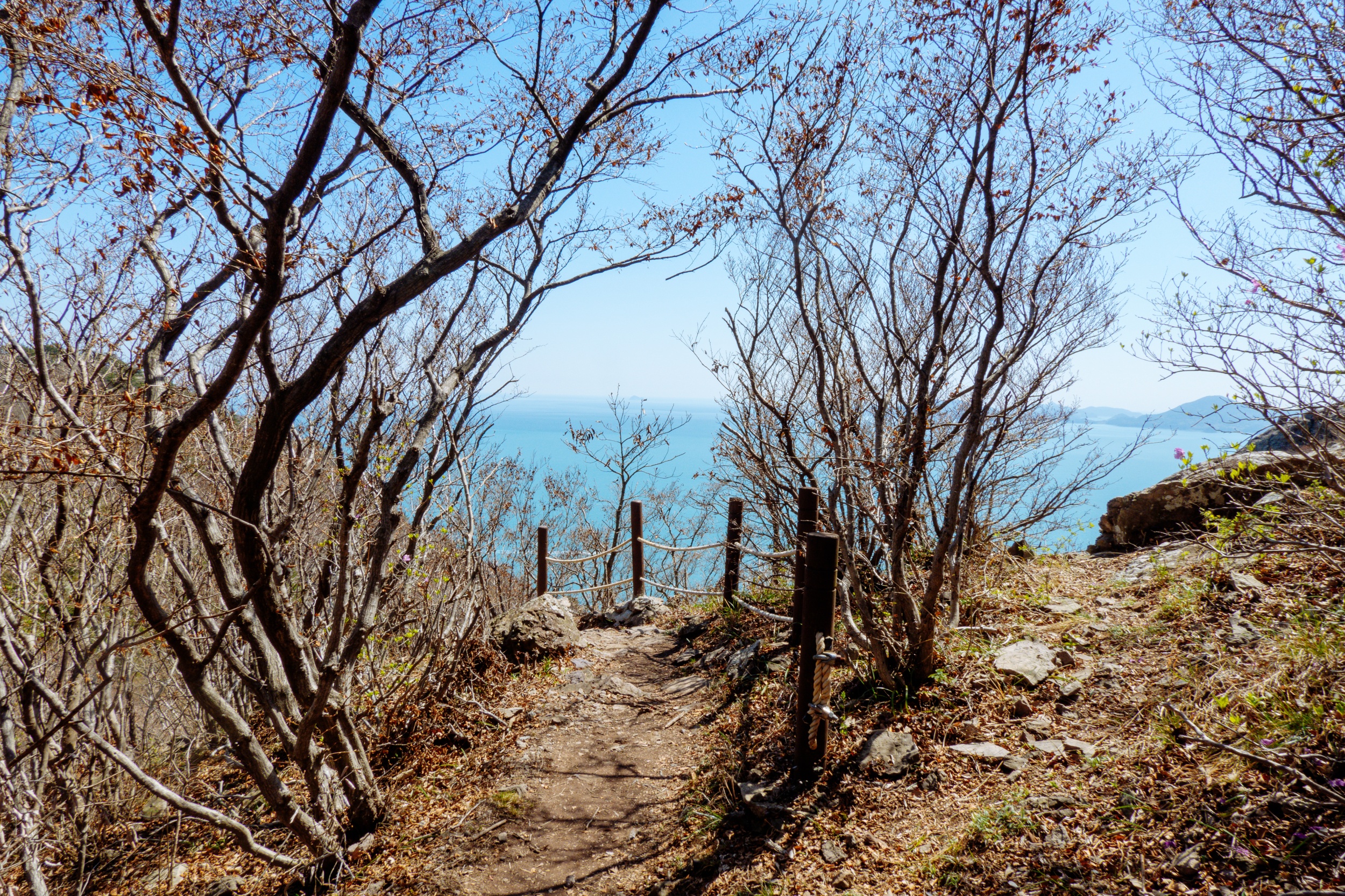 금오봉 정상에서 얼마 지나지 않아 다도해 짙푸른 바다 조망이 펼쳐집니다.