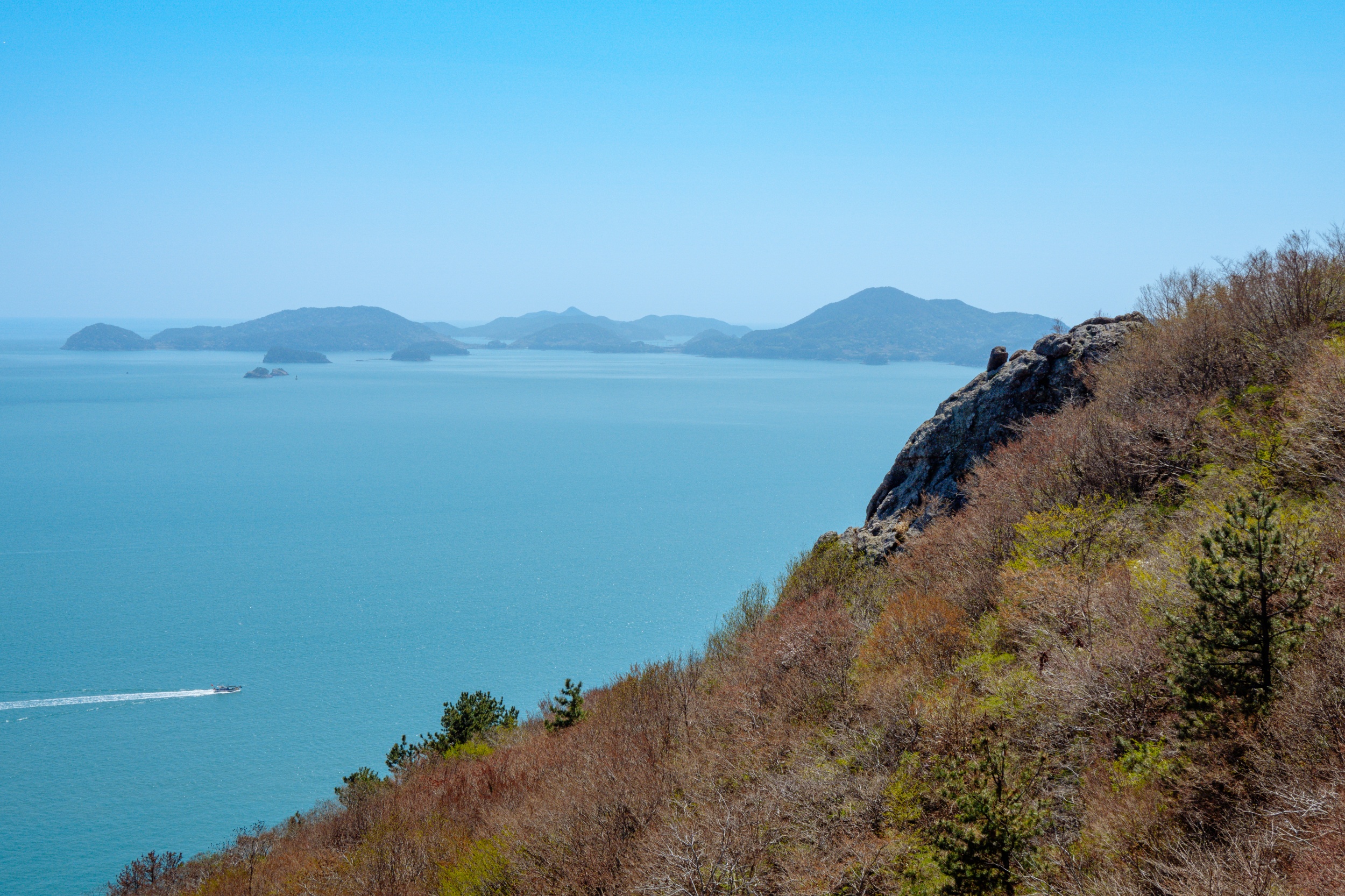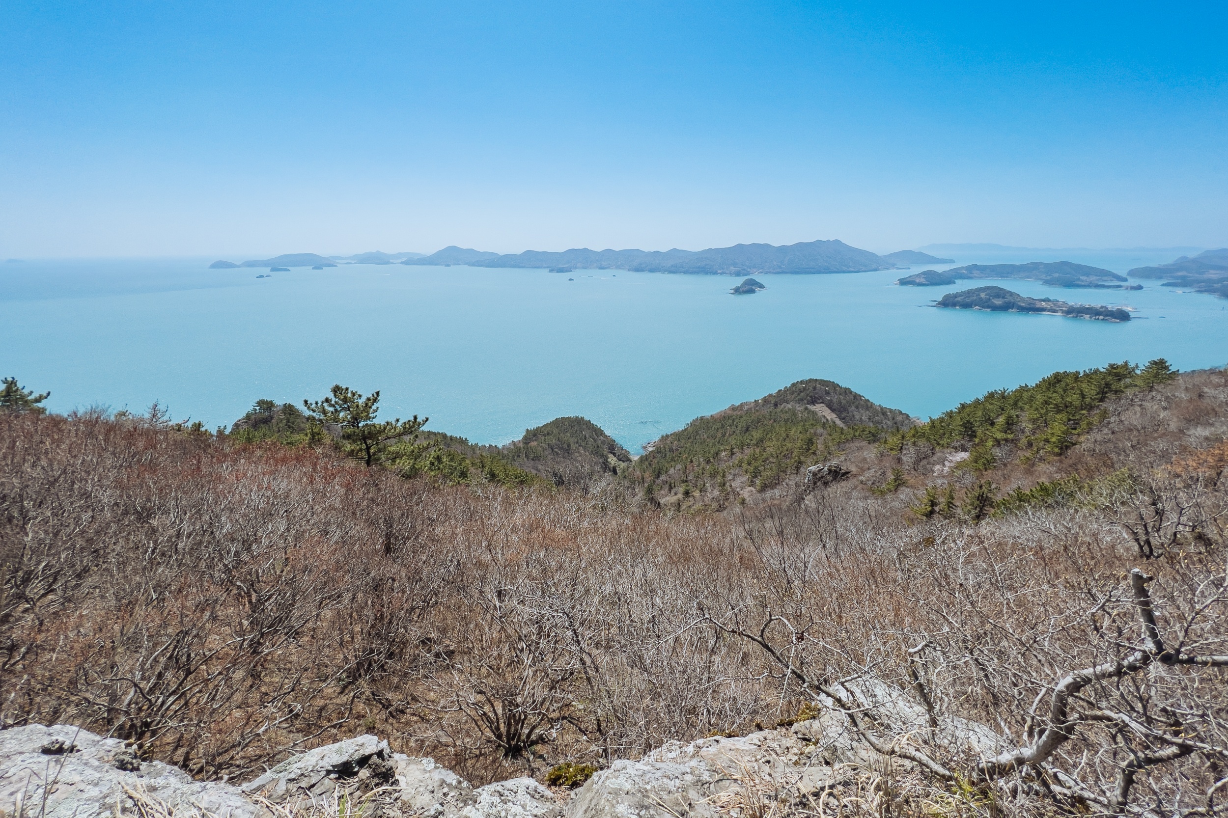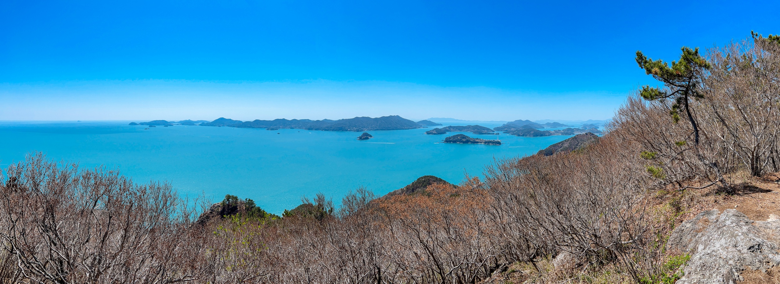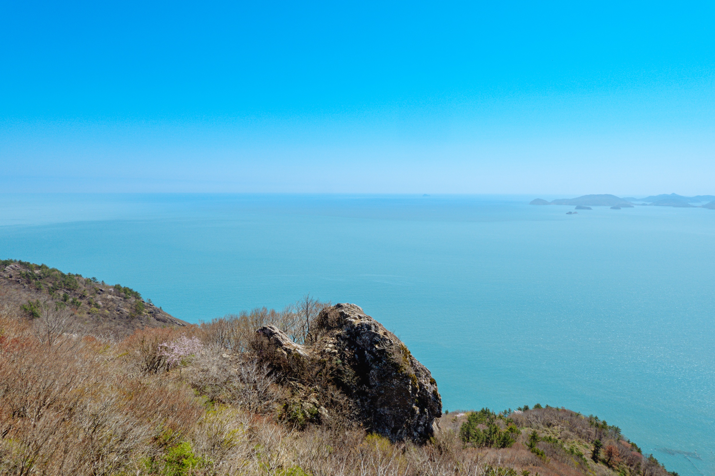 바위 위에 선 소나무에서 다도해국립공원 섬을 조망합니다.