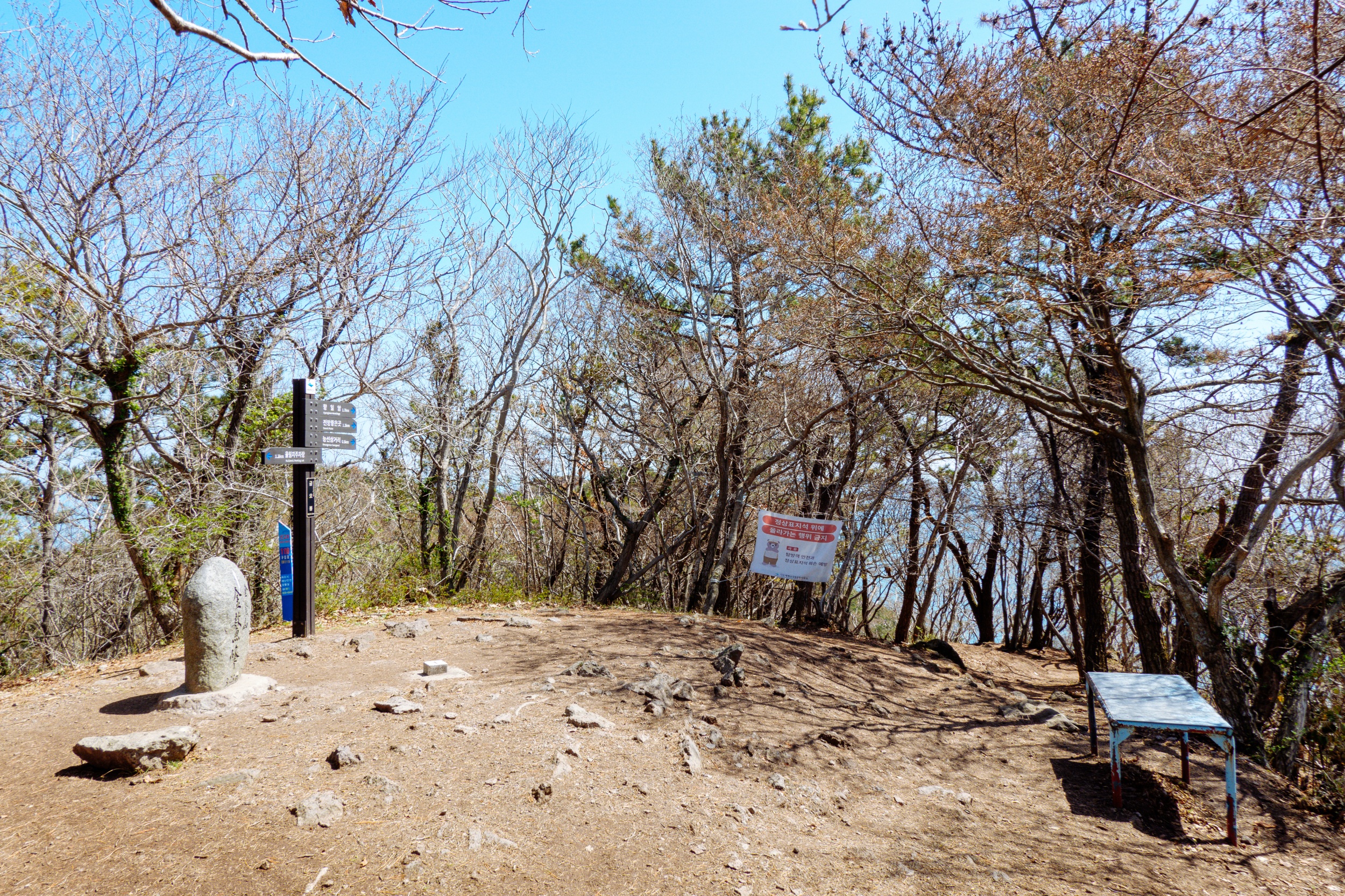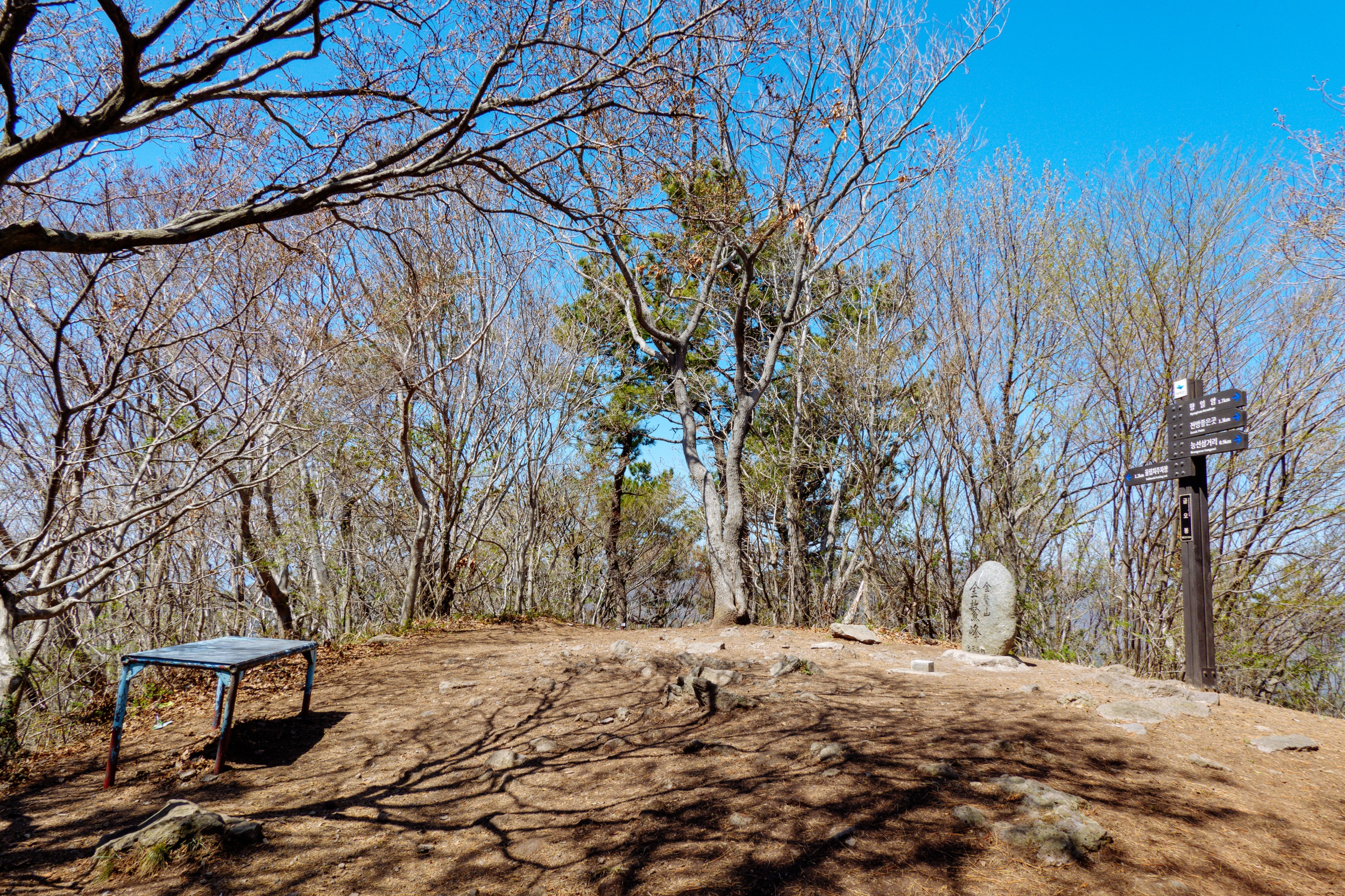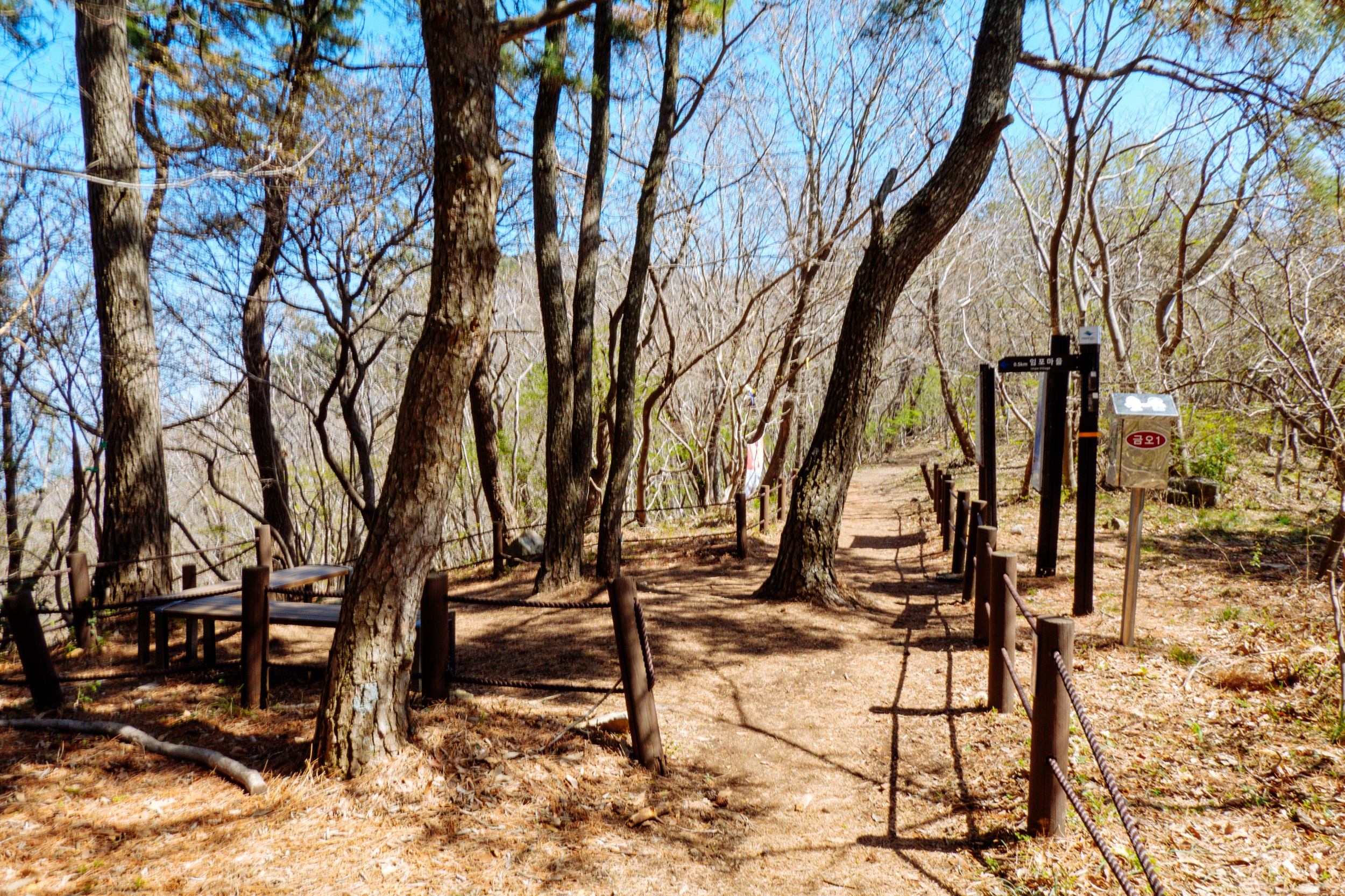 금오봉에 도착하니 앉아 쉴 수 있는 벤치가 있는데 조망이 없습니다.