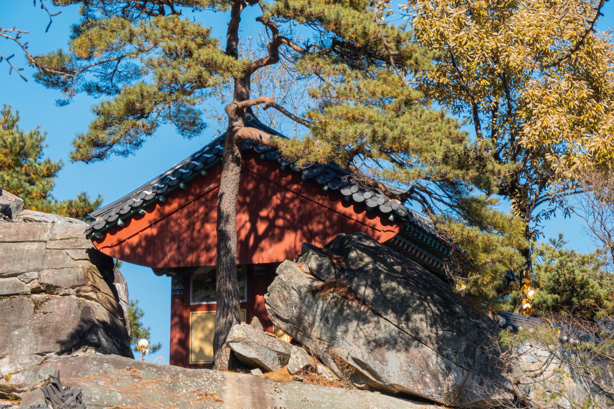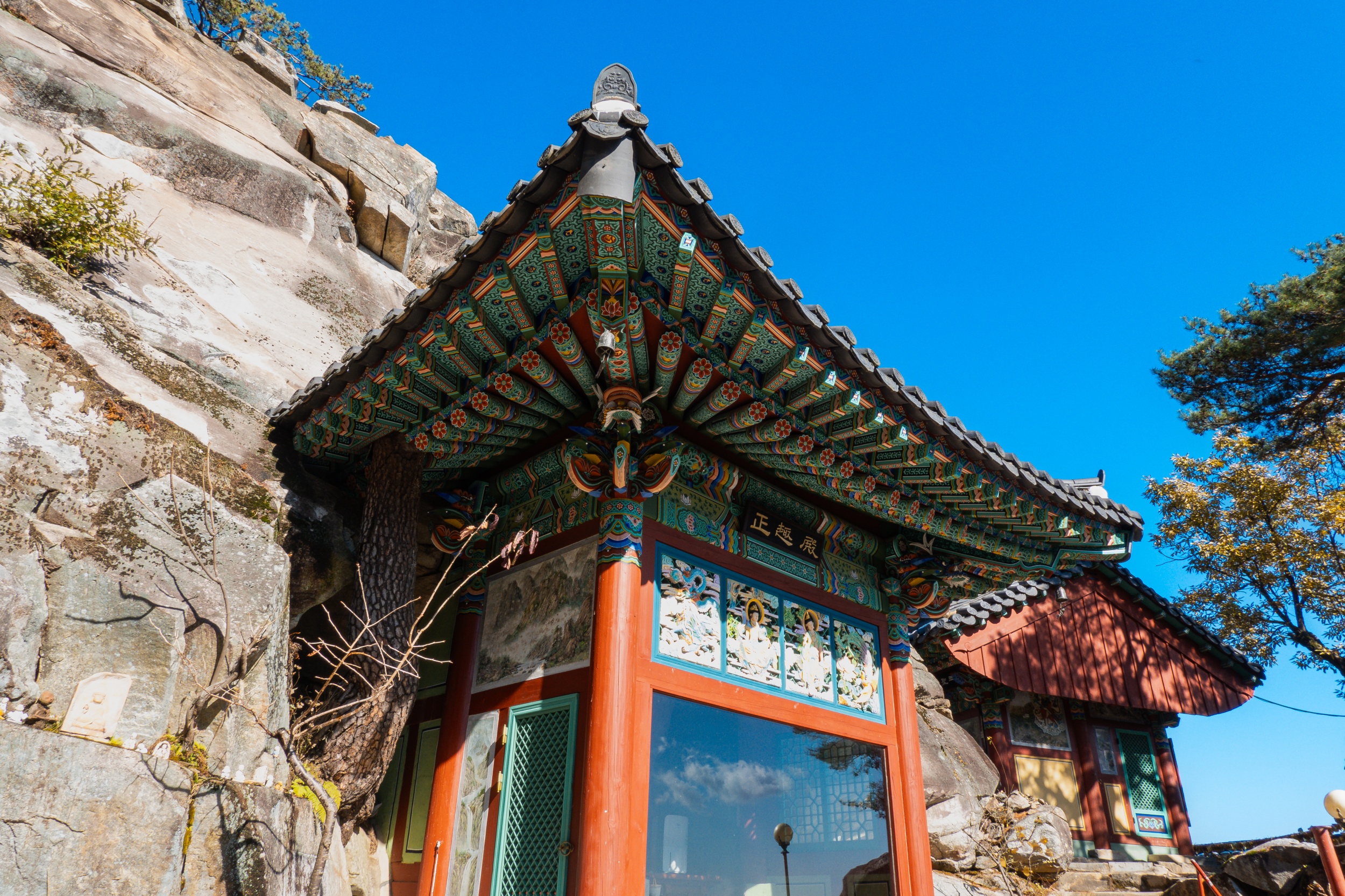 정취암 삼성각 안에는 바깥을 볼 수 있게 통유리창이 뚫어져 있는데 호랑이를 타고 있는 석조 산신상을 볼 수 있습니다. 그 뒤로 조선 순조 때 제작된 호랑이를 타고 있는 산신탱화가 보관되어 있는데 원본은 해인사에 보관되어 있다고 해요.
