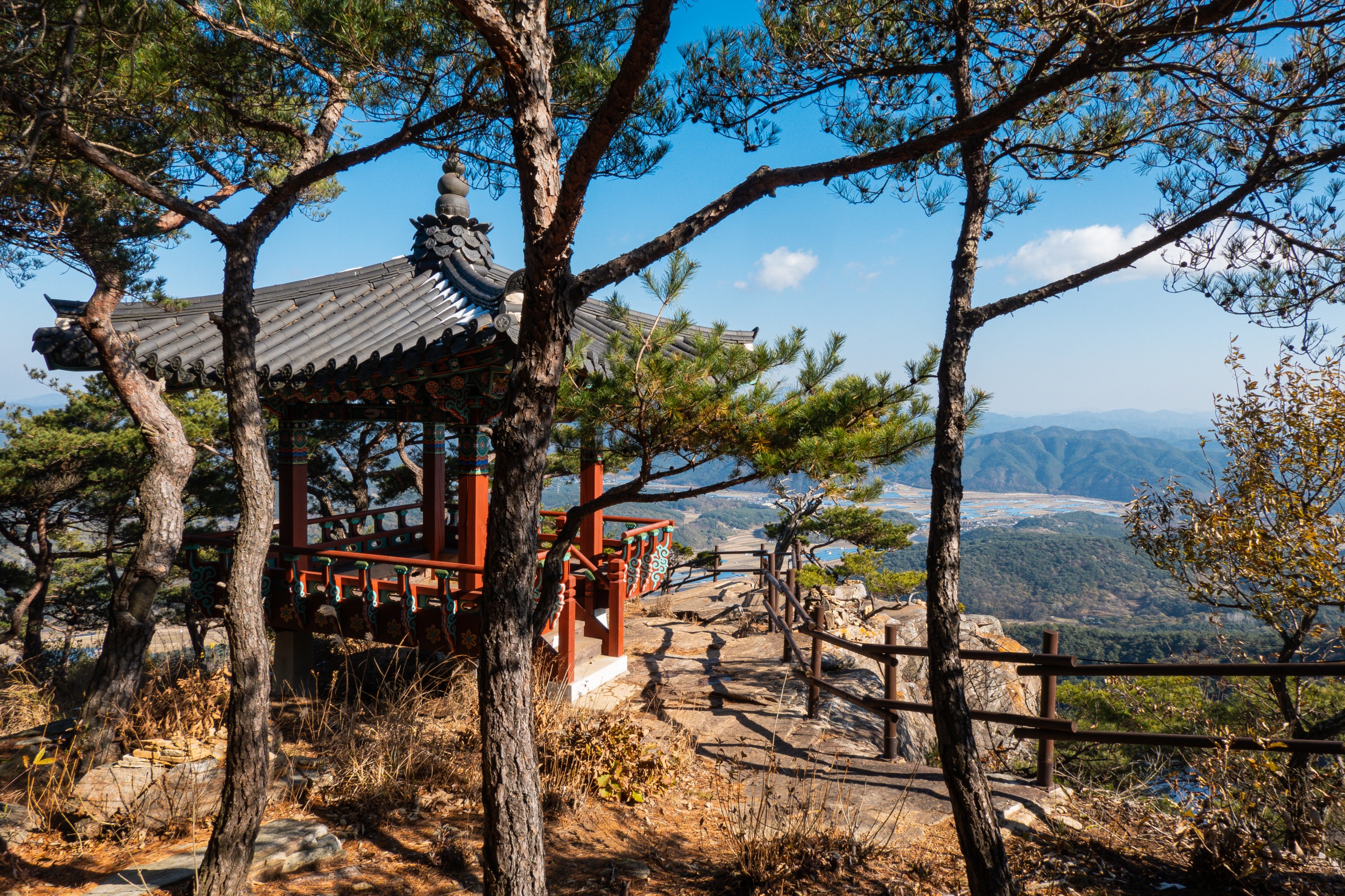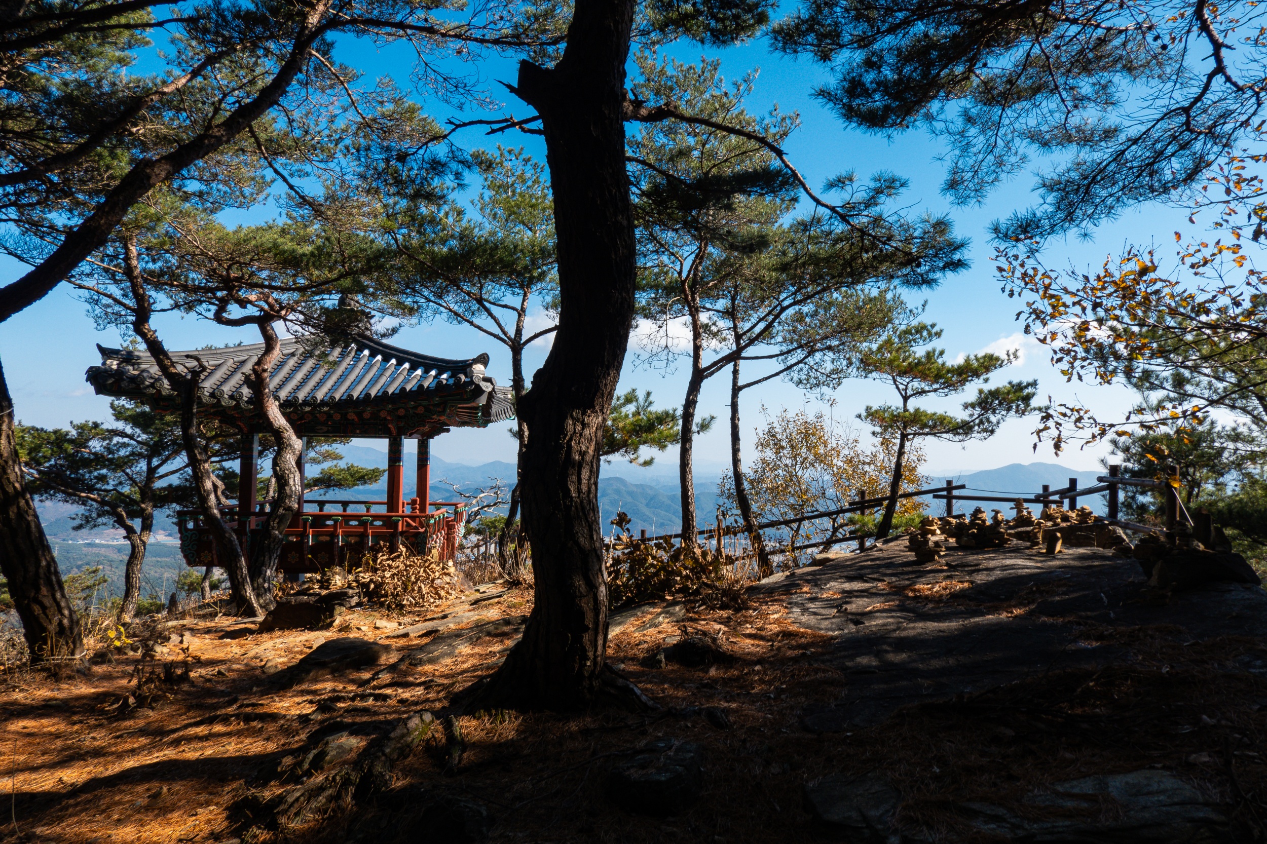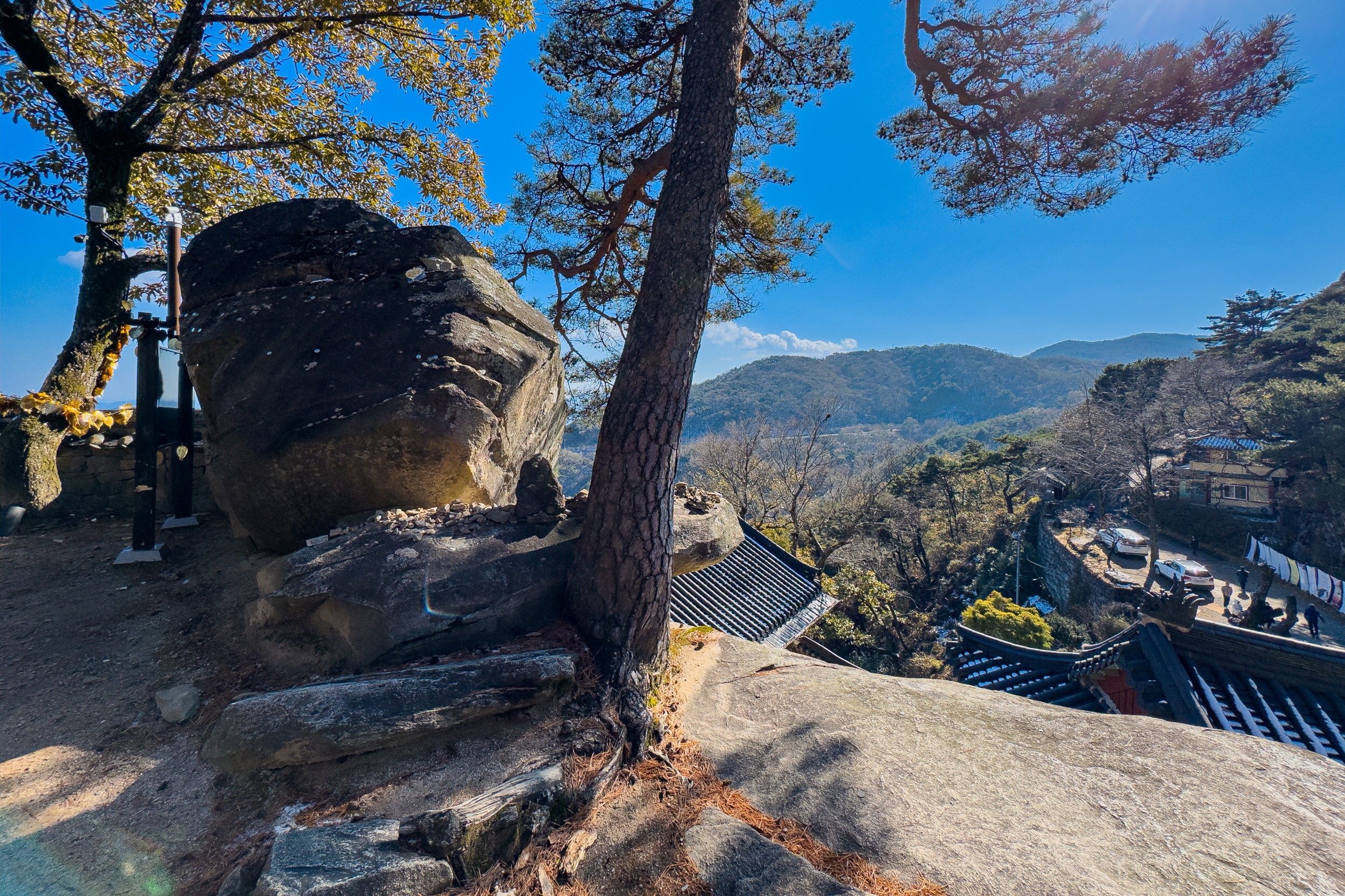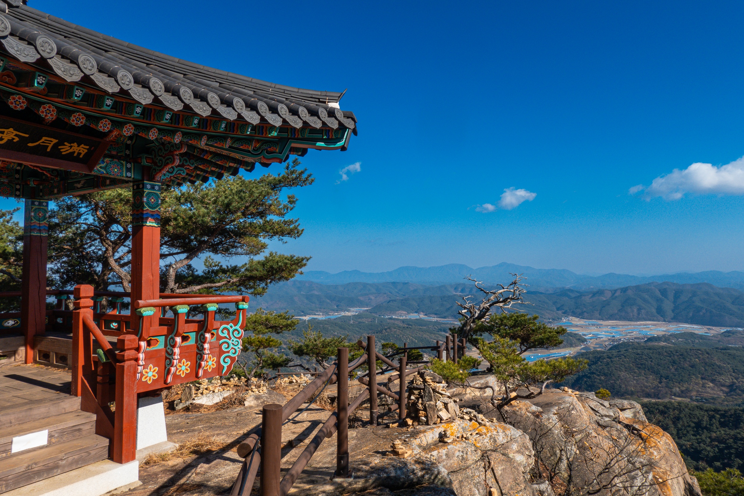 응진전 옆 오솔길을 따라 10분 정도 오르다 보면 기암절벽의 정상에 있는 만월정이 나오며 너럭바위 발 아래로 산청의 들녘과 산길이 시원스레 펼쳐져 있어 시원함과 함께 적막과 고요 속에서 속세를 벗어난 느낌입니다.