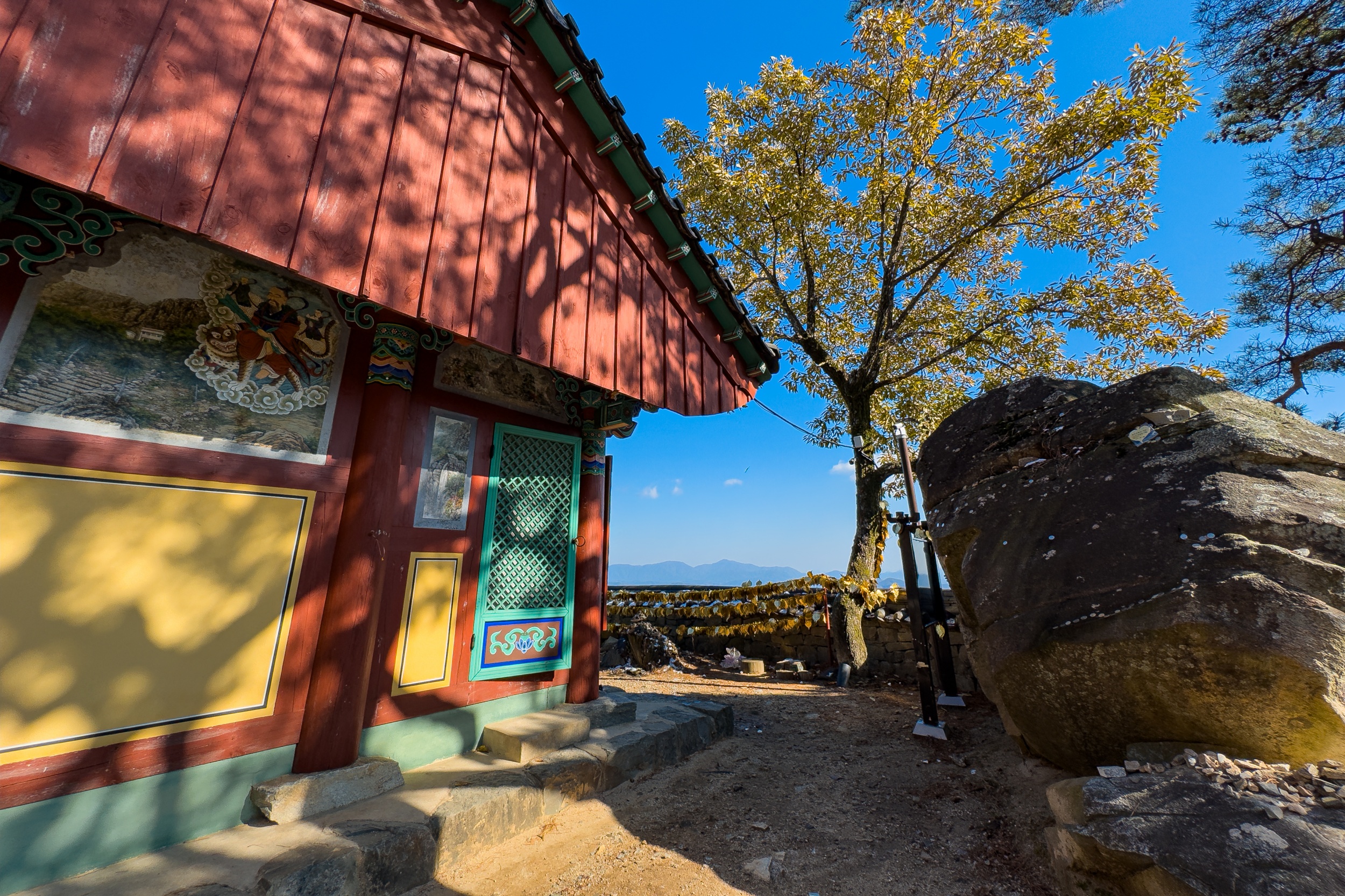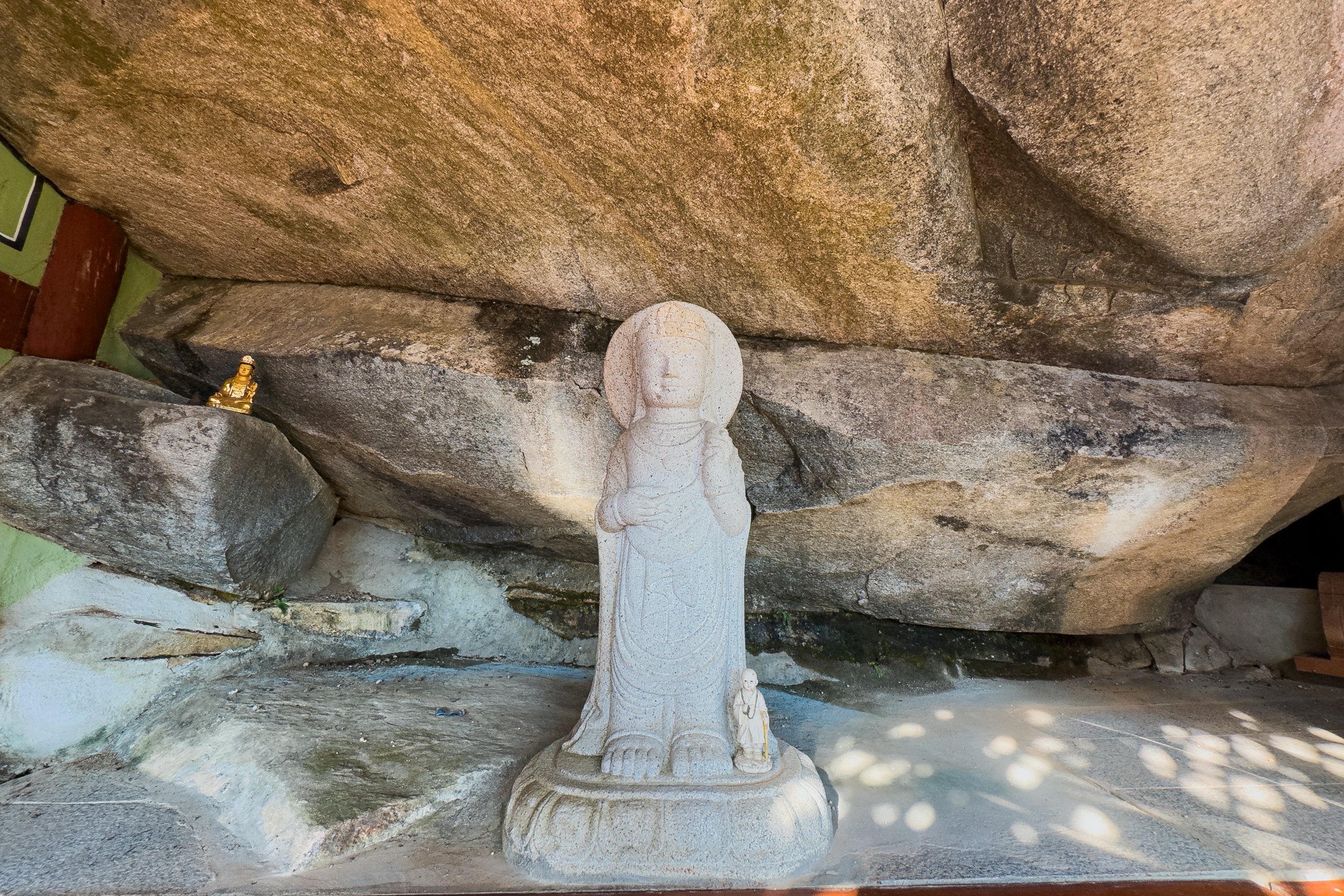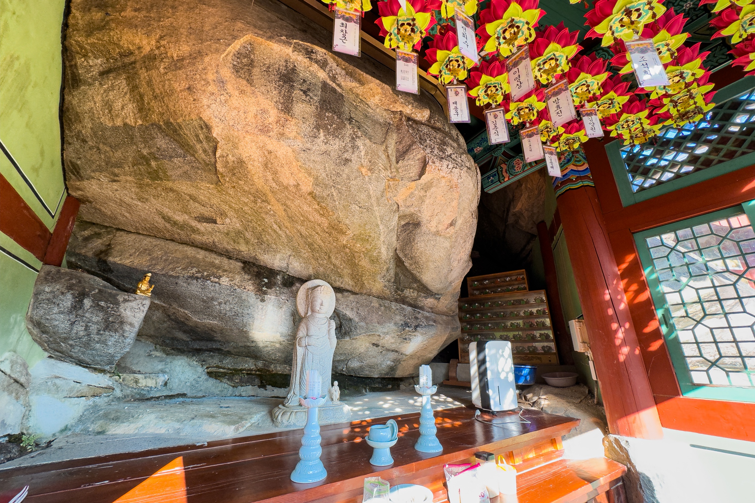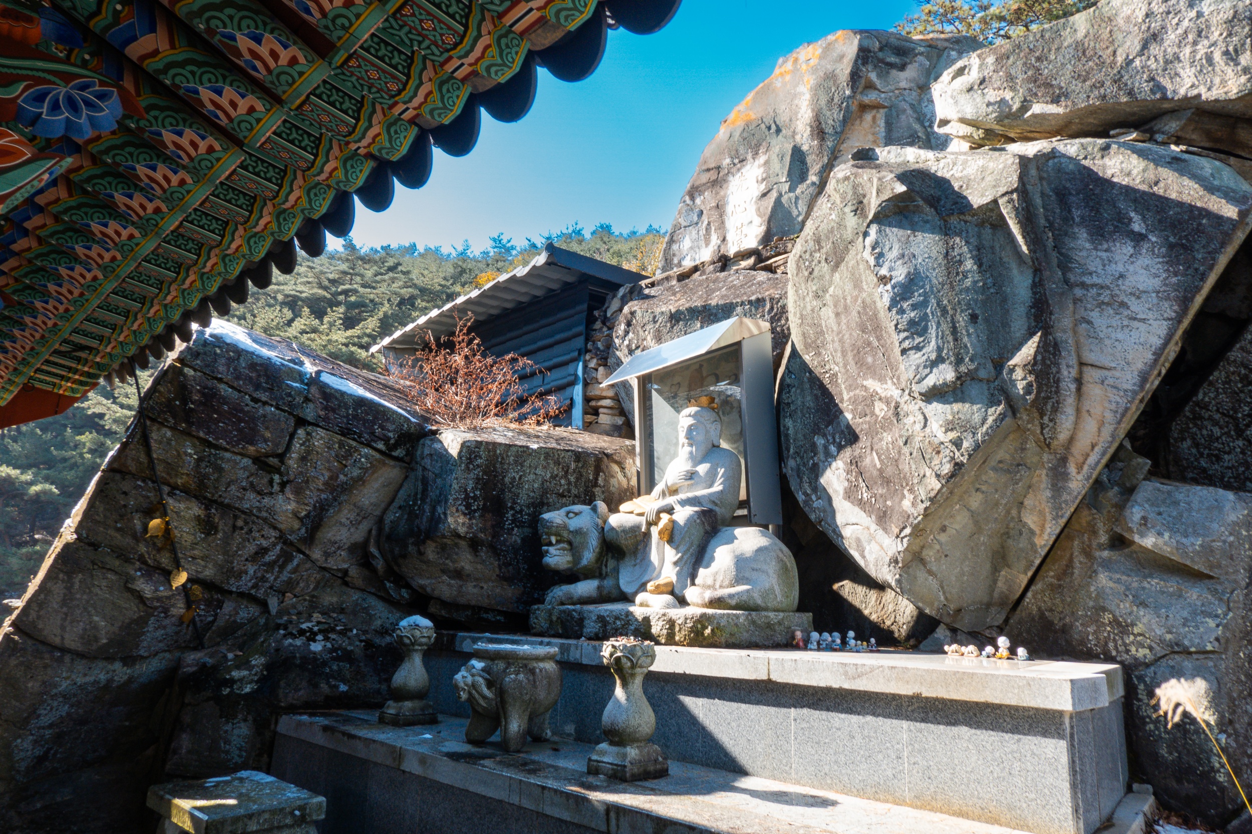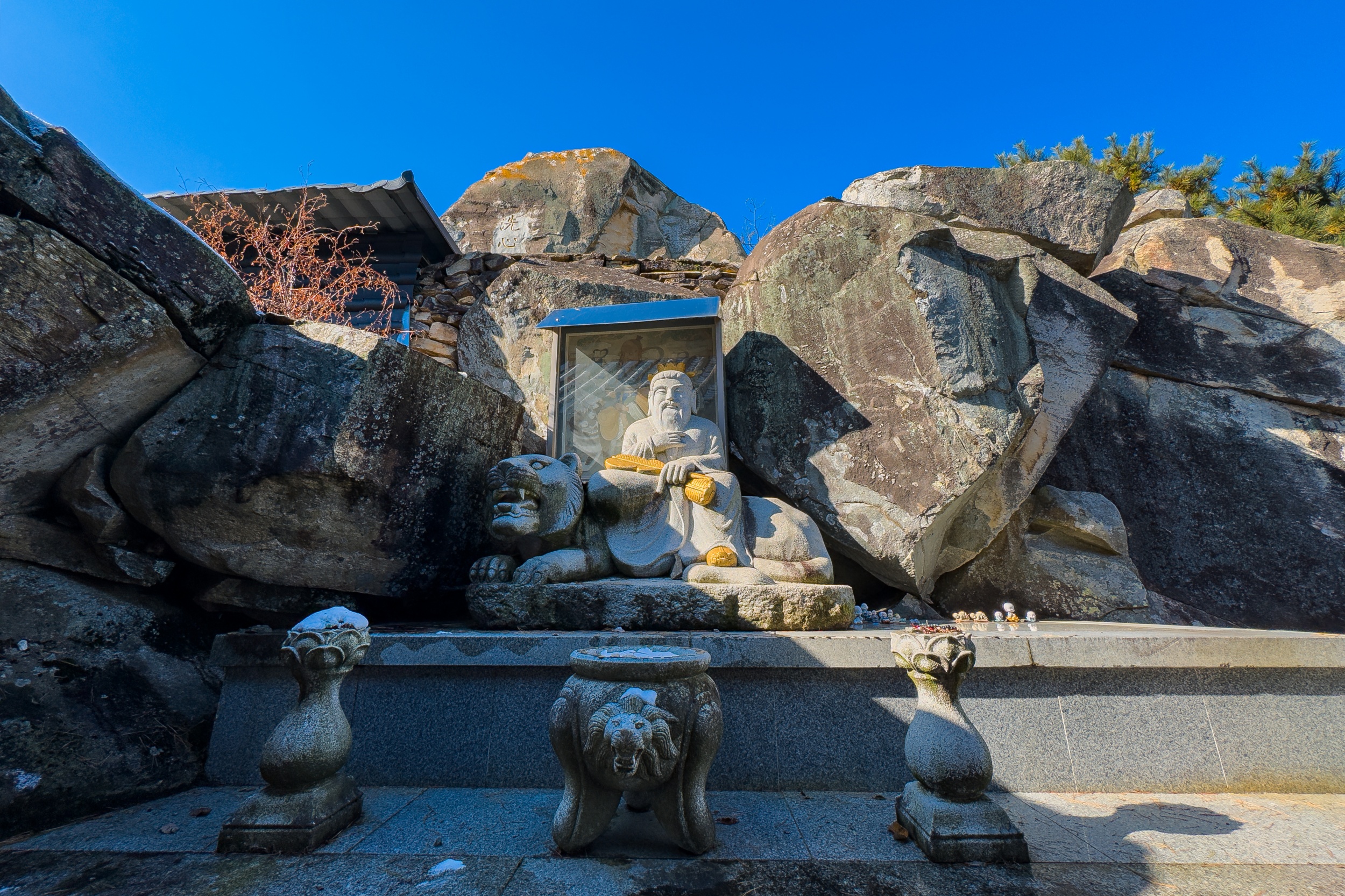 정취암 삼성각 안에는 바깥을 볼 수 있게 통유리창이 뚫어져 있는데 호랑이를 타고 있는 석조 산신상을 볼 수 있습니다. 그 뒤로 조선 순조 때 제작된 호랑이를 타고 있는 산신탱화가 보관되어 있는데 원본은 해인사에 보관되어 있다고 해요.