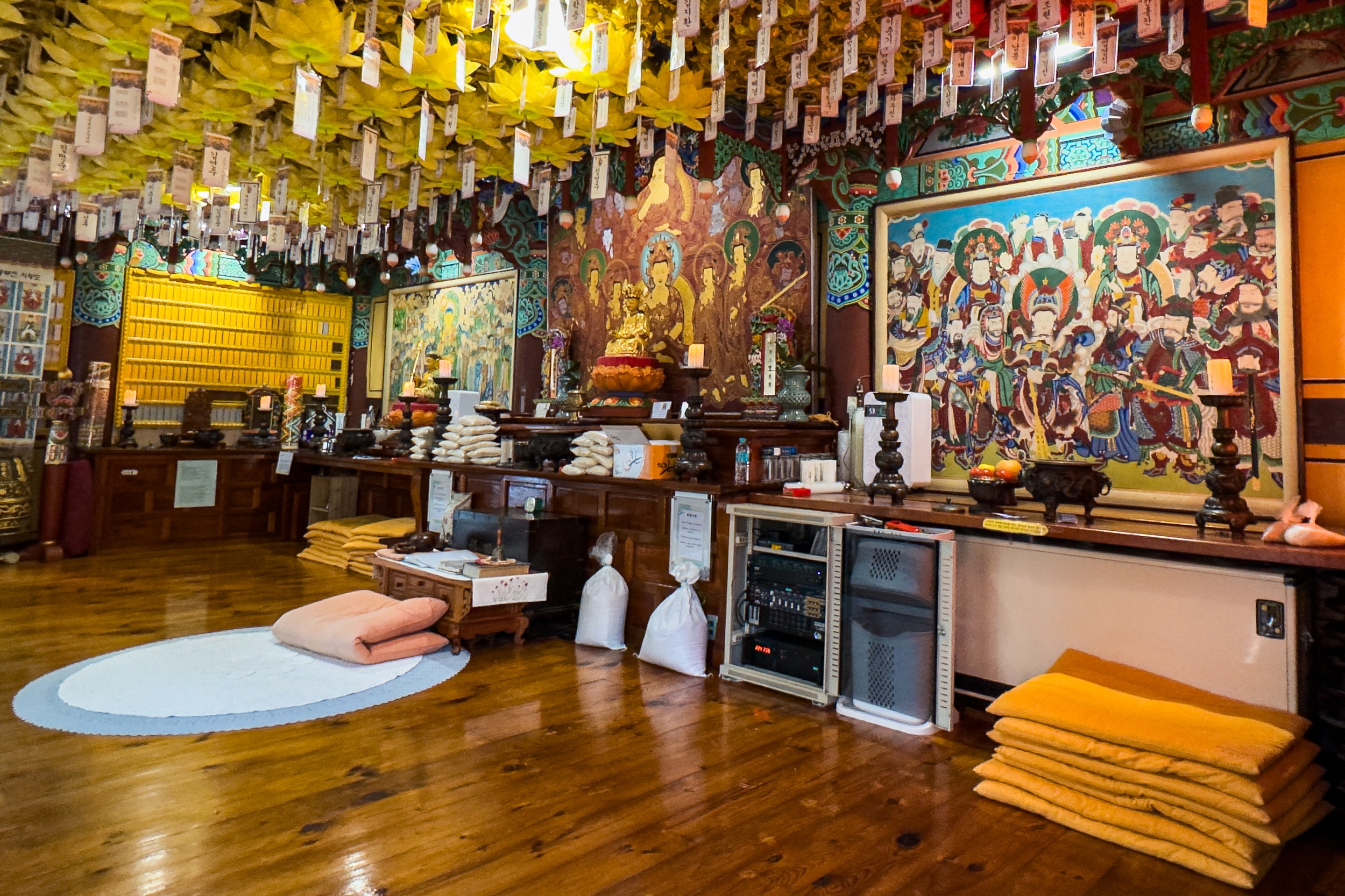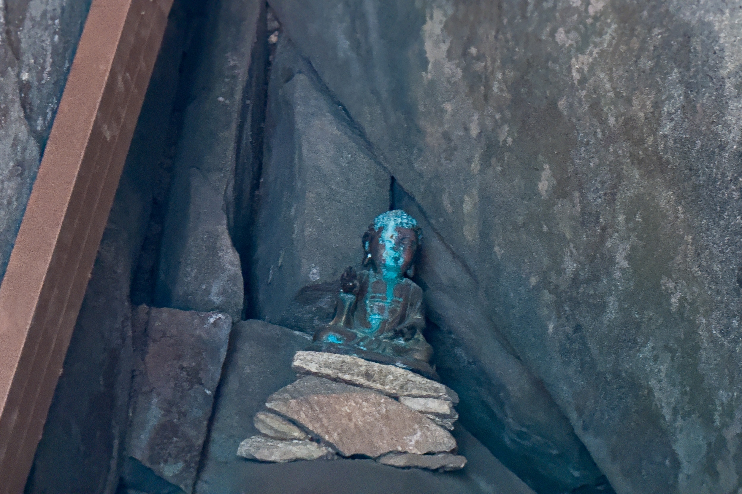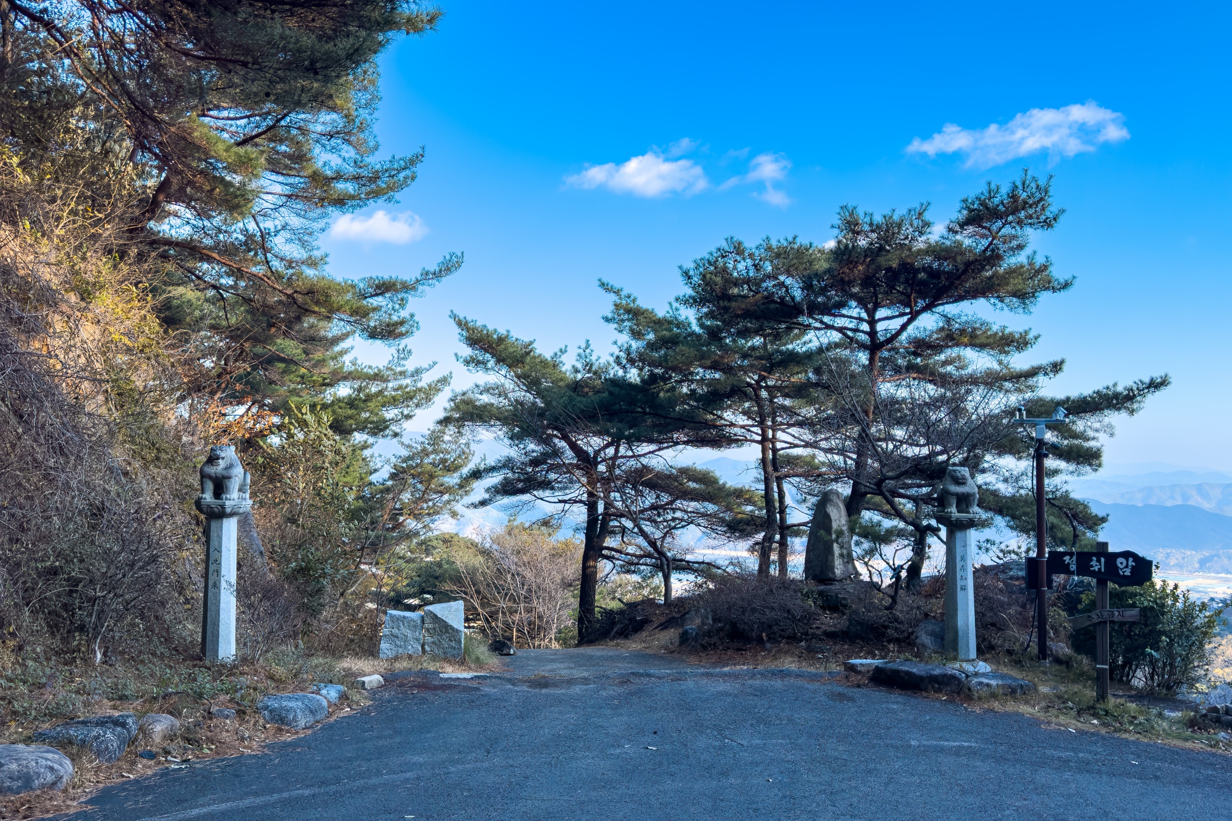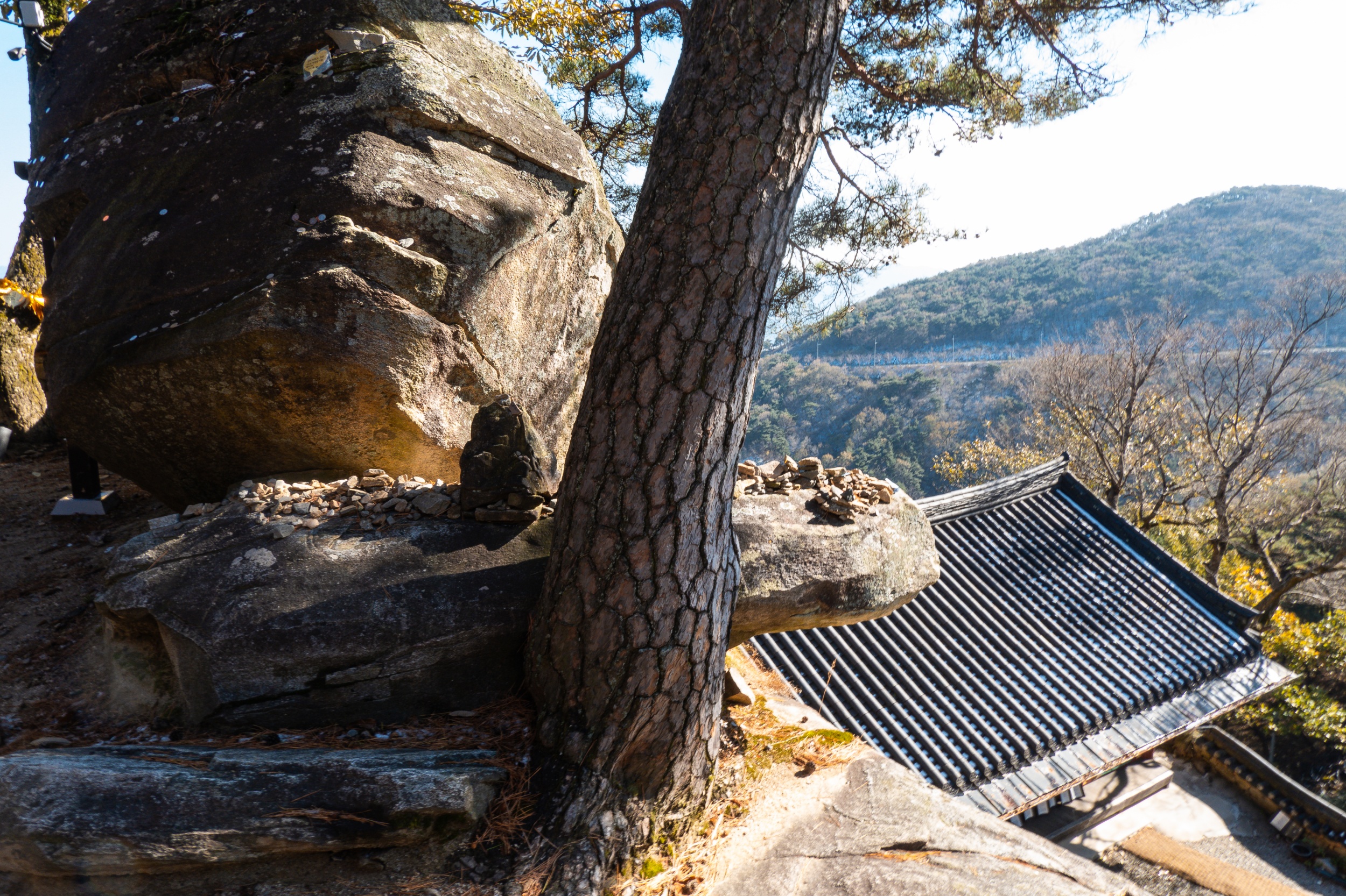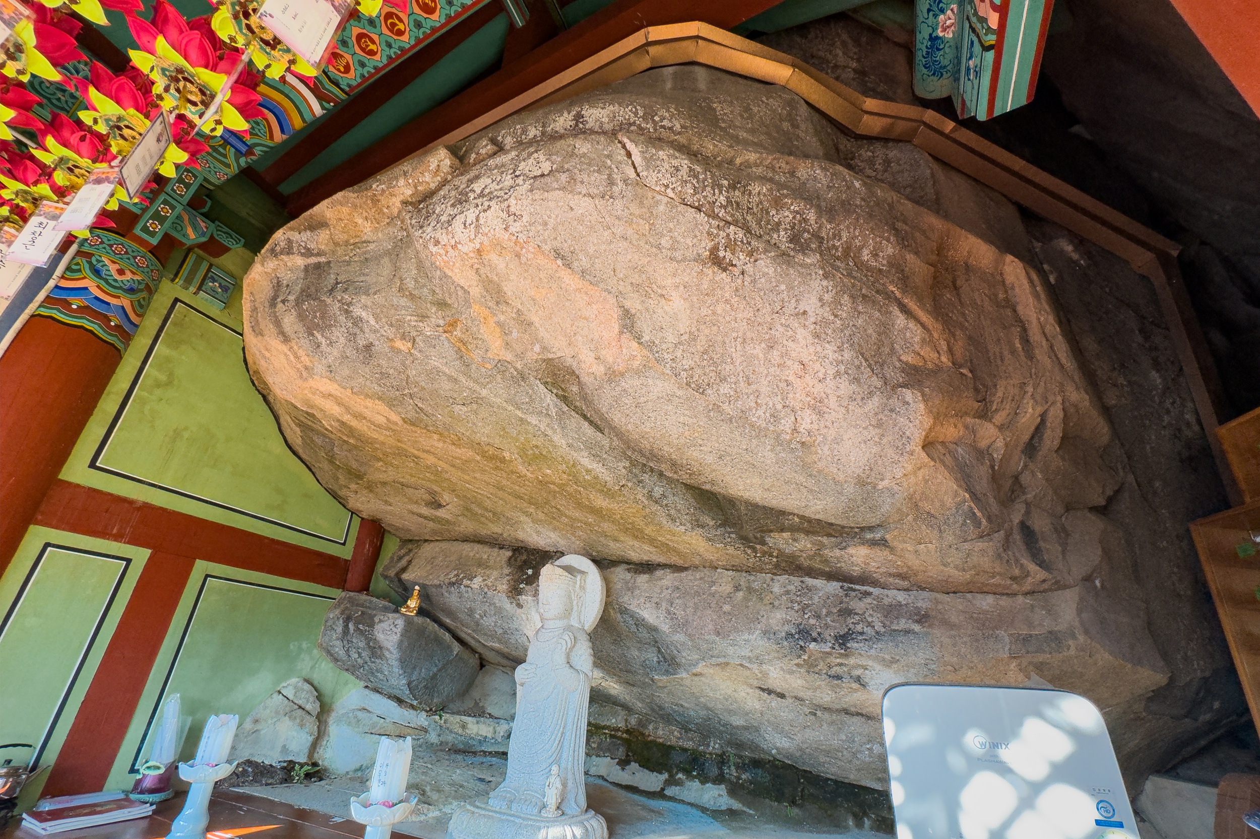 정취암 삼성각 안에는 바깥을 볼 수 있게 통유리창이 뚫어져 있는데 호랑이를 타고 있는 석조 산신상을 볼 수 있습니다. 그 뒤로 조선 순조 때 제작된 호랑이를 타고 있는 산신탱화가 보관되어 있는데 원본은 해인사에 보관되어 있다고 해요.