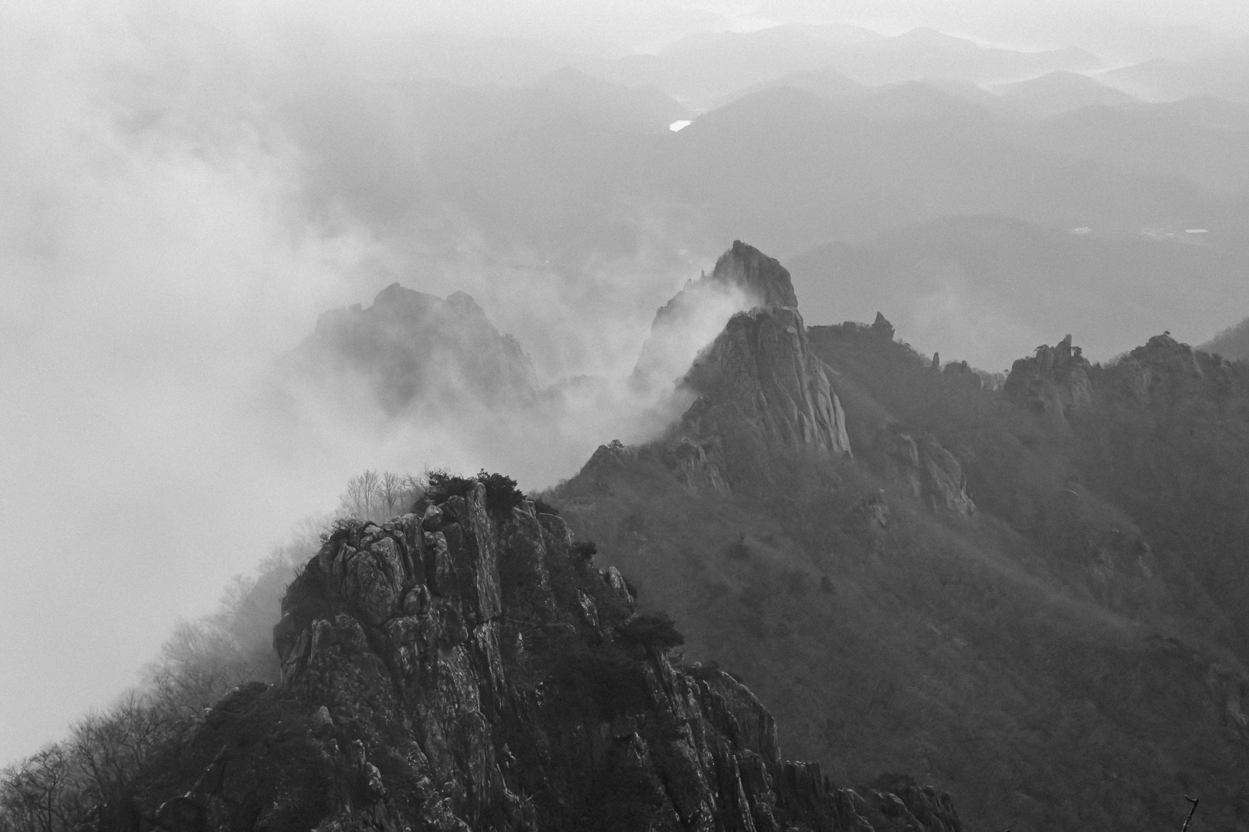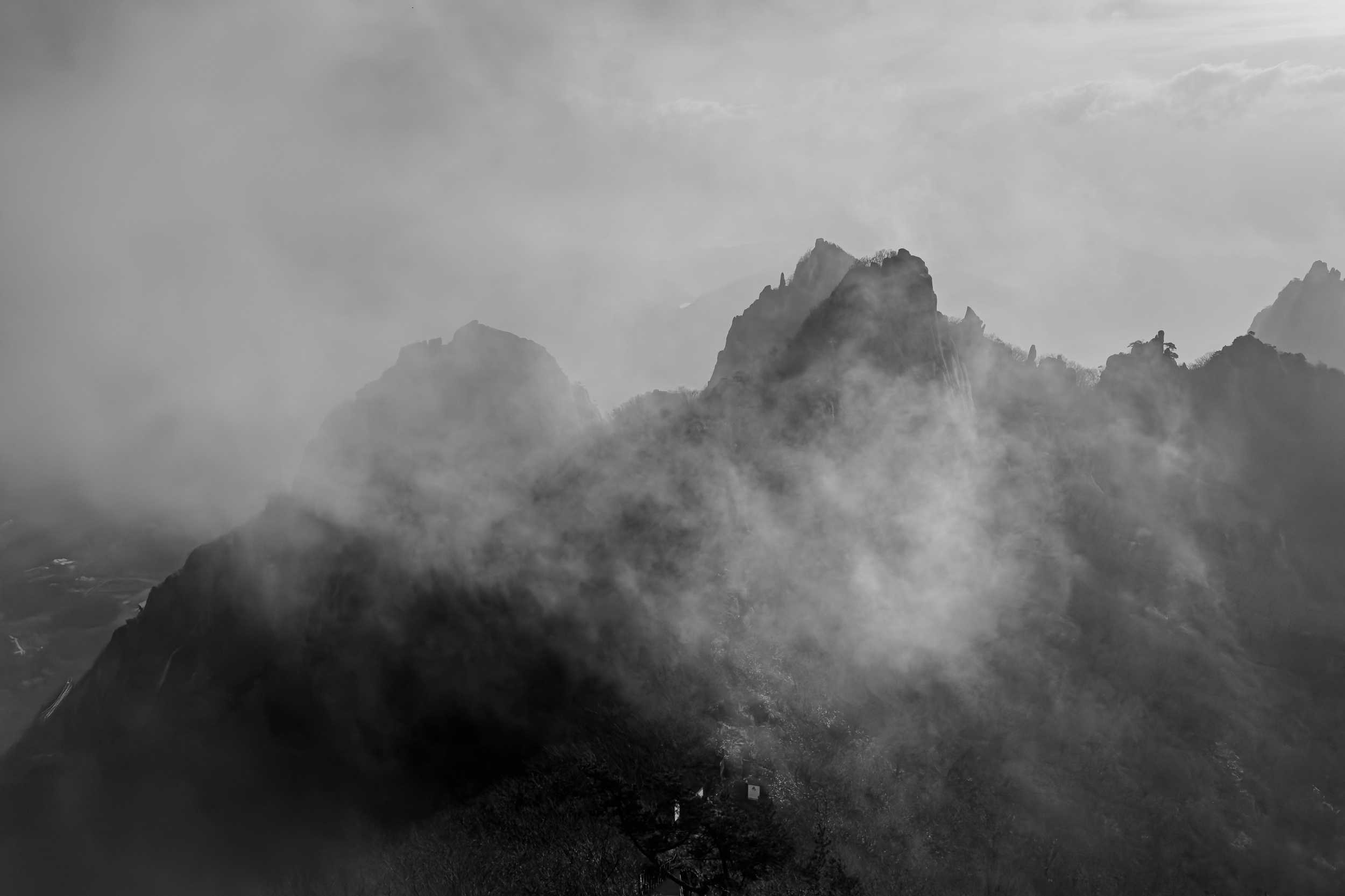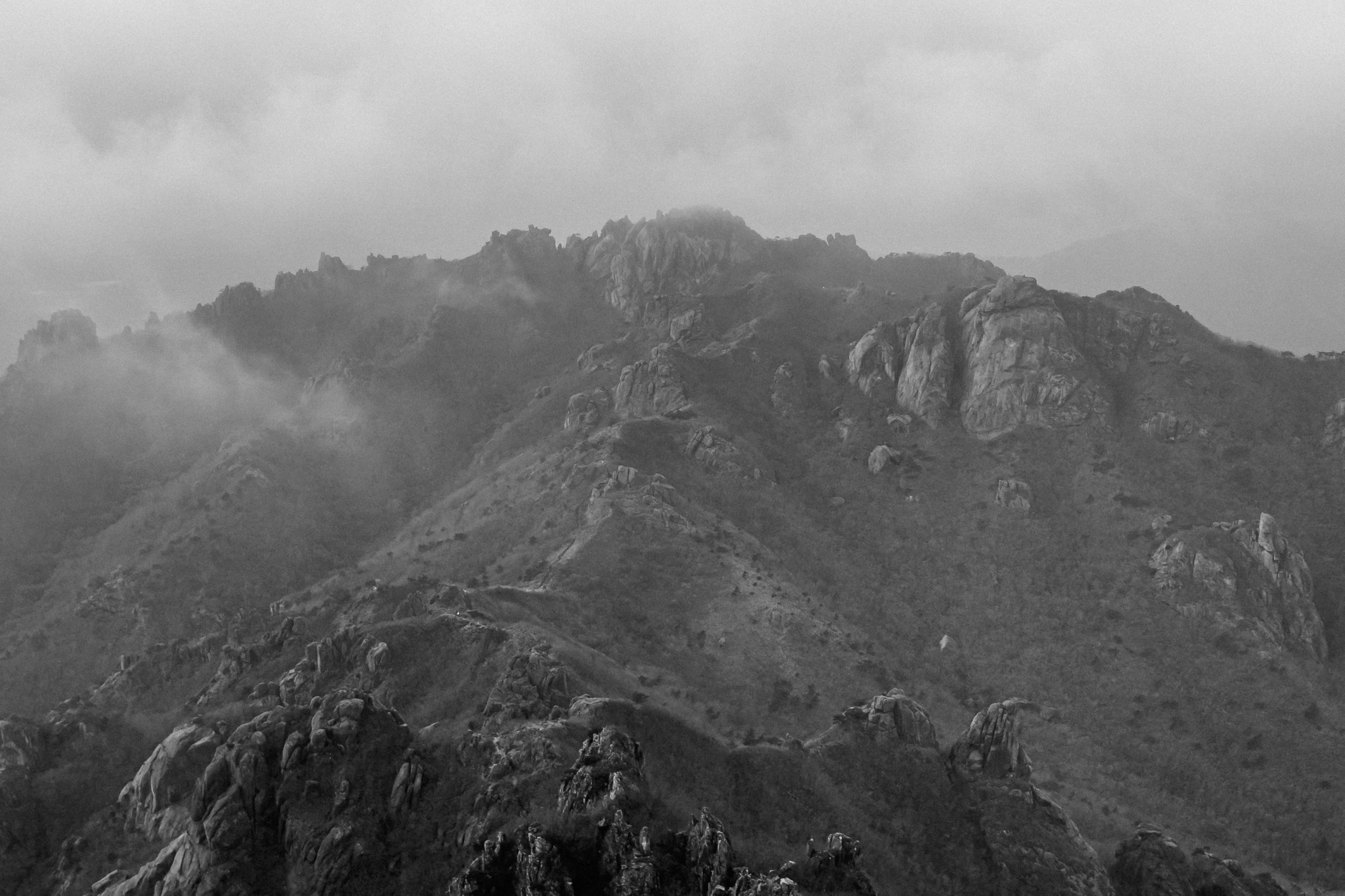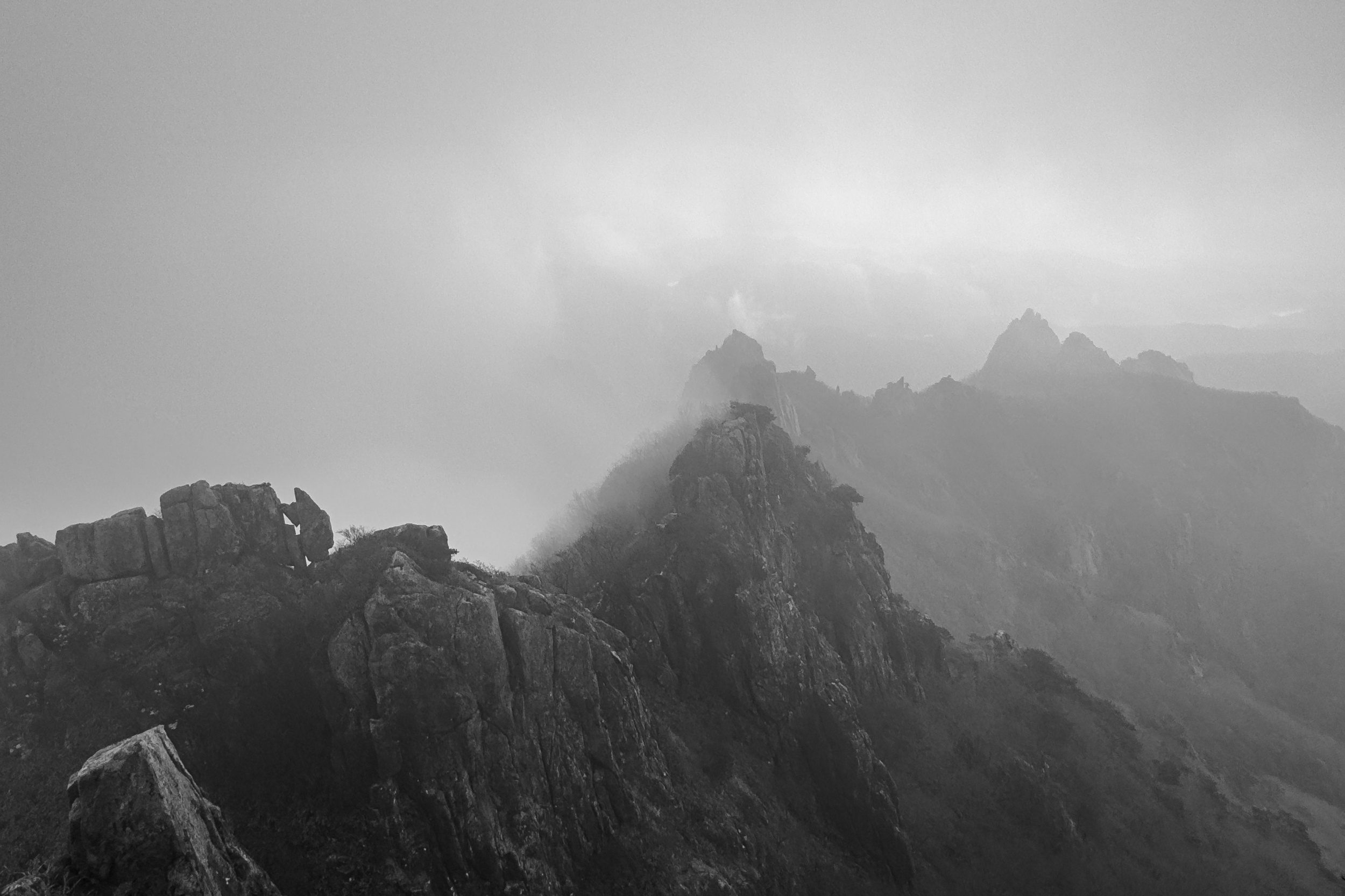 천황봉 정상에서 매섭게 불어오는 바람에 온몸은 휘청이고 안갯속으로 빨려 드는 느낌이었습니다.
