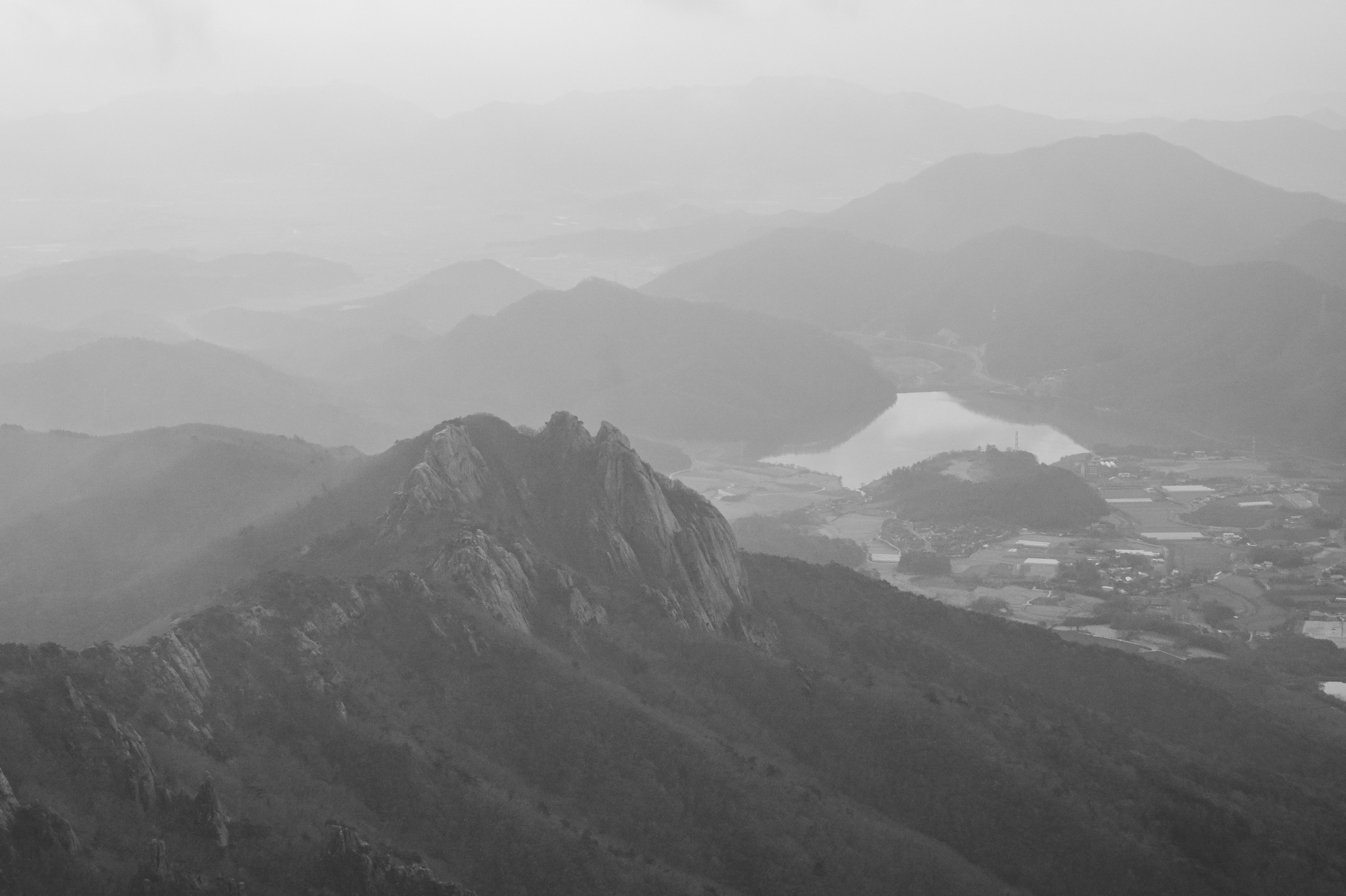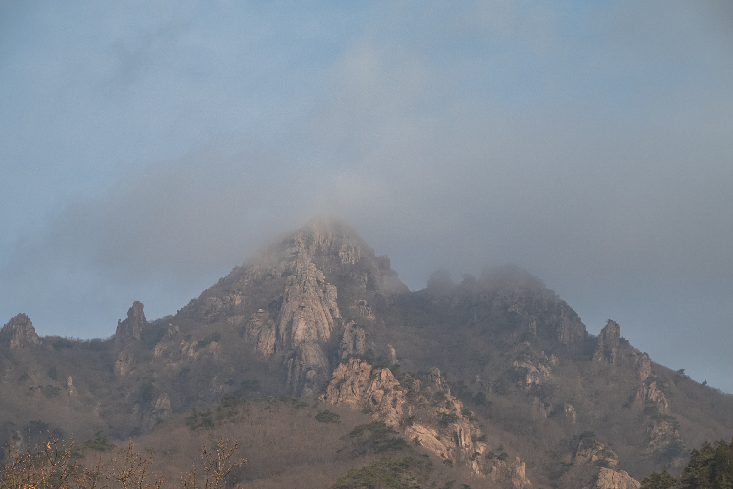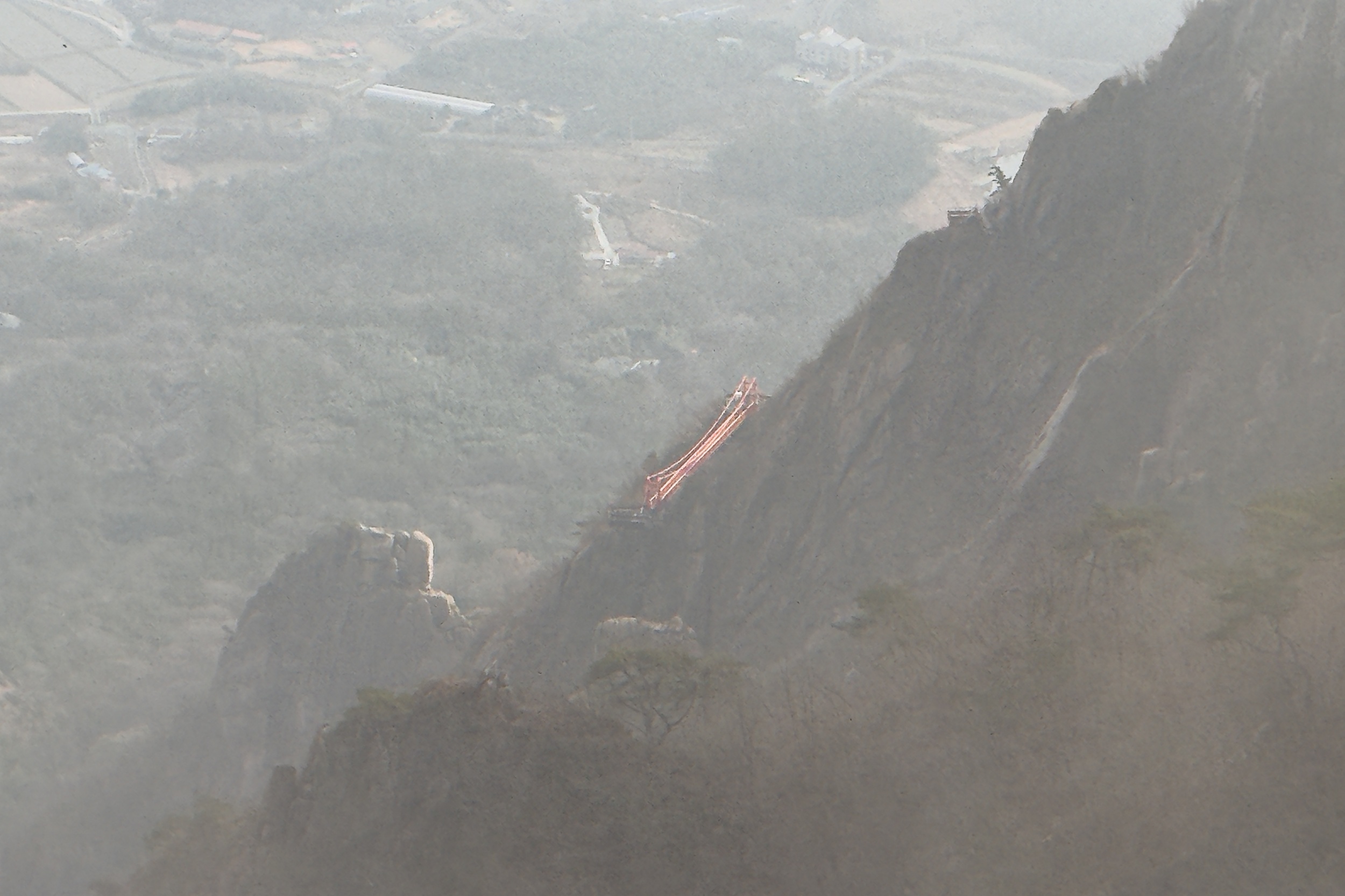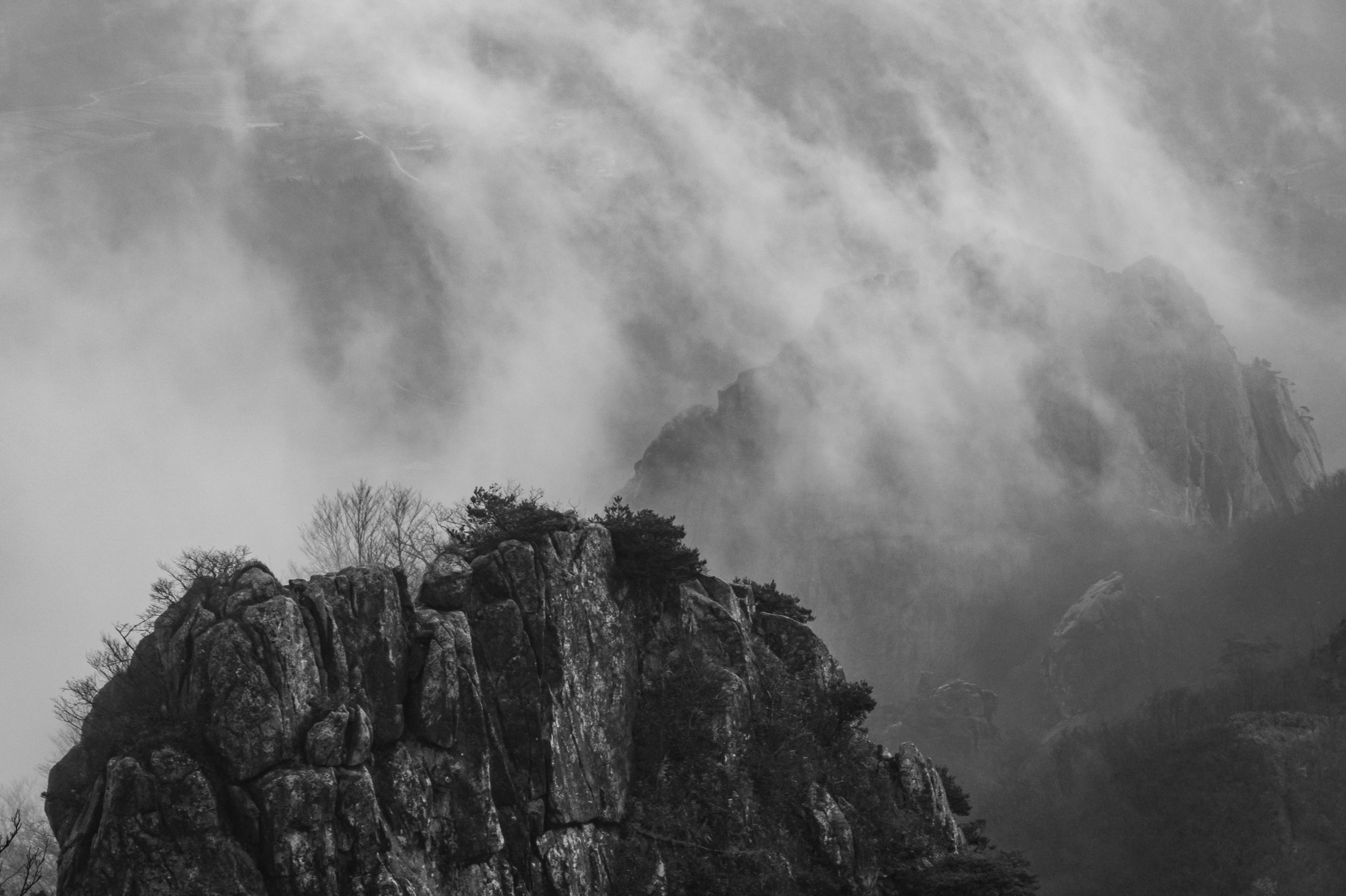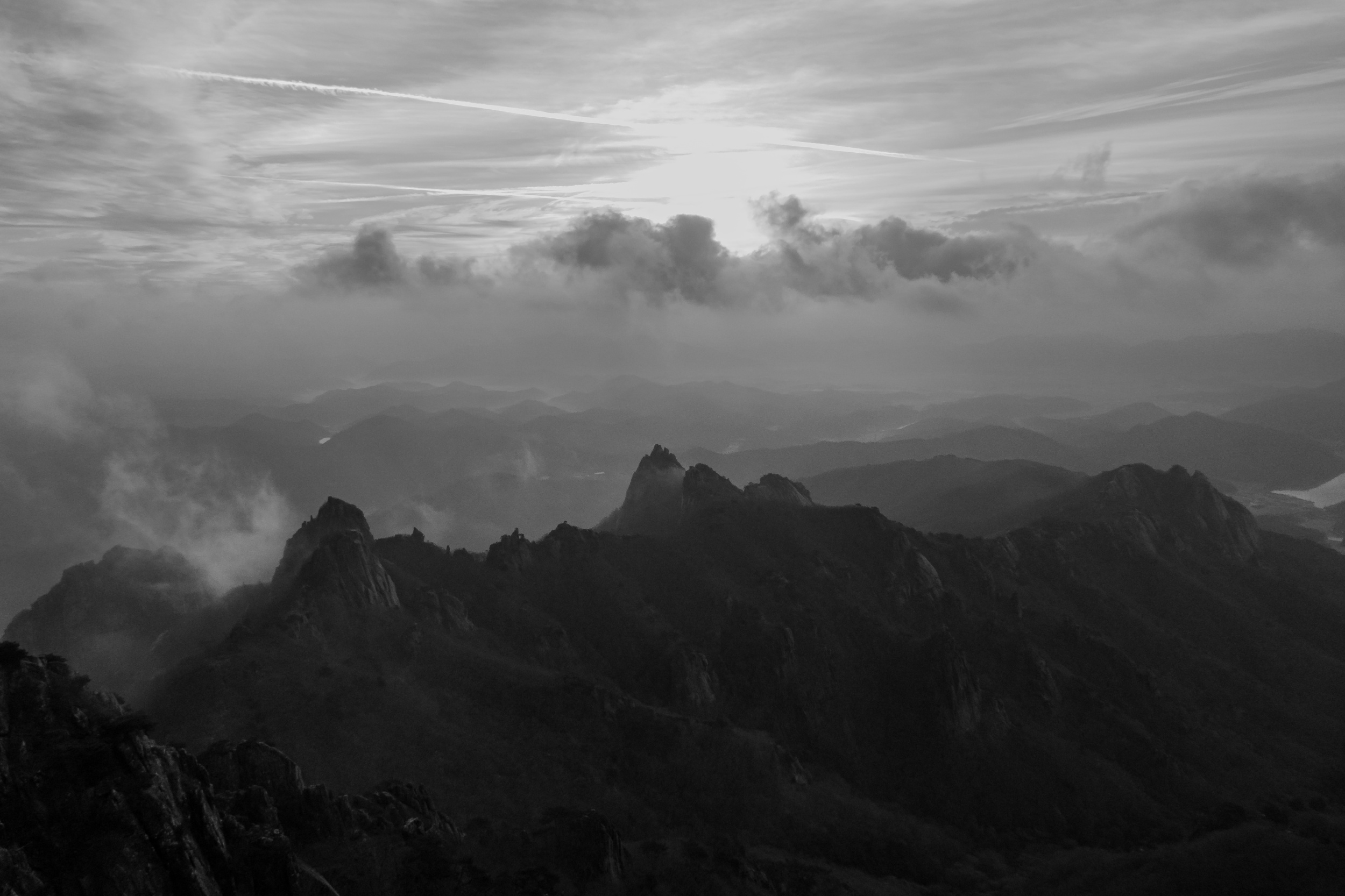 천황봉 정상에서 매섭게 불어오는 바람에 온몸은 휘청이고 안갯속으로 빨려 드는 느낌이었습니다.