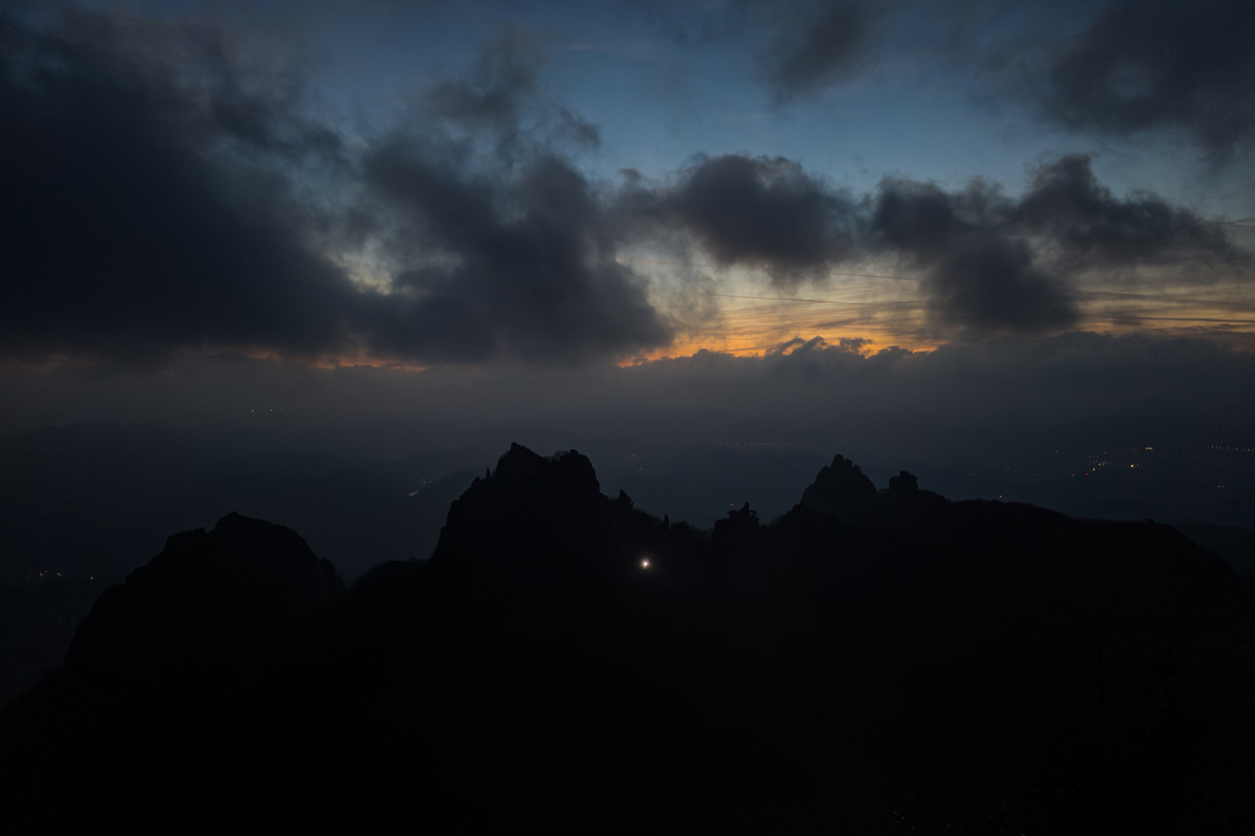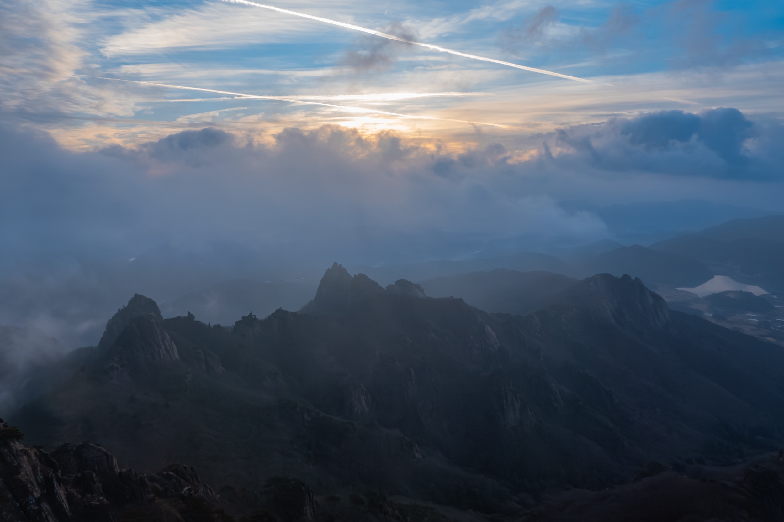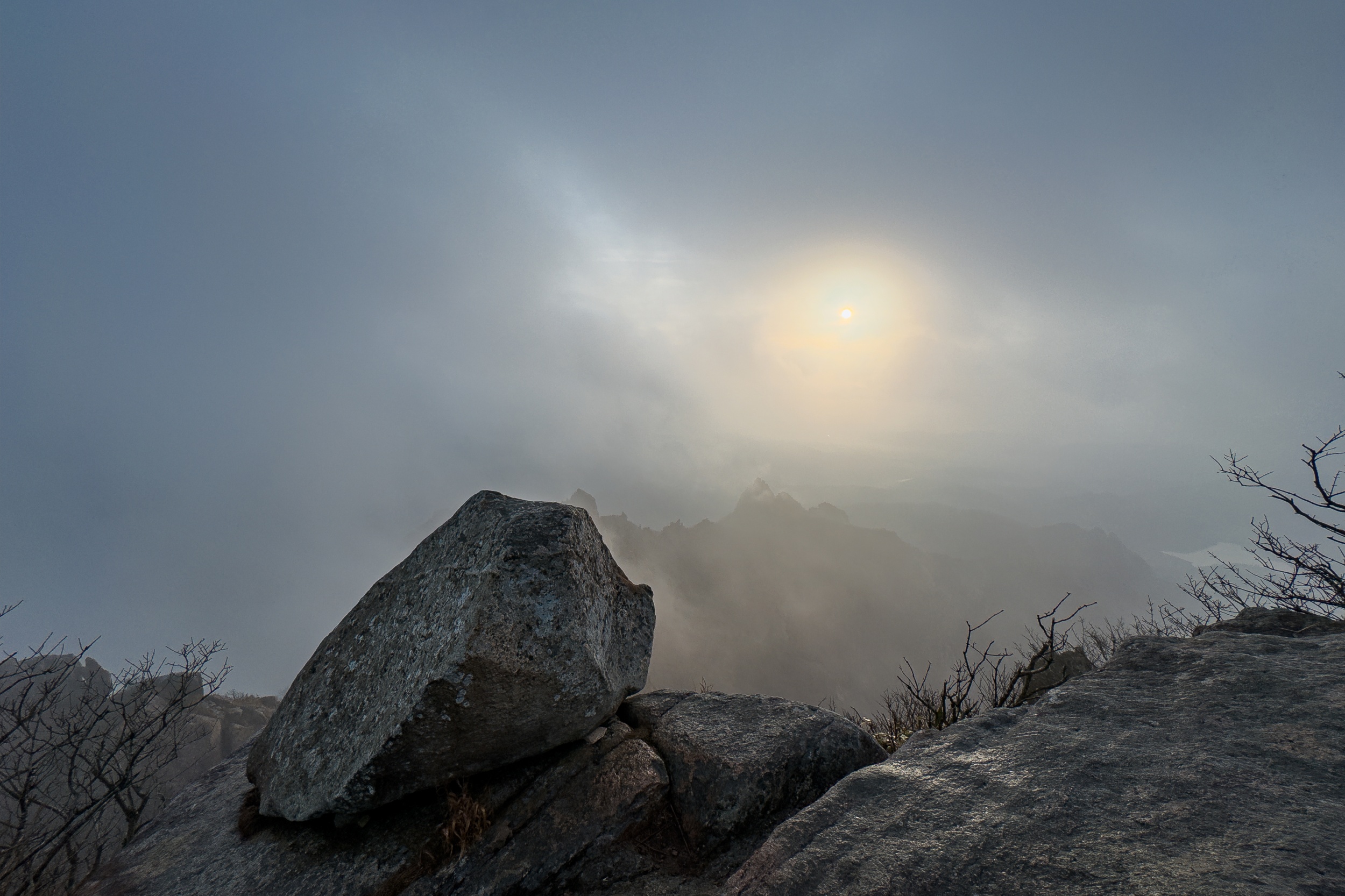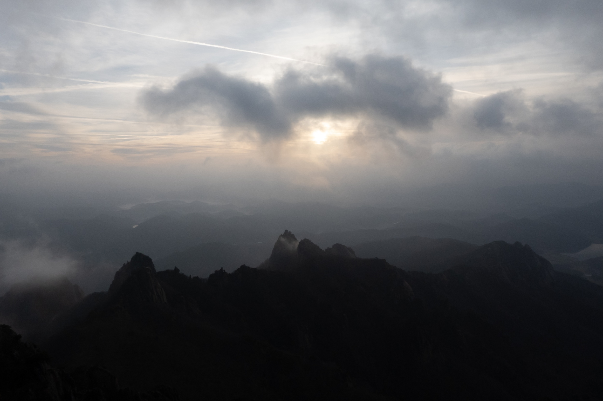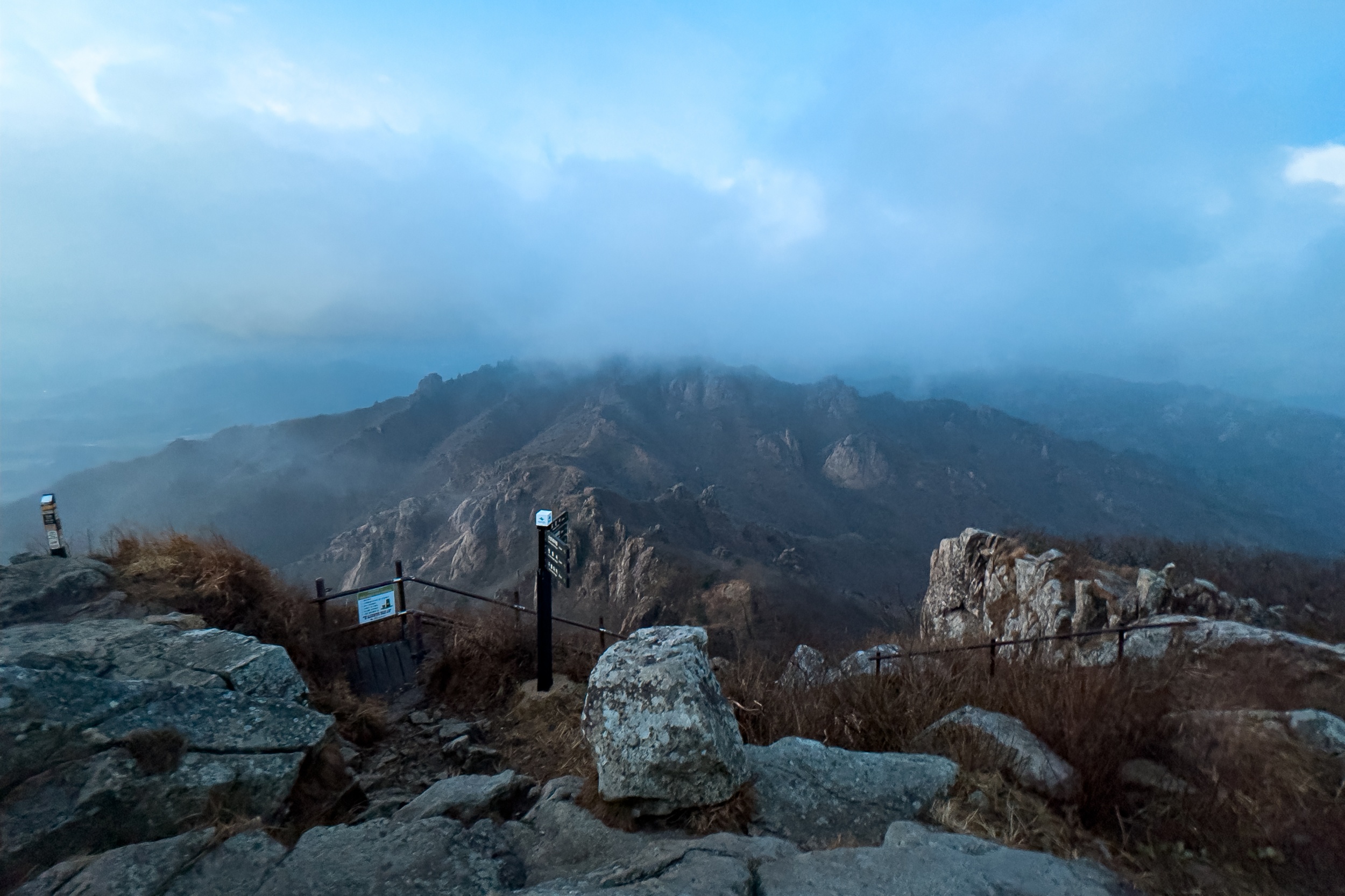 경포대 능선 삼거리에서 하늘을 보니 여명은 올라오고 검은 구름층이 하늘을 덮고 있는 상황에도 천황봉에서 가슴 벅찬 일출을 볼 수 있으리라 기대했지만 안개 때문에 아무것도 보이지 않는 곰탕이 연출되었습니다.