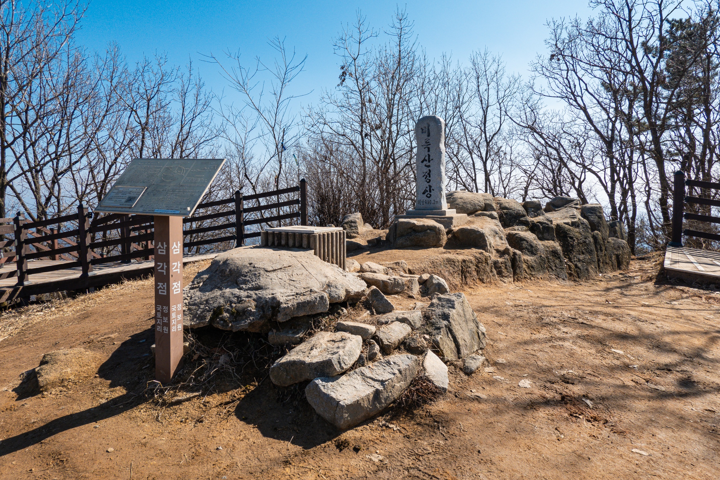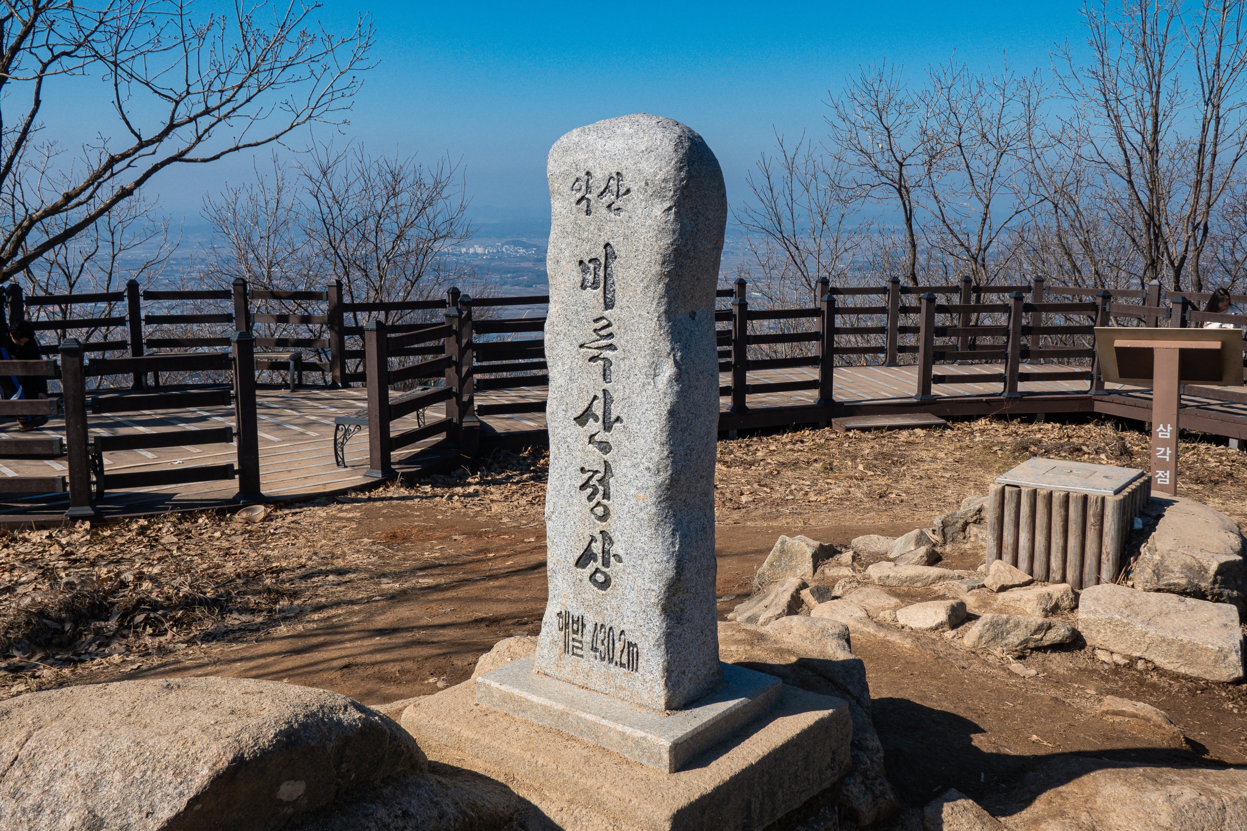익산 미륵산성의 서남 모서리 부분에 위치한 치성을 지나면 넓은 전망 데크와 휴식을 위한 벤치가 조성되어 있으며 화강암으로 세워진 미륵산 정상석과 삼각점 표지판을 만나게 됩니다.