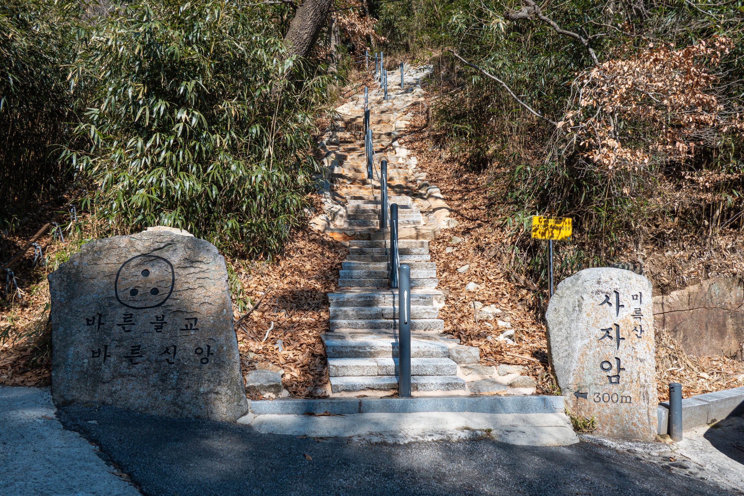 거대한 축대에 적힌 이정표에는 왼쪽은 미륵산 정상 등산로, 오른쪽은 사자암 가는 길입니다.
