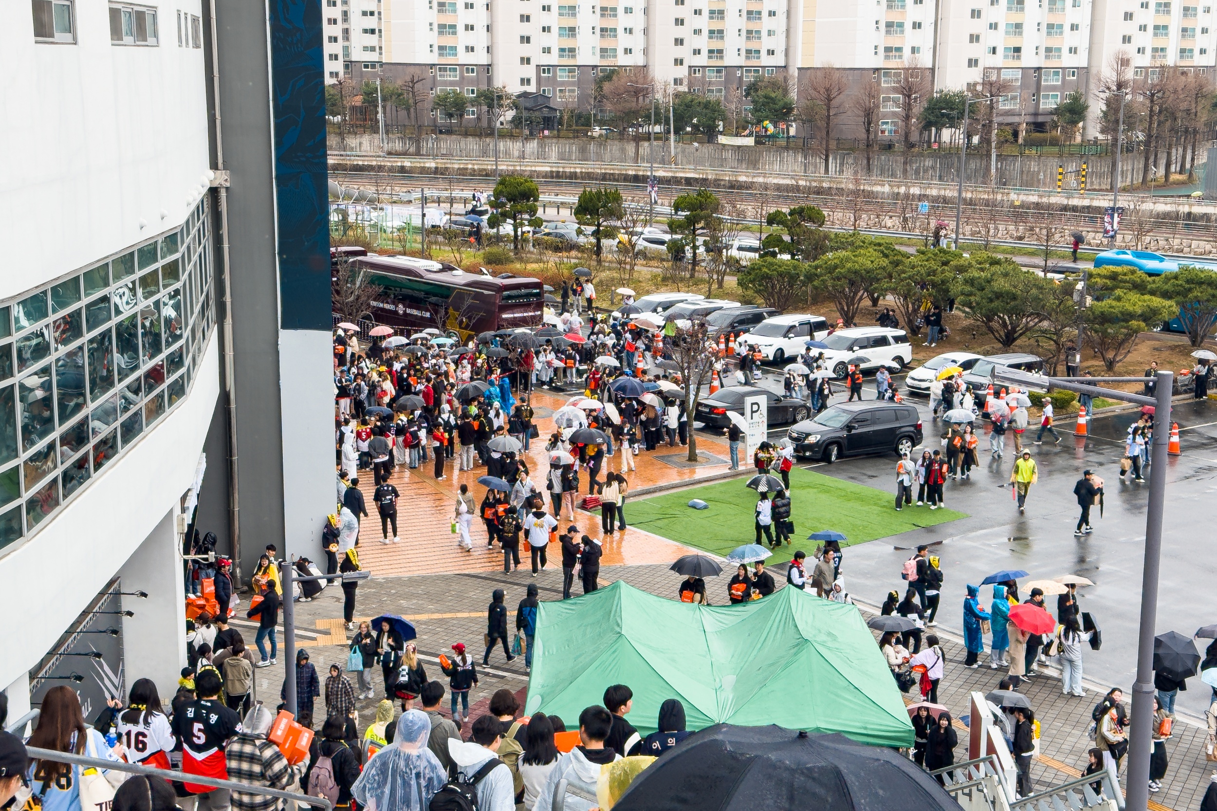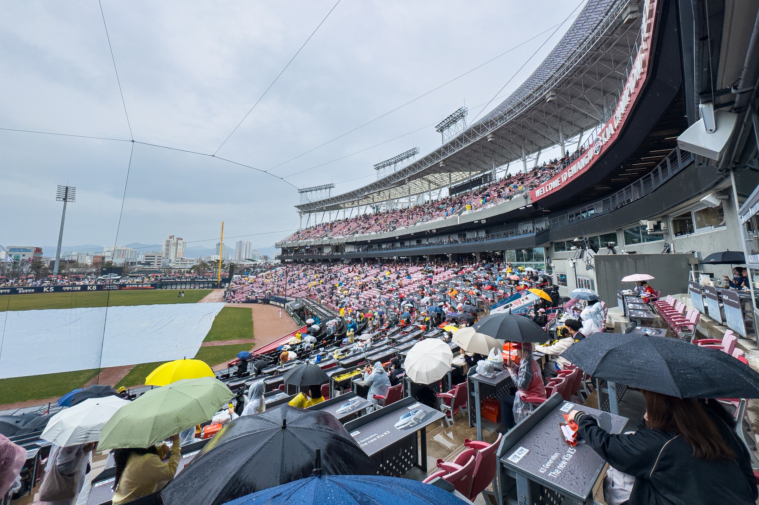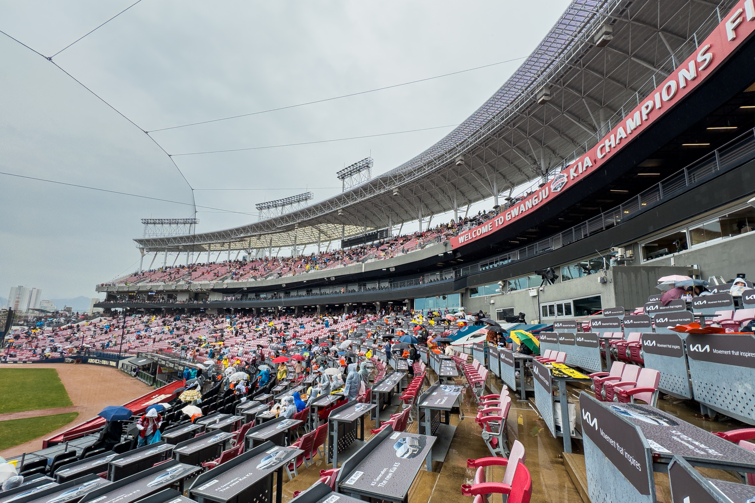 기아챔피언스필드 개막전을 보기 위해 멀리서 찾아 오신 분들과 가족, 연인, 친구들과 함께 온 분들은 비가 내리는 가운데도 경기장을 떠나지 못하고 준비해 온 음식물을 드시면서 많이 아쉬워하셨습니다.