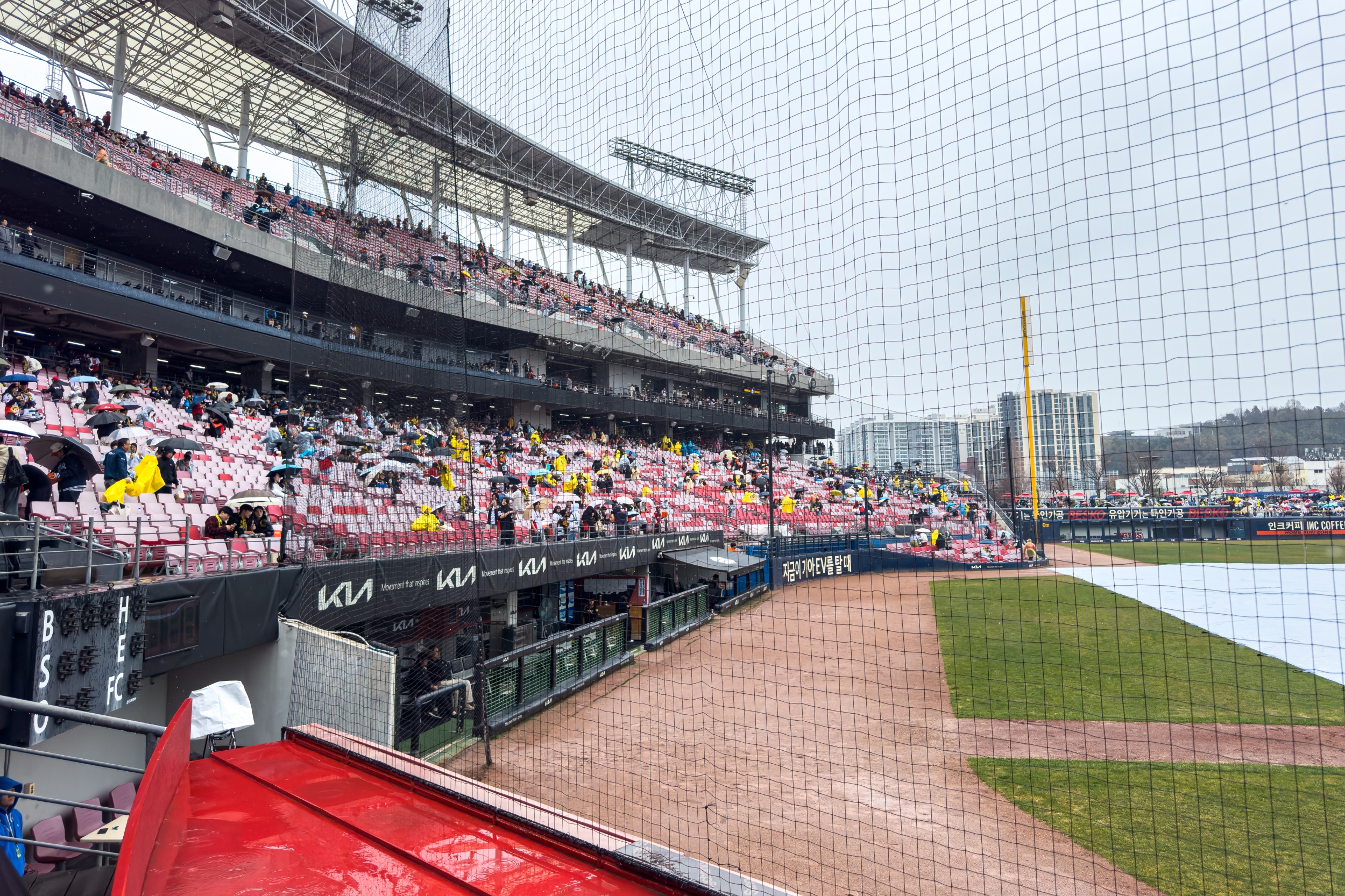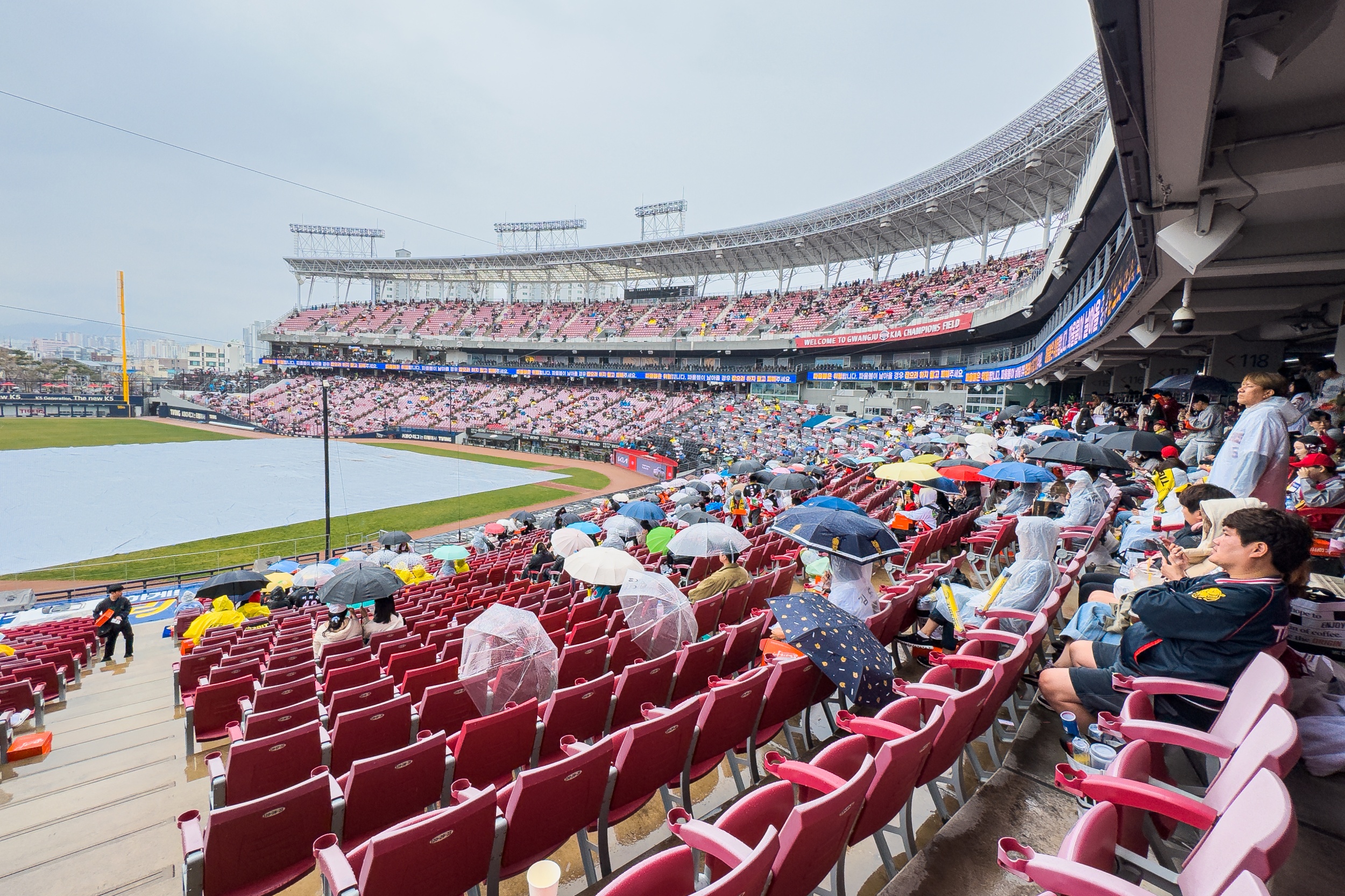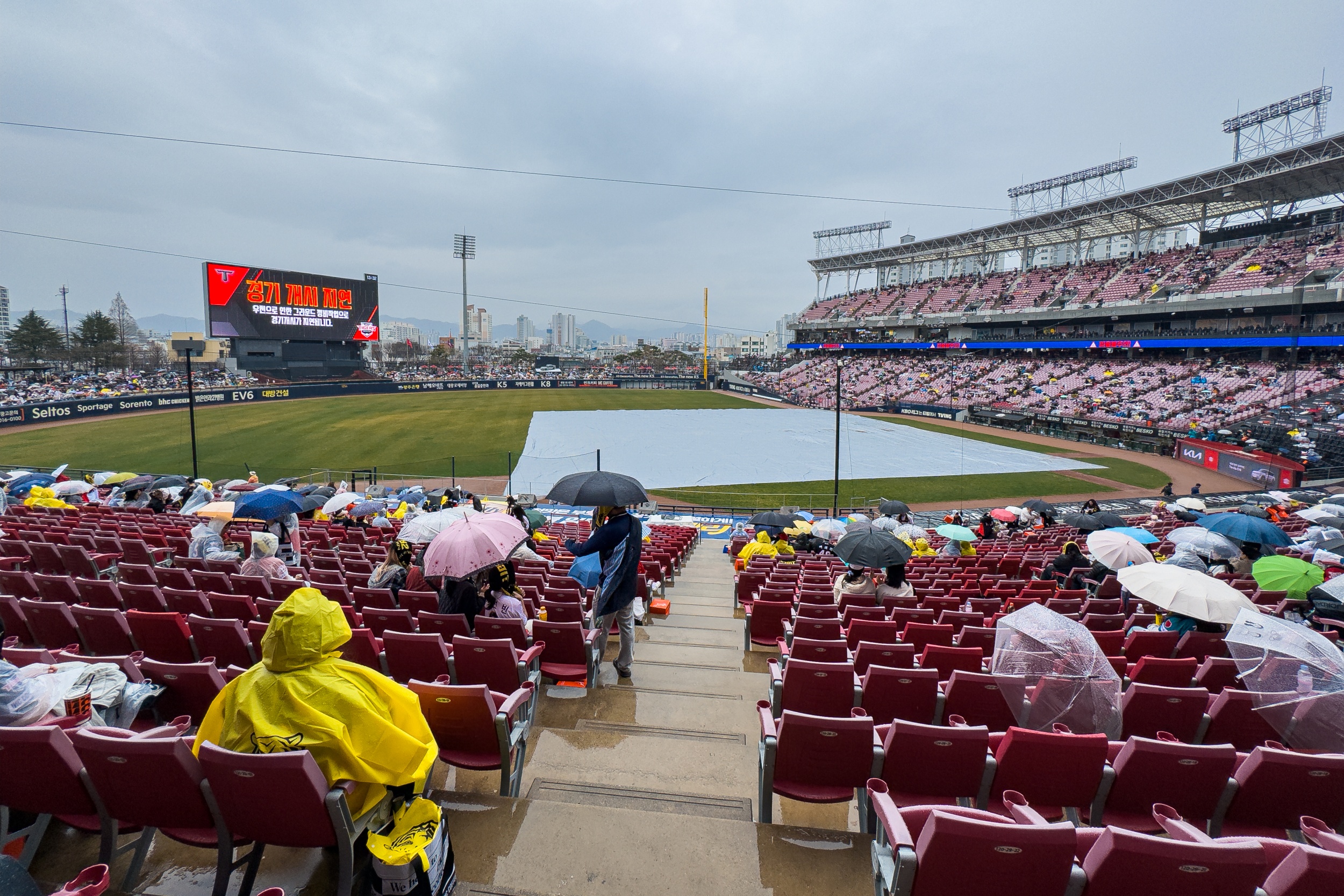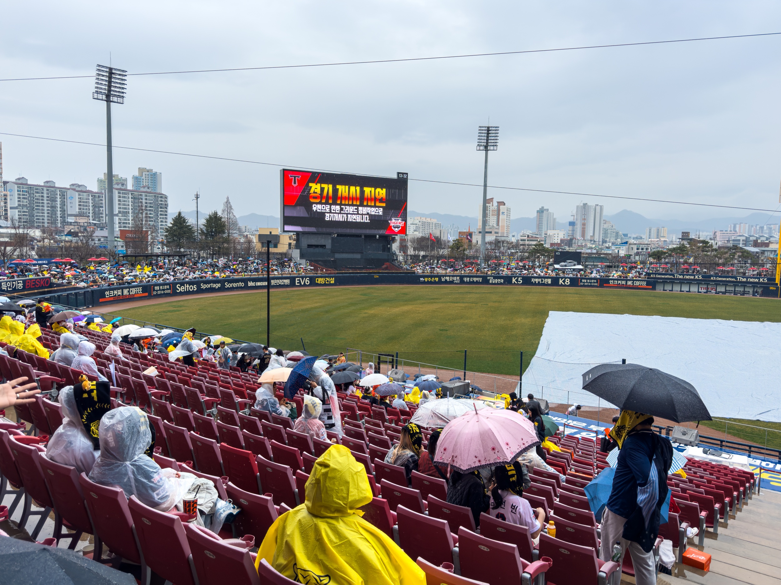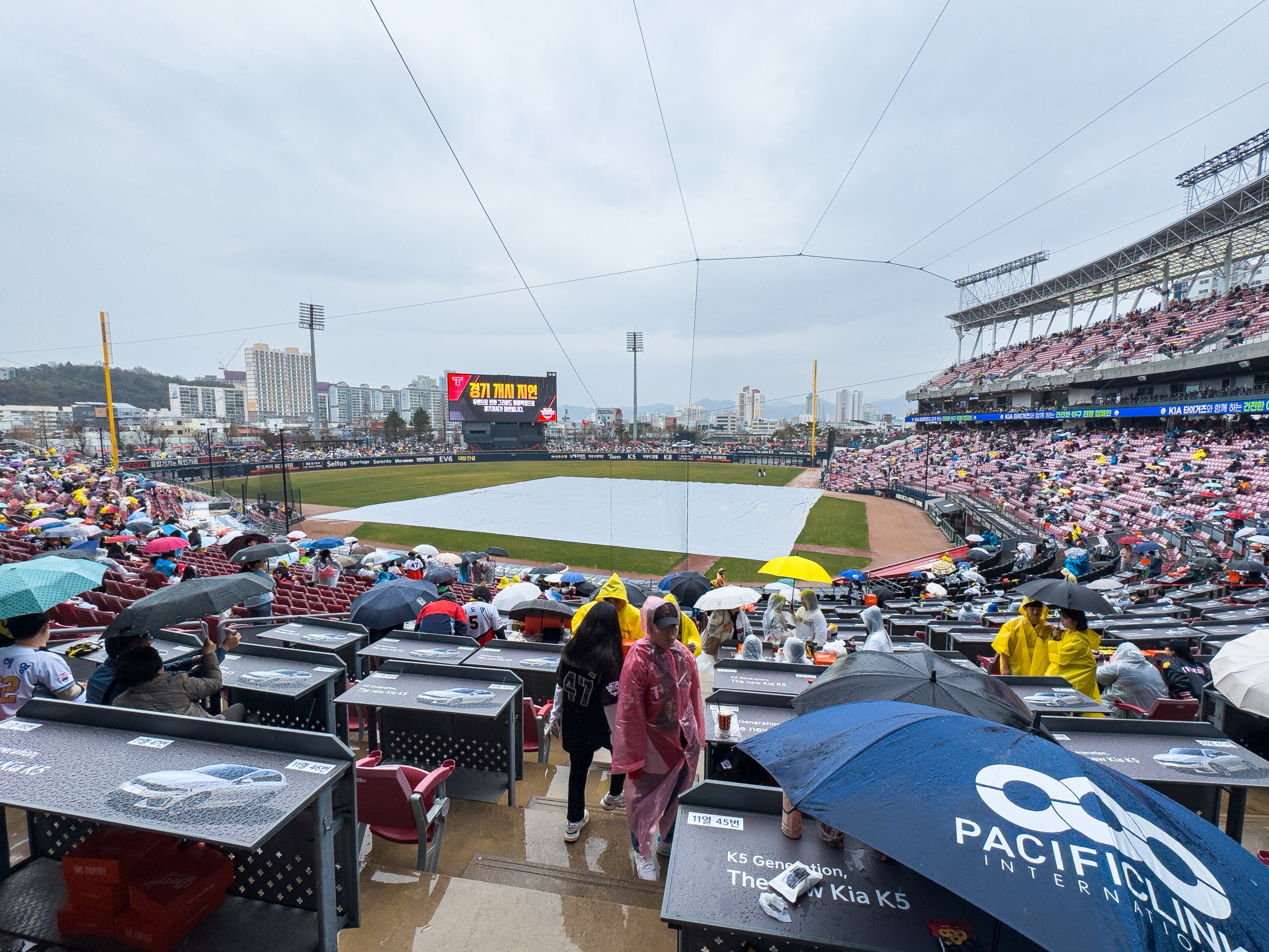 기아챔피언스필드는 주차장도 만차, 경기장 주변과 인크 커피는 사람들로 가득해 이틀 연속 매진이라는 기록을 체감할 수 있었지만 계속되는 봄비가 내려 그라운드에 방수포가 설치되었으며 정비를 위해 경기 시작을 1시간 늦춰 3시에 경기를 진행하려 했지만, 결국 우천 취소를 결정했으며 올 시즌 첫 우천 취소입니다.