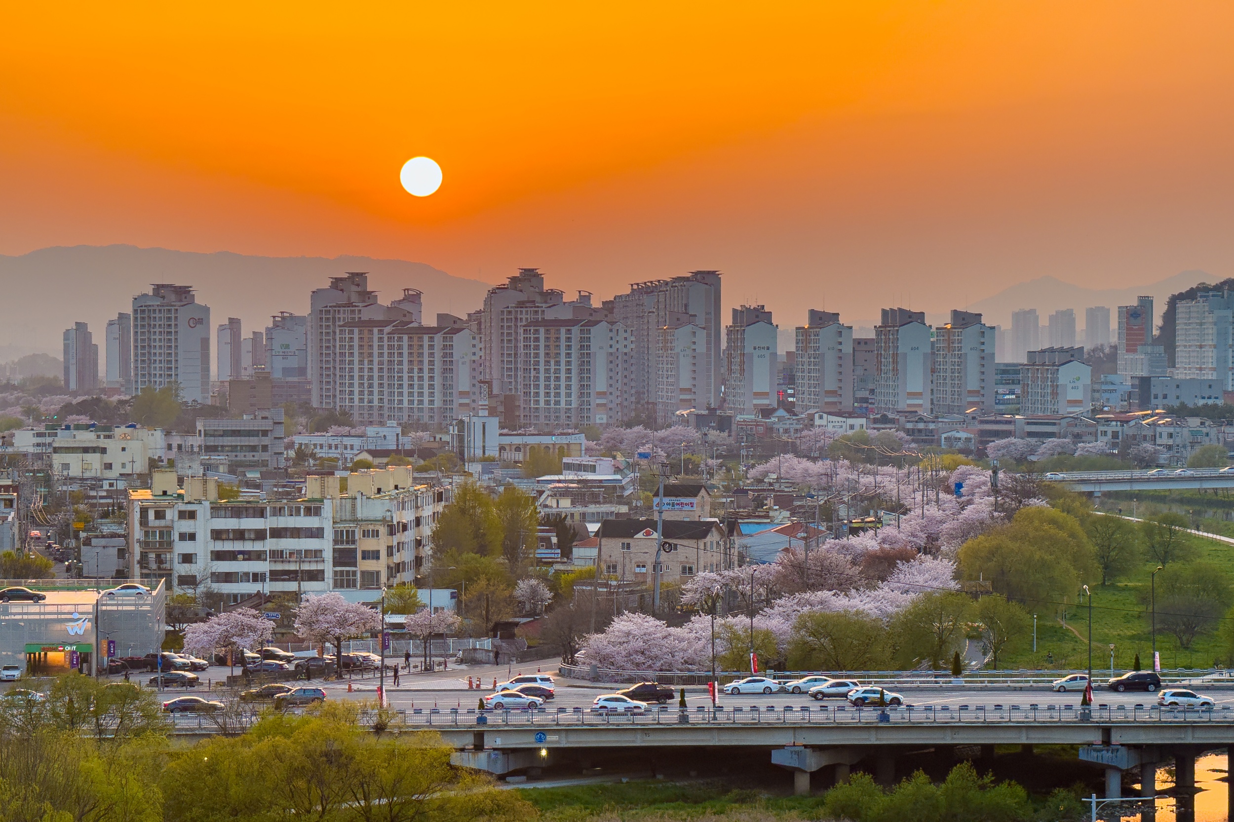 기아챔피언스필드에서 보는 동천동 벚꽃길의 노을도 참 아름다운 풍경이었습니다.