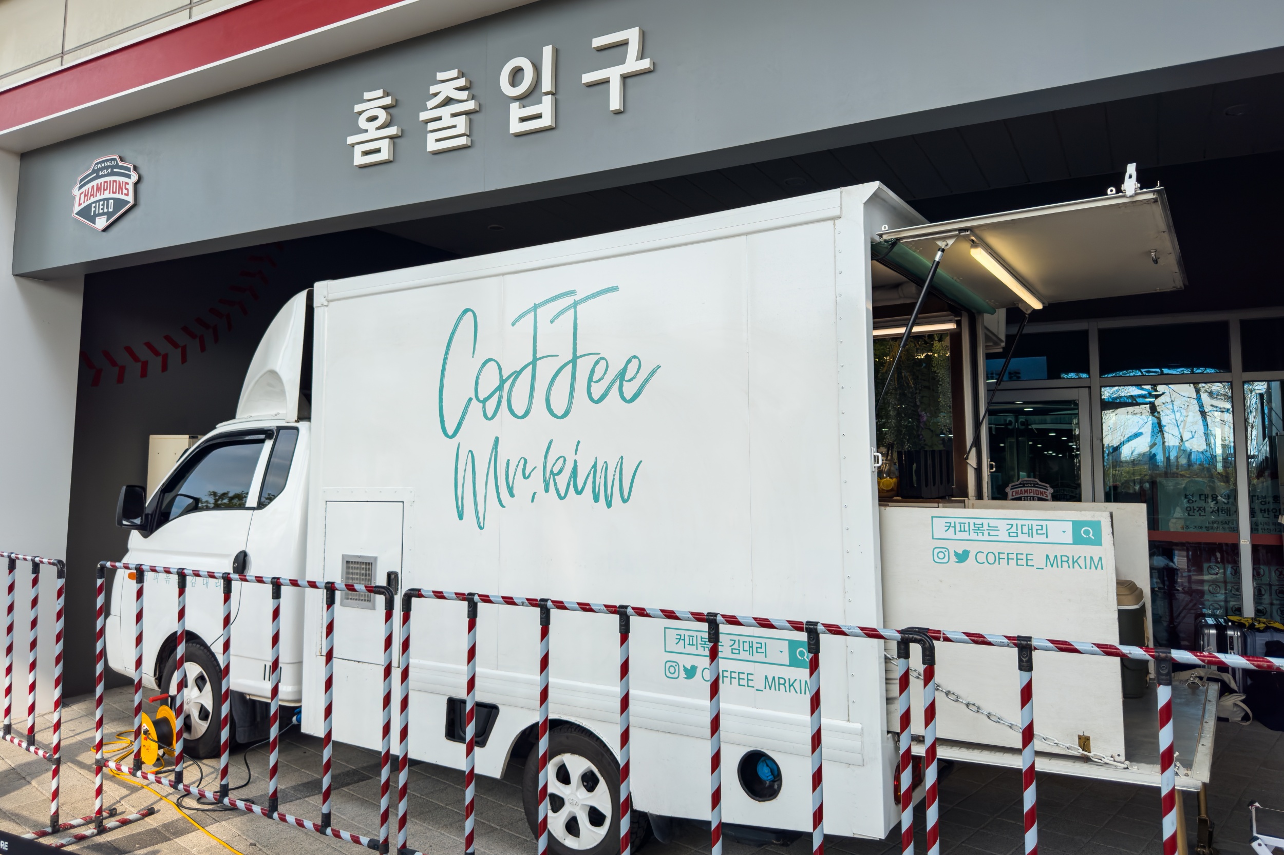 기아챔피언스필드에 도착하니 홈 출입구에 커피차가 보이고 그 뒤로 김도영, 전상현 선수 얼굴이 보여 반가운 마음이 들었습니다.