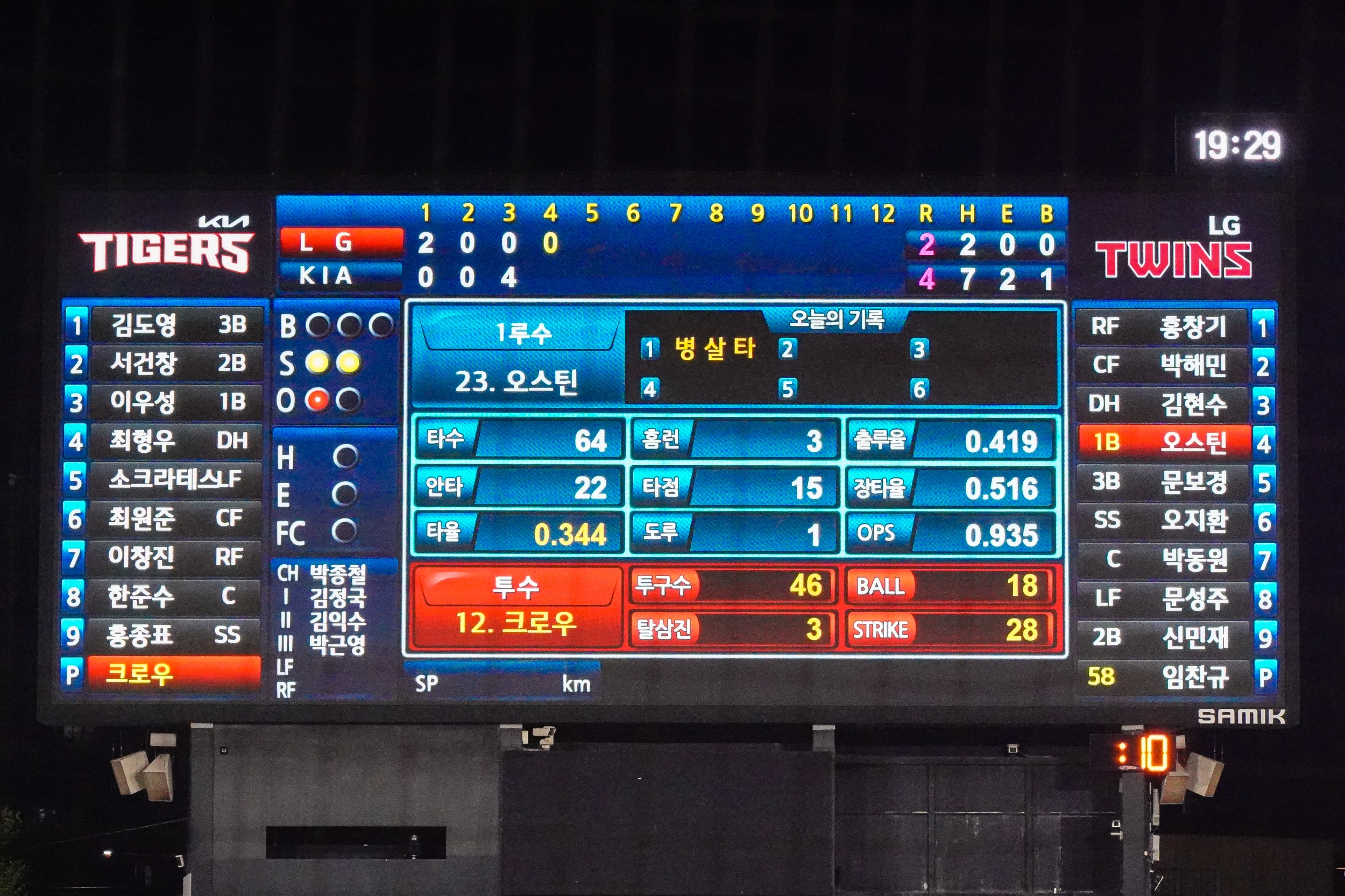 LG 트윈스와의 시즌 3차전에서 8-4 역전승을 거두며, 3연승을 달린 스윕과 함께 올 시즌 11승 4패(승률 0.733)로 단독 선두를 수성했습니다. 선발 투수 크로우는 한국 무대 데뷔 후 첫 퀄리티 스타트 투구를 펼치며 승리를 이끌어줬습니다.