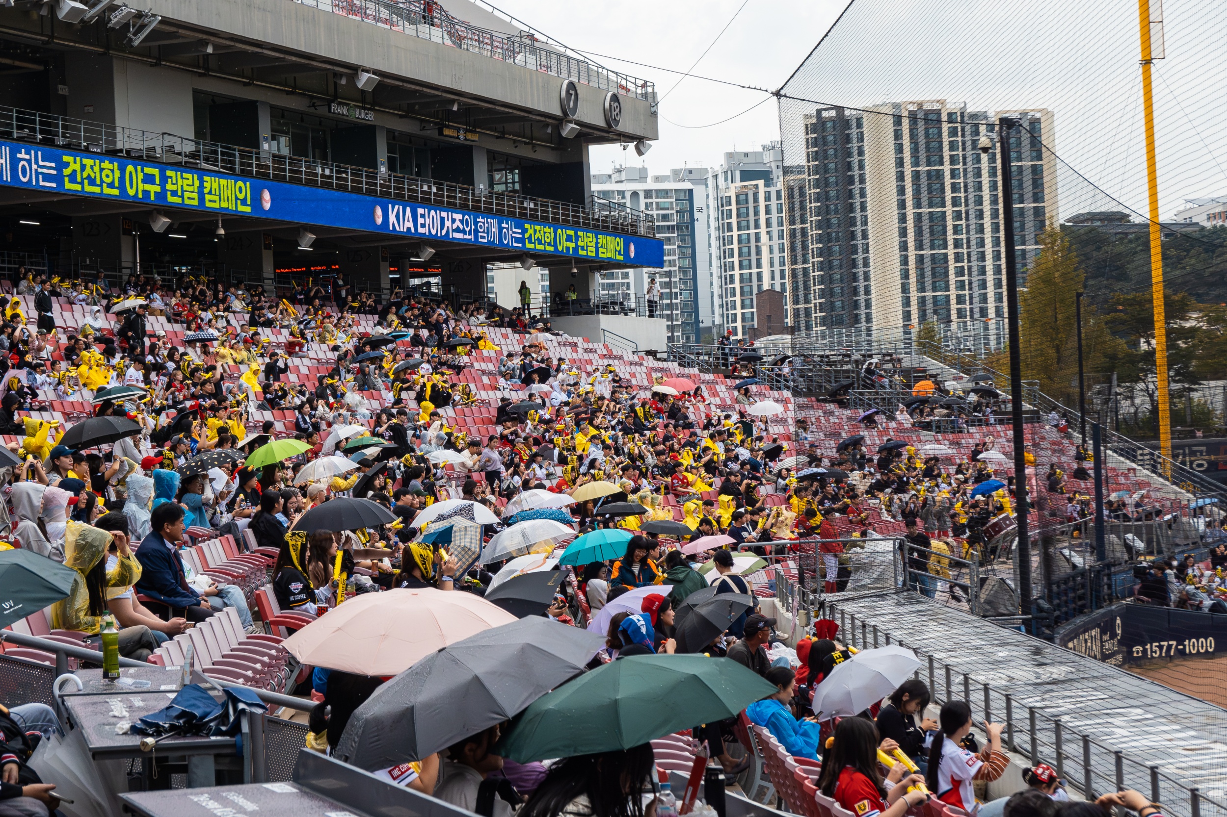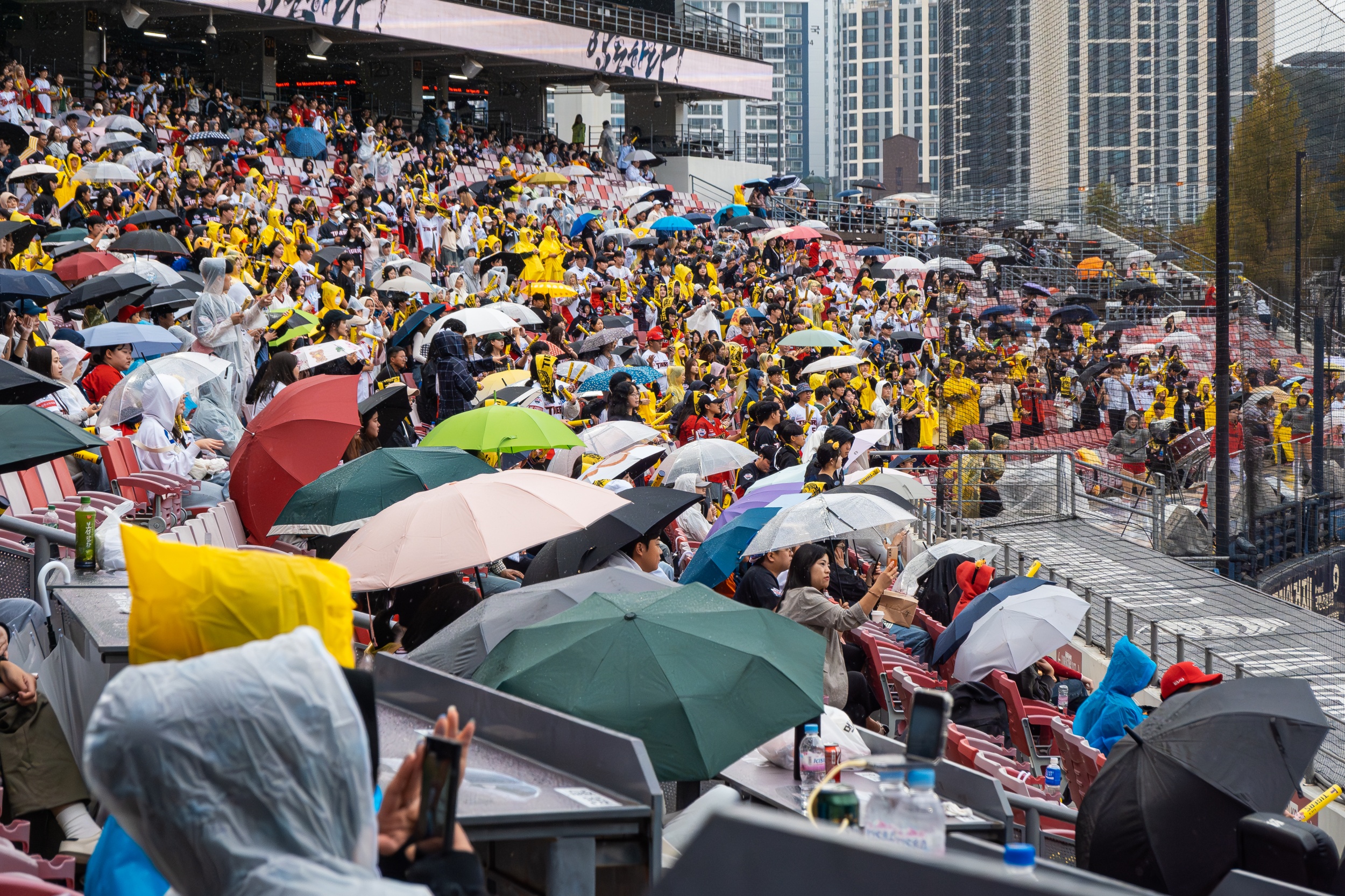 지인에게 연락해 함께 직관하자 연락하고 챔피언스필드에 도착하니 내리는 비에 이미 방수포를 덮어 놓았고 경기 시작 전까지 내리는 비에 경기를 진행할 수 있을까 걱정되었지만 무리 없이 경기는 개시되었습니다.