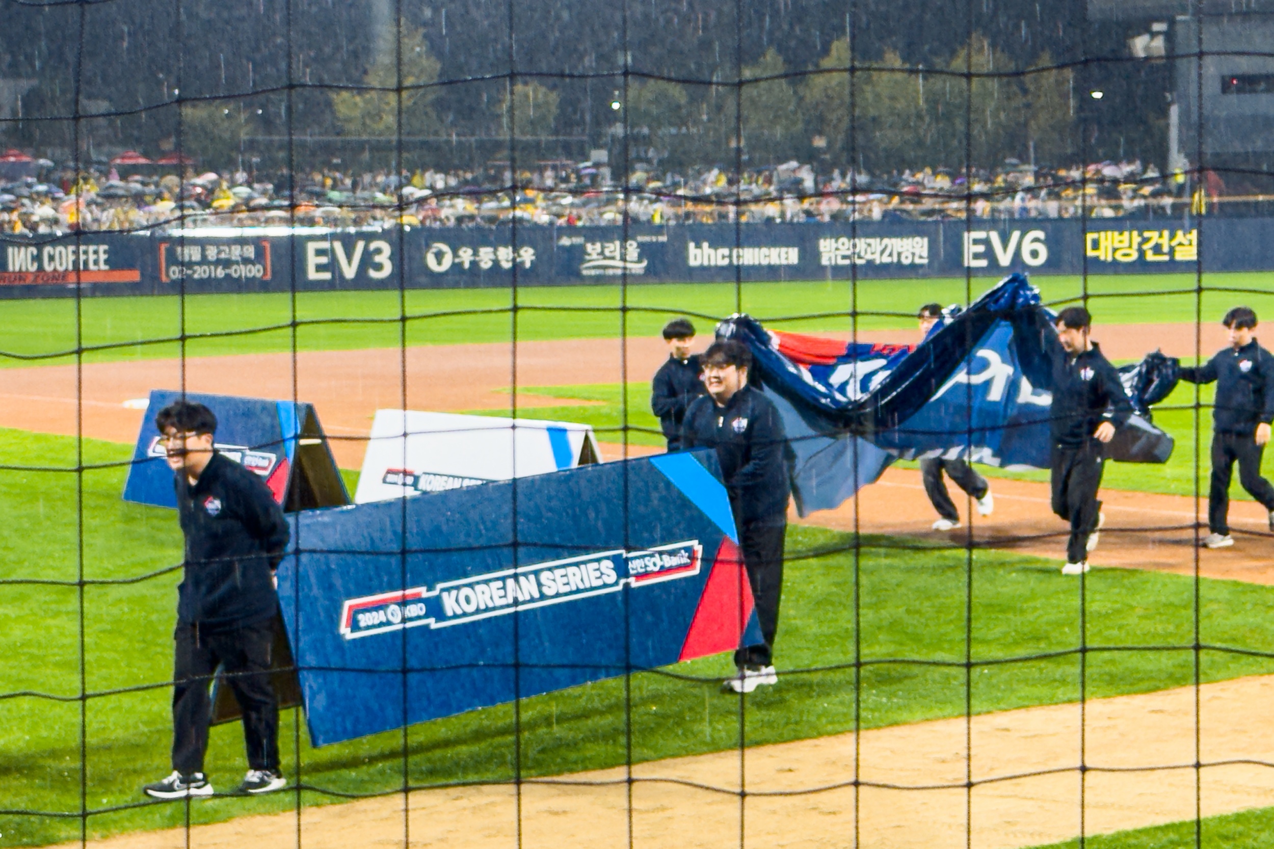 잔뜩 흐리던 날씨는 비로 바뀌기 시작했고 그라운드에는 방수포를 덮었다가 걷는 모습이 반복되어 한국시리즈 개막전 경기를 기다리는 팬들의 마음을 초조하게 만들었습니다.