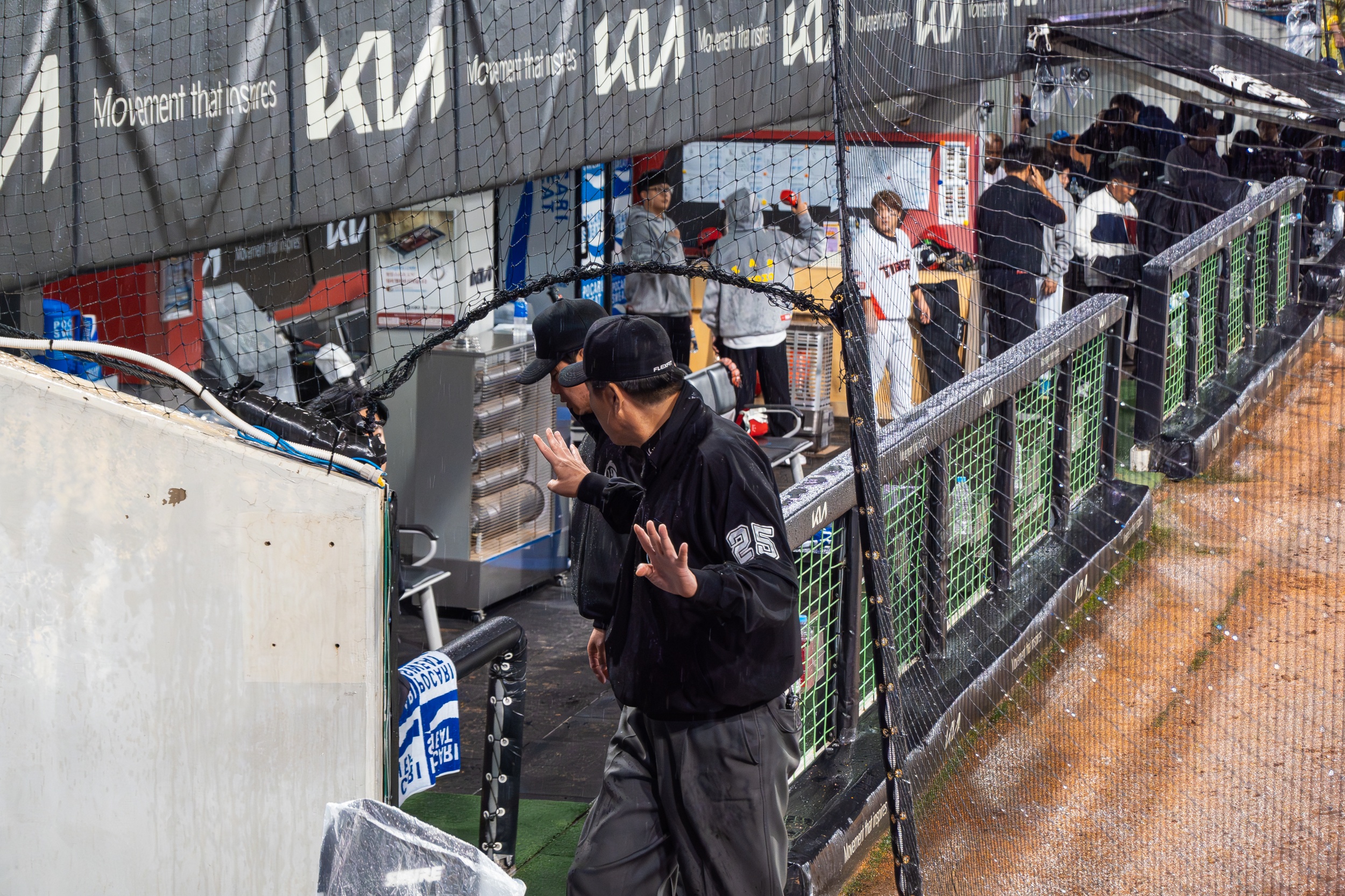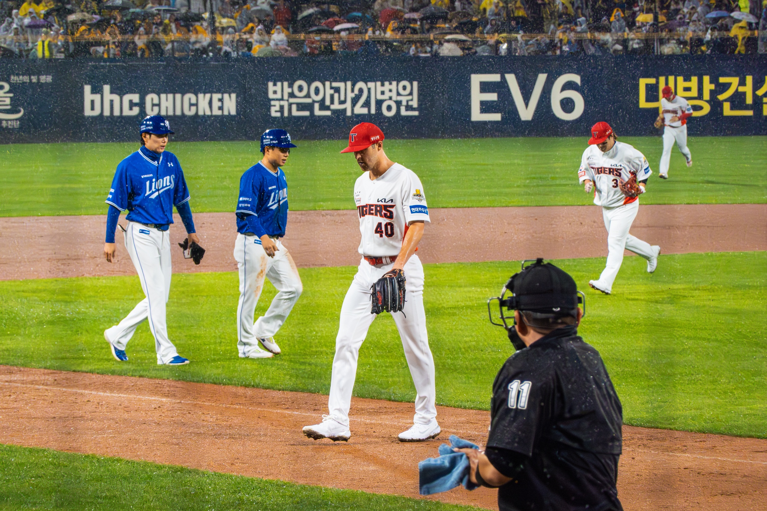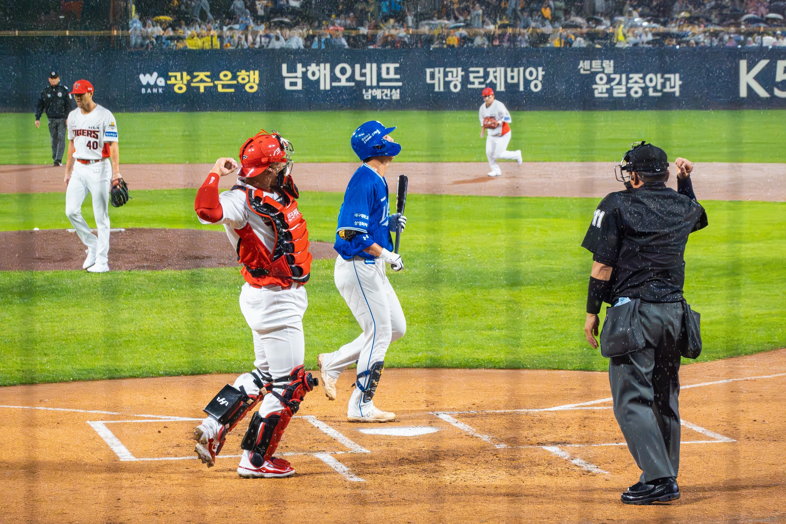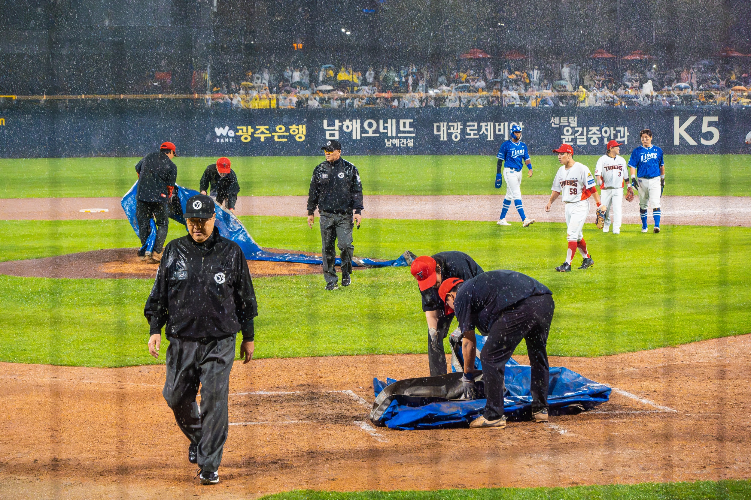 세 차례나 대형 방수포를 깔았다 걷는 우여곡절 속에 개막 행사가 모두 끝나고 오후 7시 36분이 돼서야 KIA 선발 제임스 네일의 초구를 볼 수 있었지만 빗줄기는 멈출 생각을 안 하고 다시 굵어지기 시작했습니다.