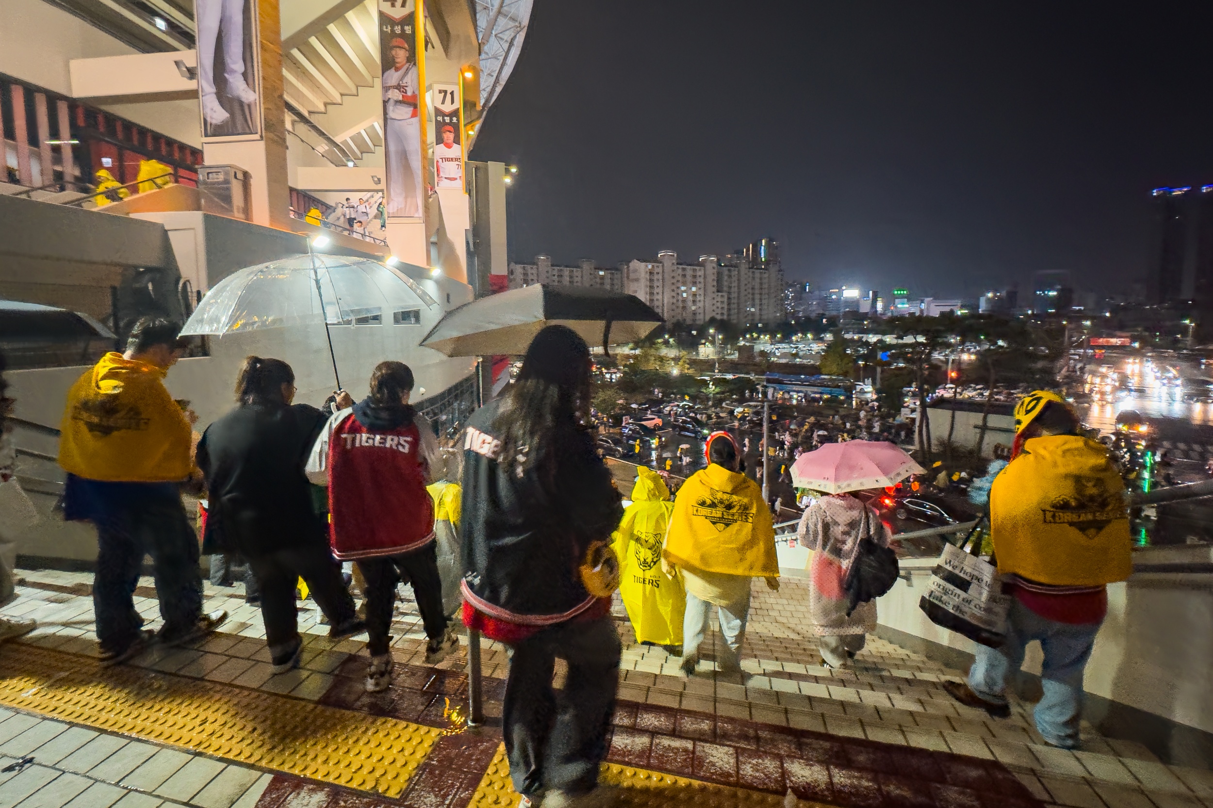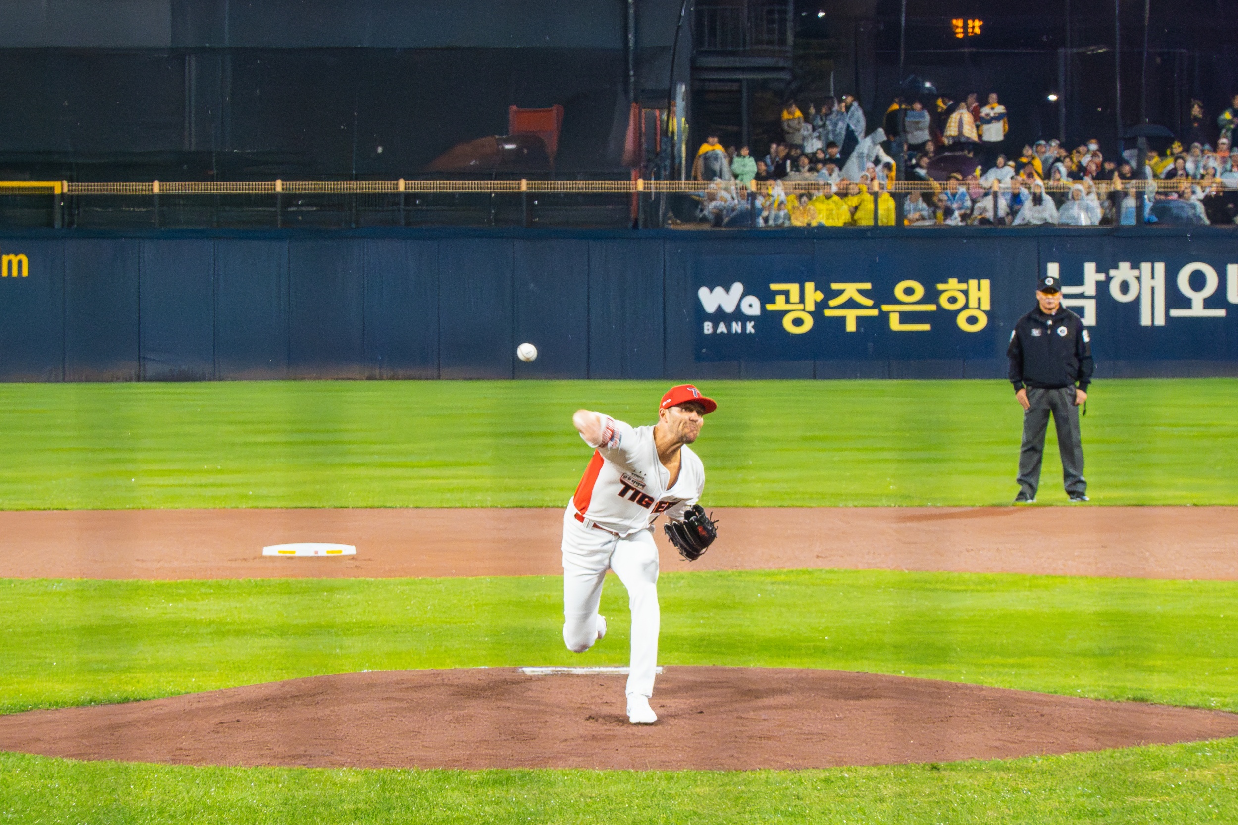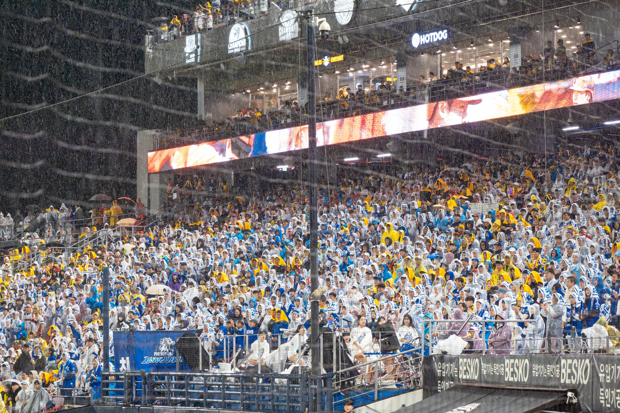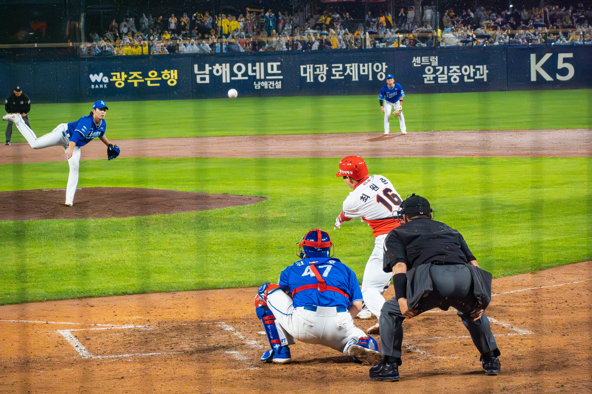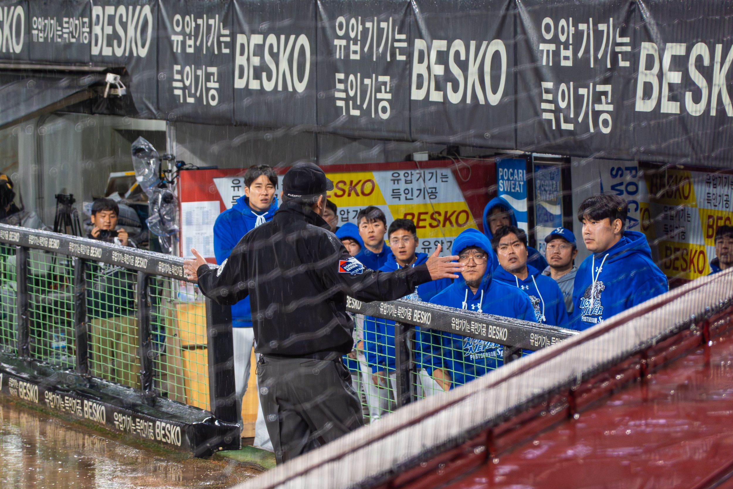 세 차례나 대형 방수포를 깔았다 걷는 우여곡절 속에 개막 행사가 모두 끝나고 오후 7시 36분이 돼서야 KIA 선발 제임스 네일의 초구를 볼 수 있었지만 빗줄기는 멈출 생각을 안 하고 다시 굵어지기 시작했습니다.