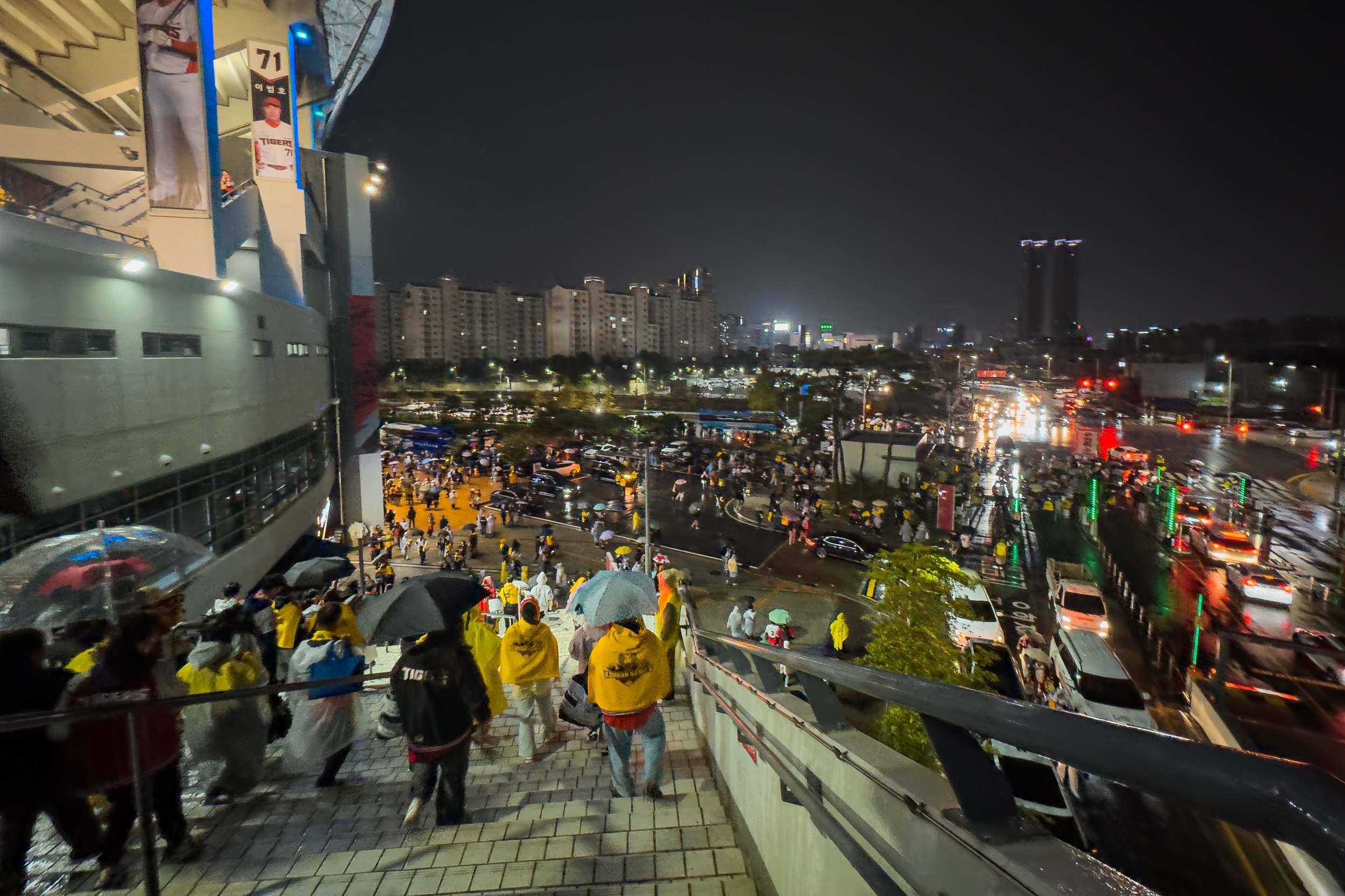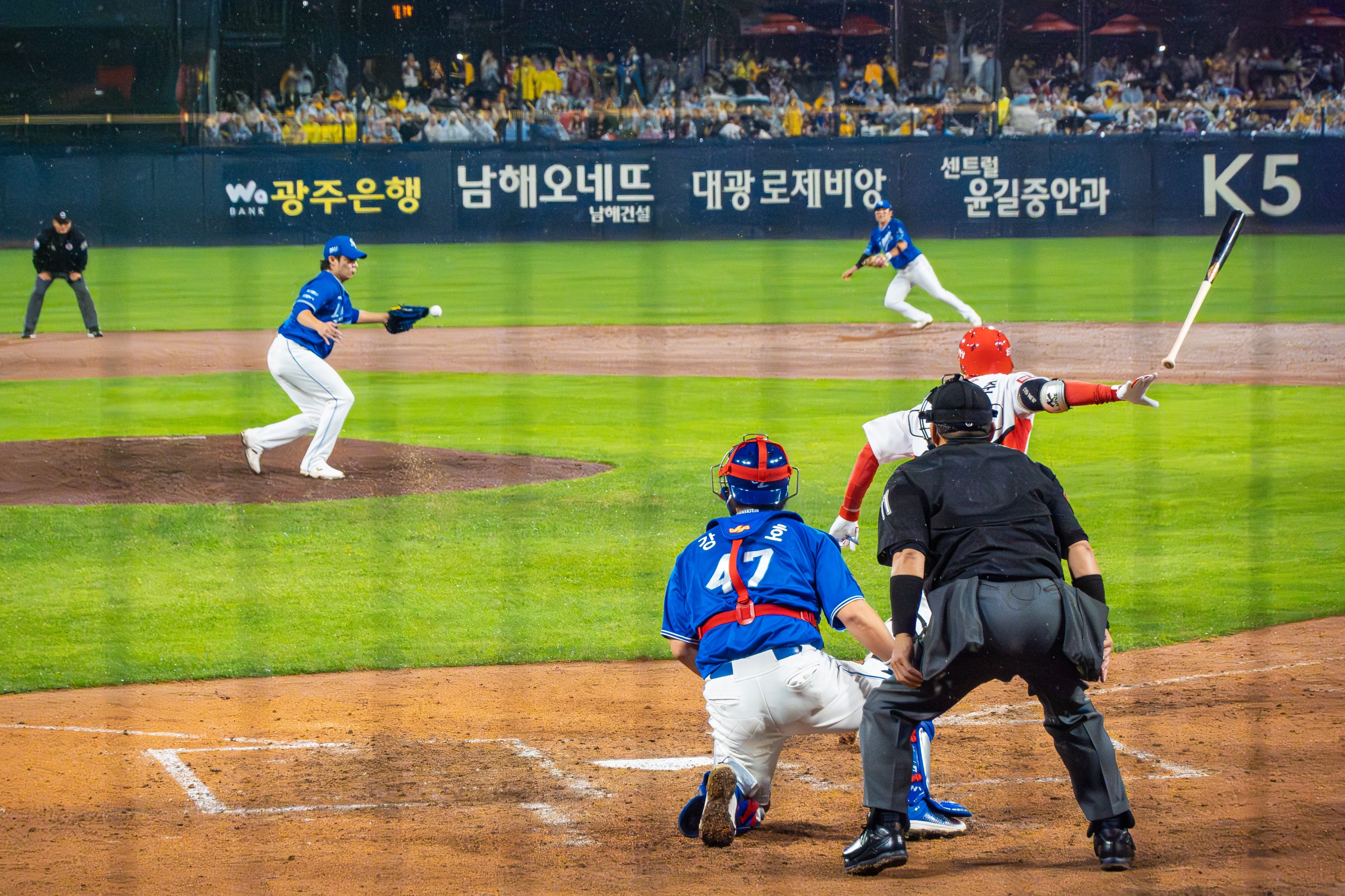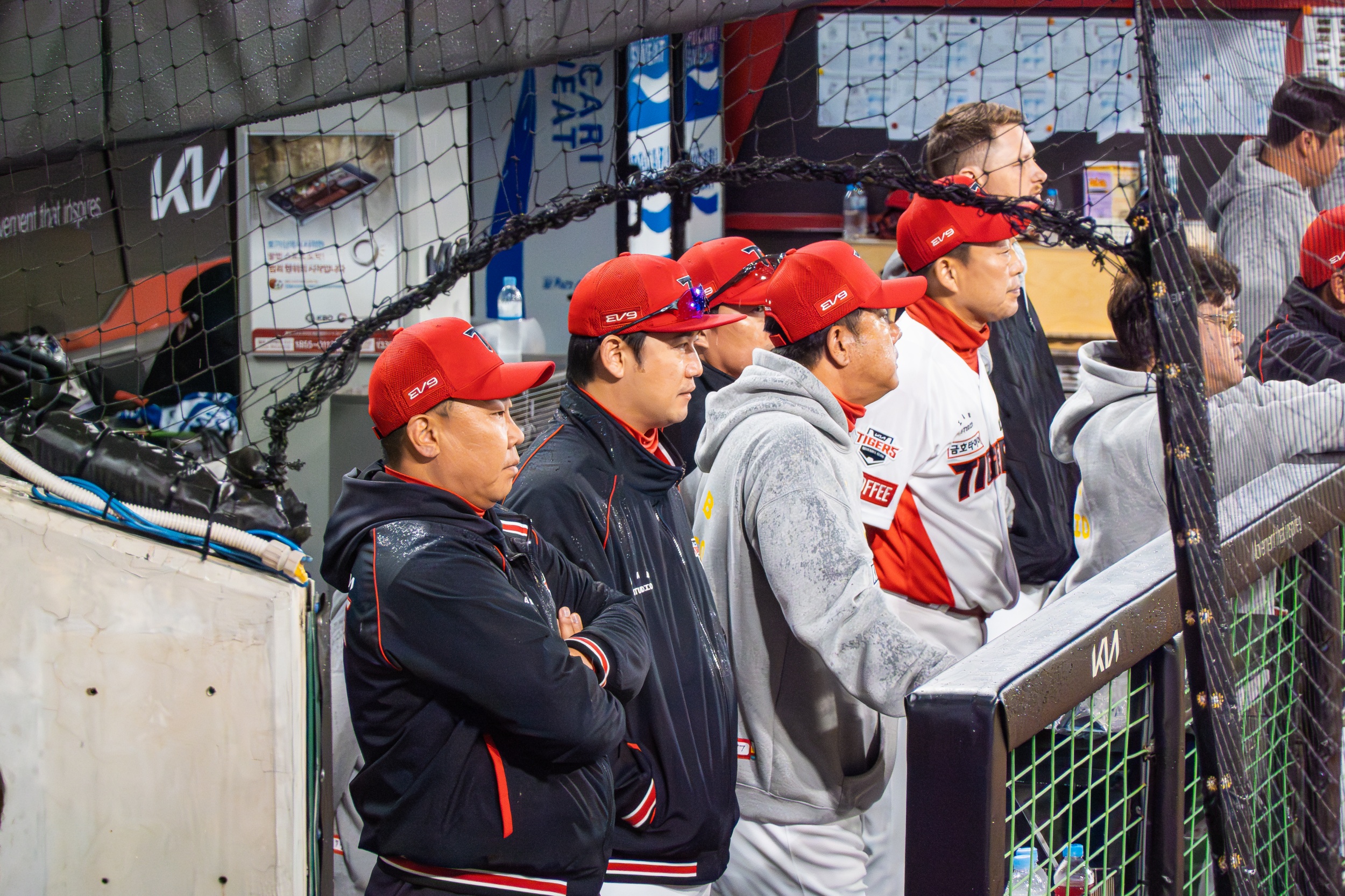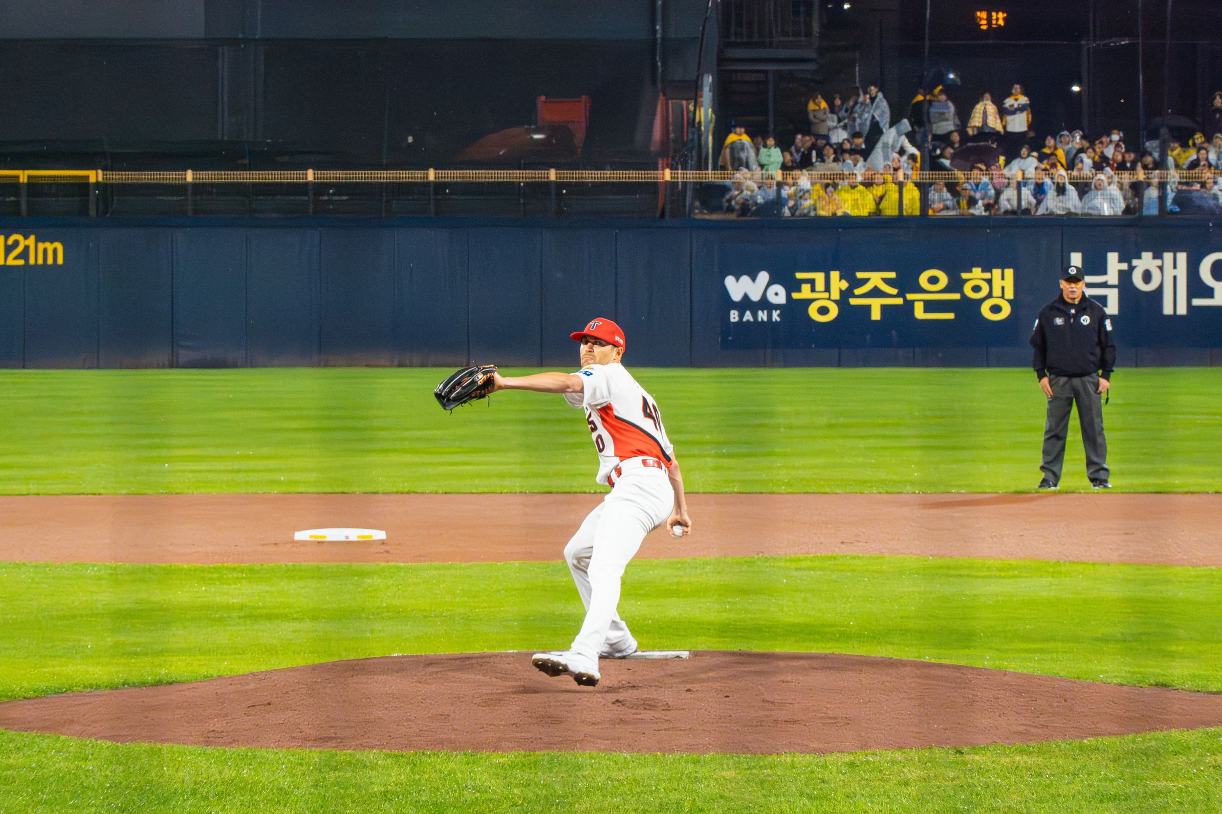세 차례나 대형 방수포를 깔았다 걷는 우여곡절 속에 개막 행사가 모두 끝나고 오후 7시 36분이 돼서야 KIA 선발 제임스 네일의 초구를 볼 수 있었지만 빗줄기는 멈출 생각을 안 하고 다시 굵어지기 시작했습니다.