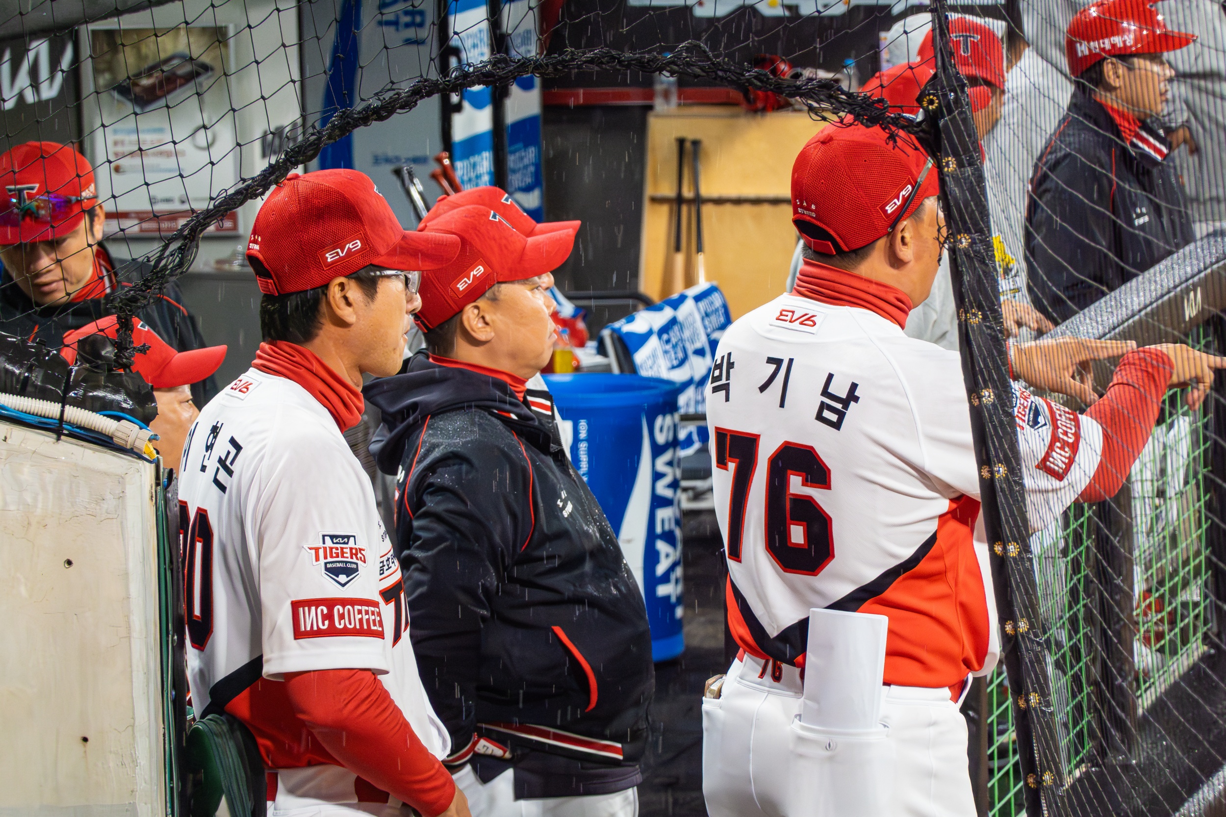 세 차례나 대형 방수포를 깔았다 걷는 우여곡절 속에 개막 행사가 모두 끝나고 오후 7시 36분이 돼서야 KIA 선발 제임스 네일의 초구를 볼 수 있었지만 빗줄기는 멈출 생각을 안 하고 다시 굵어지기 시작했습니다.