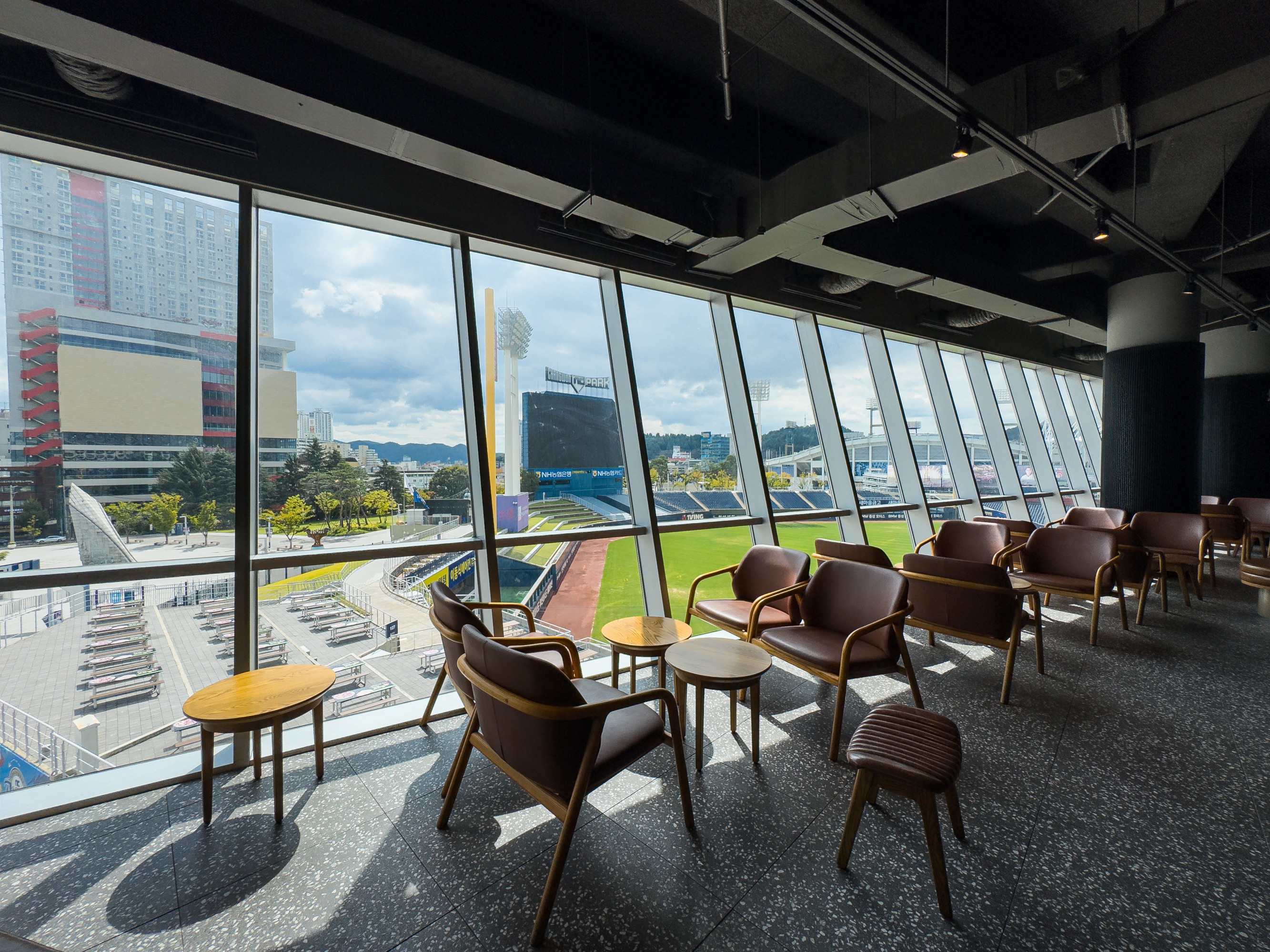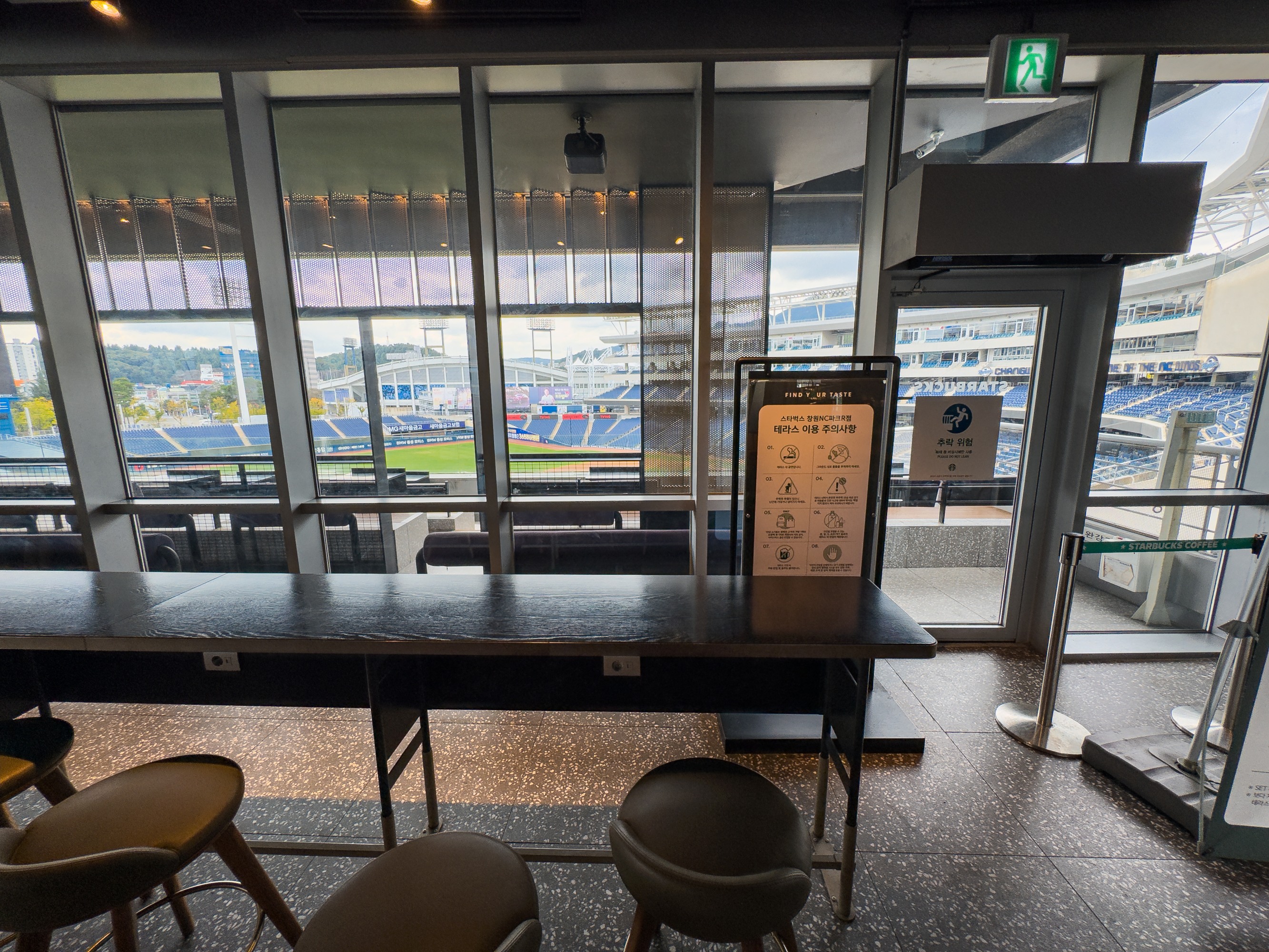 스타벅스 리저브 매장 안으로 들어가면 테라스 관람석에서 보는 웅장한 야구장 뷰가 펼쳐집니다~. 챔필에는 인크커피 800평규모가 있다면 NC파크는 스타벅스 리저브 매장의 테라스 관람석과 별다방 라거의 매력이 있습니다.