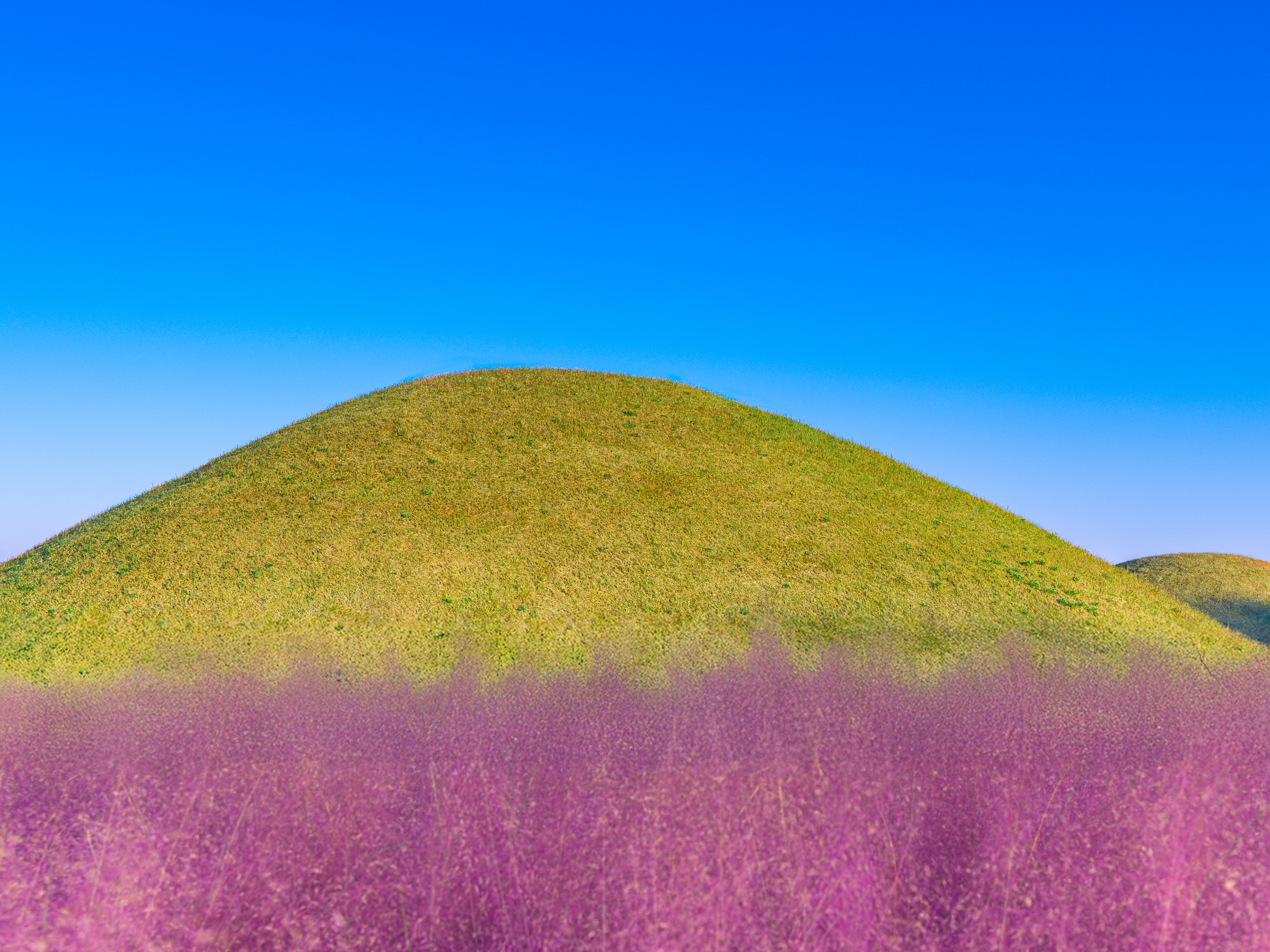 눈부신 하늘 아래, 고요히 숨 쉬는 초록 언덕이 펼쳐집니다.